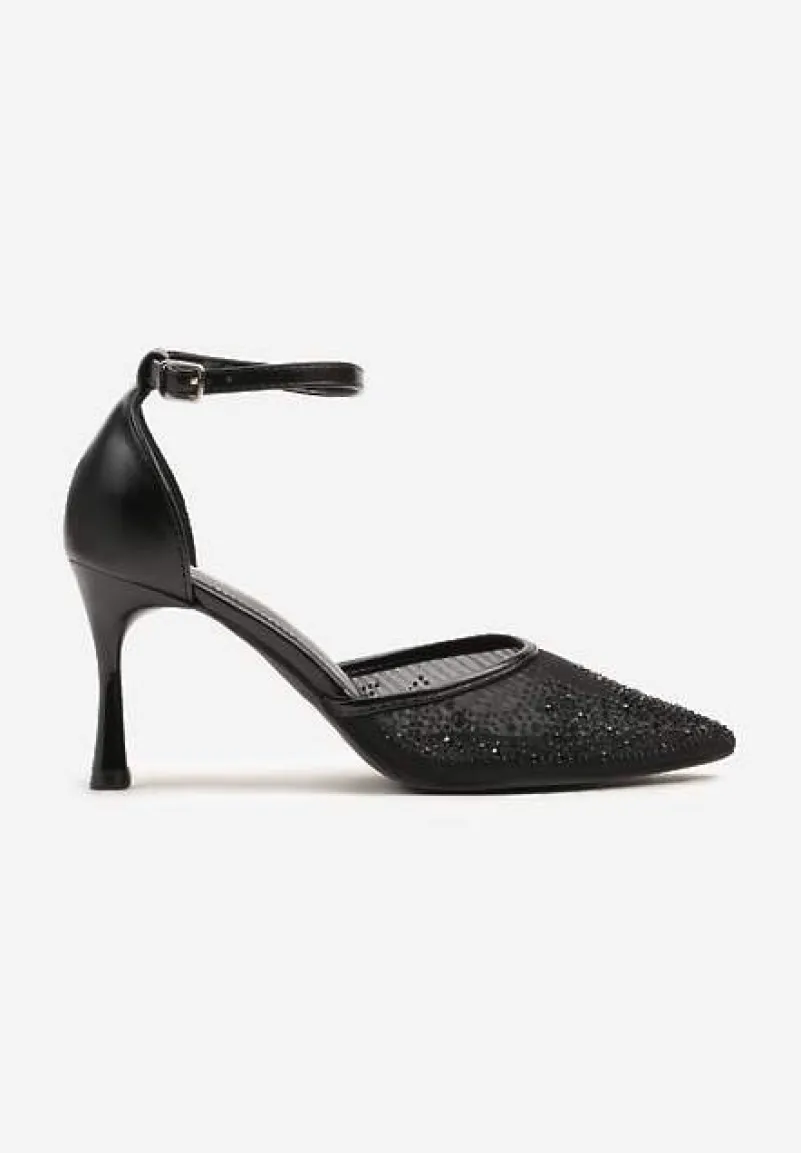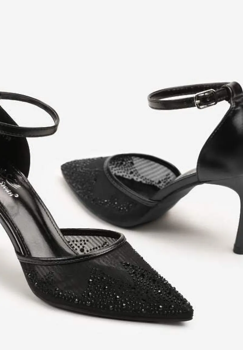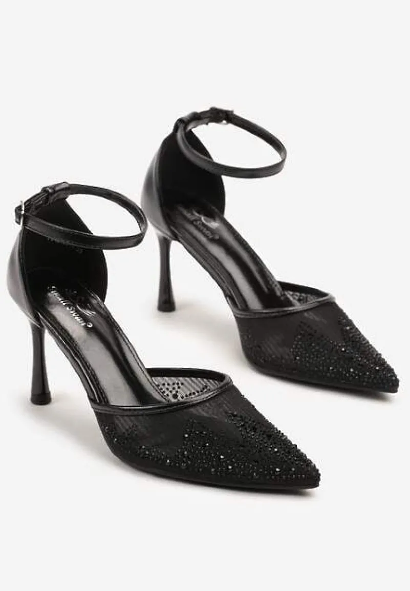 Czarne Sandały Szpilki z Siateczkowym Noskiem w Szpic Zdobionym Cyrkoniami Alirenda