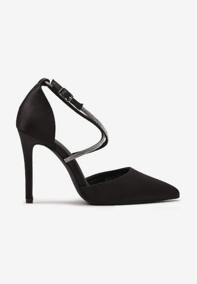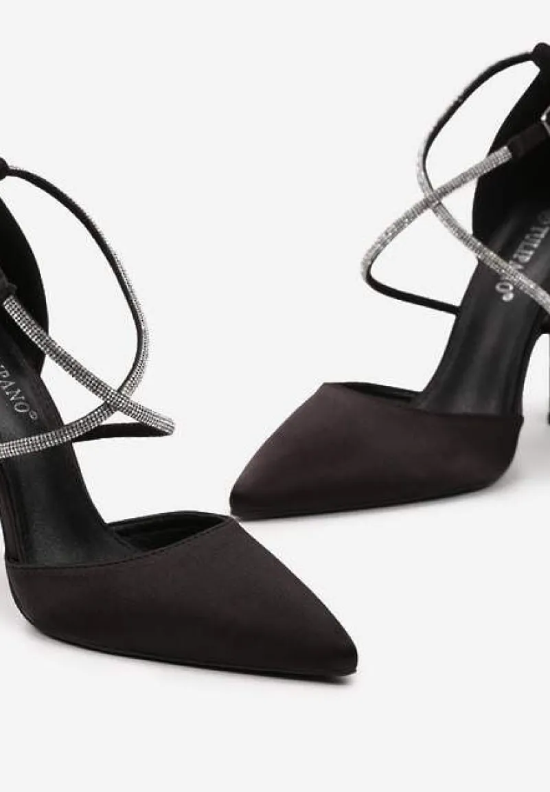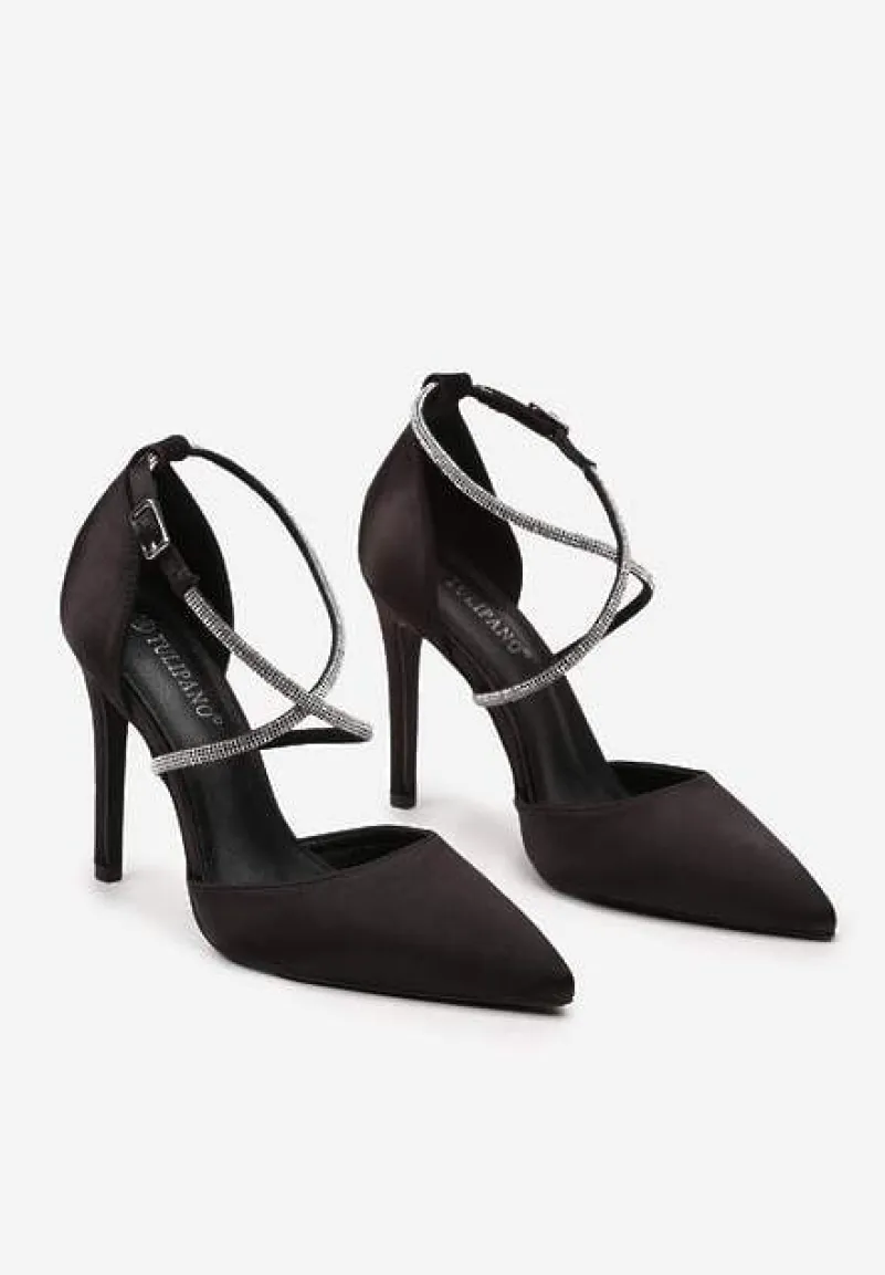 Satynowe czółenka na wysokiej szpilce z cienkimi paseczkami, które zostały udekorowane cyrkoniami. Będą doskonałe do koktajlowych sukienek.