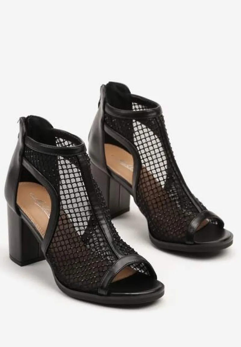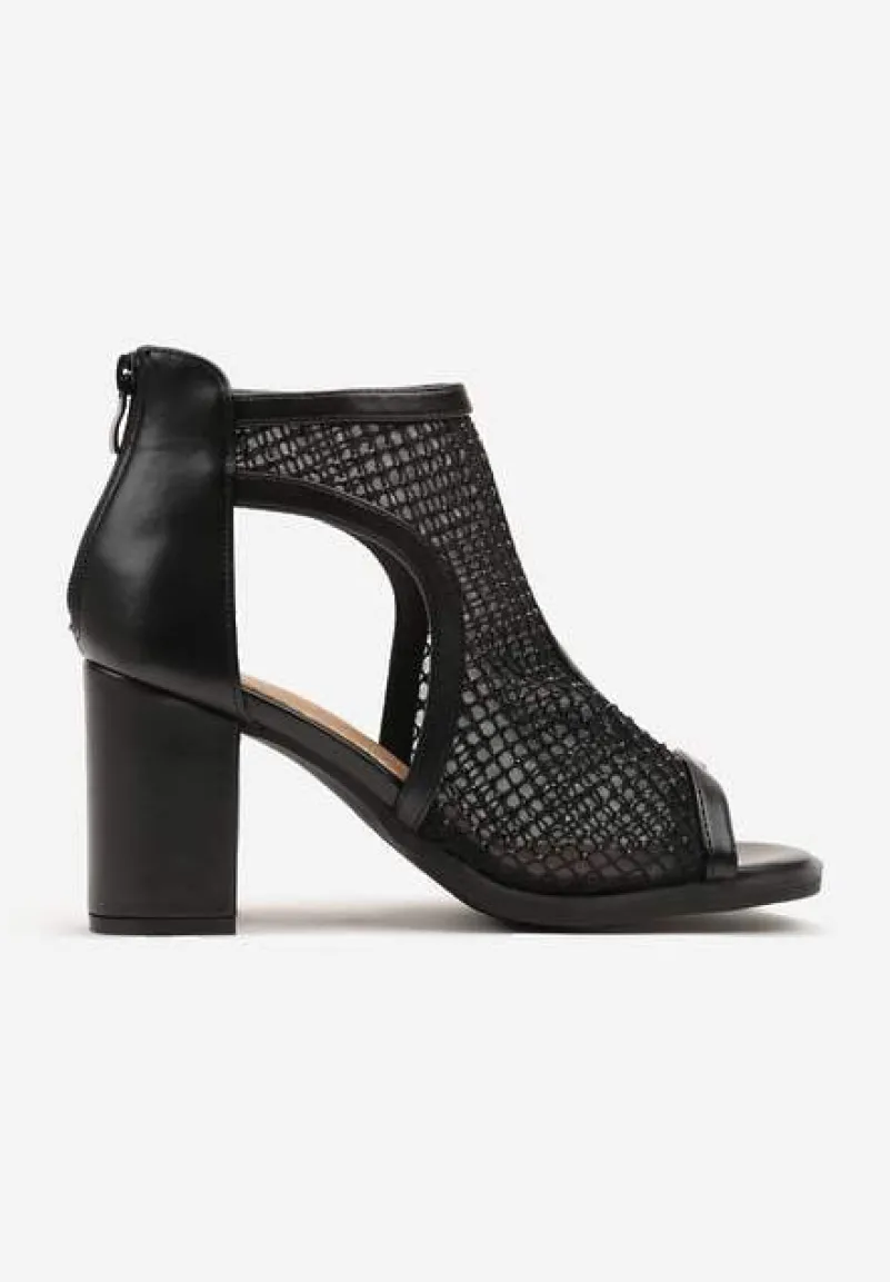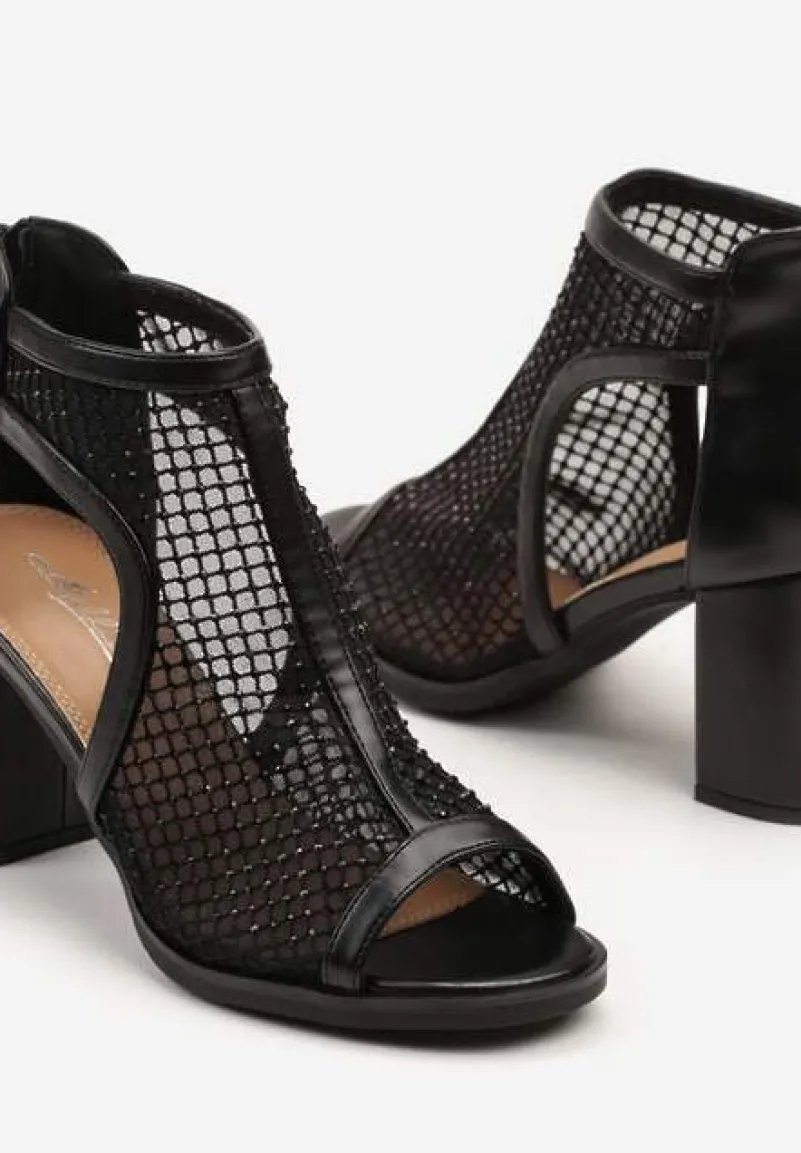 Czarne Siateczkowe Sandały Stylizowane na Botki na Obcasie z Cyrkoniami Senarila