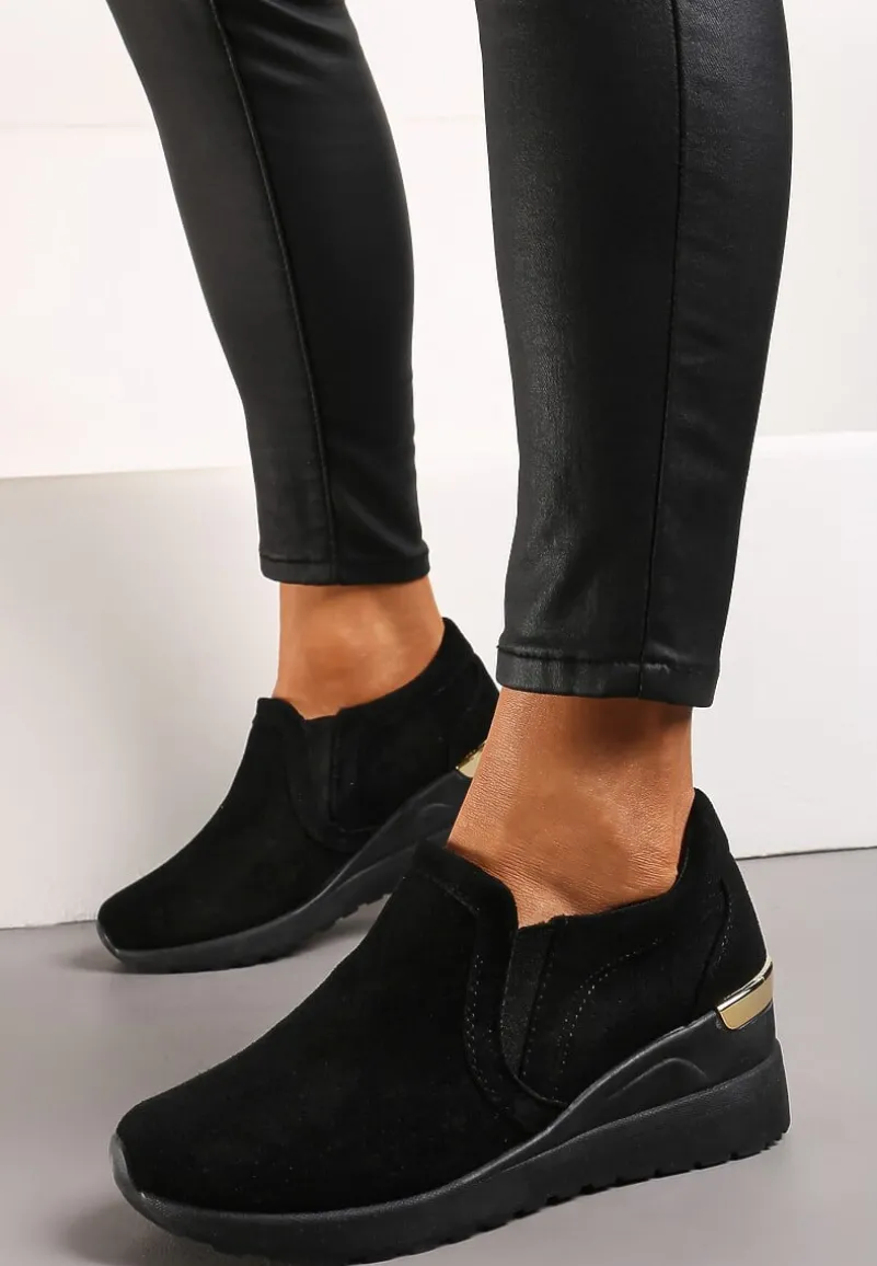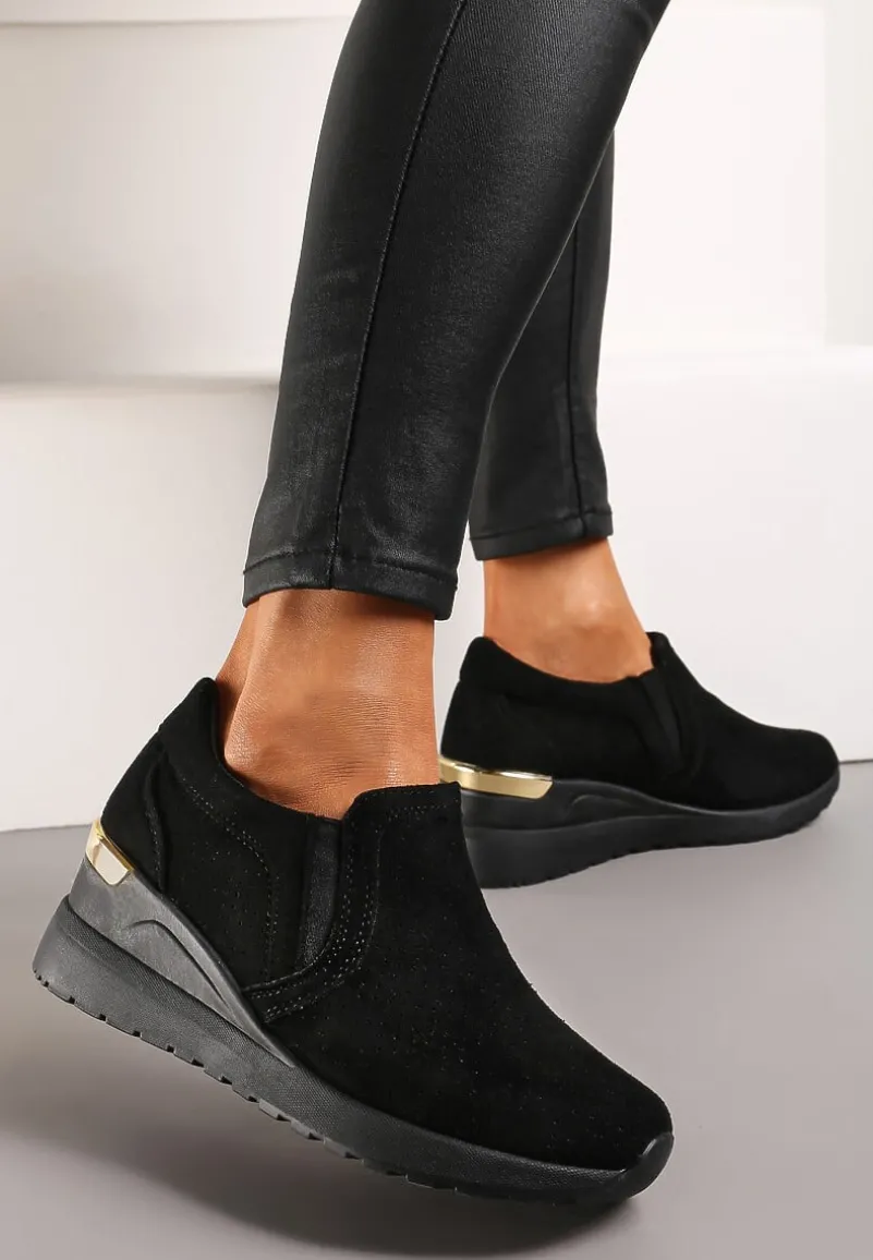 Sneakersy Munna to niezastąpiony must-have w szafie każdej trendsetterki na każdą okazję! Koturn zapewnia stylowy wygląd i komfort noszenia, natomiast subtelne metalowe zdobienie na pięcie dodaje butom eleganckiego sznytu. Zaokrąglony nosek harmonijnie współgra z materiałem imitującym zamsz, a wsuwany fason ułatwia zakładanie. Podkreśl swój miejski styl, łącząc je z oversize’ową ramoneską i jeansami lub dodaj szyku eleganckim stylizacjom z dopasowaną sukienką i trenczem.