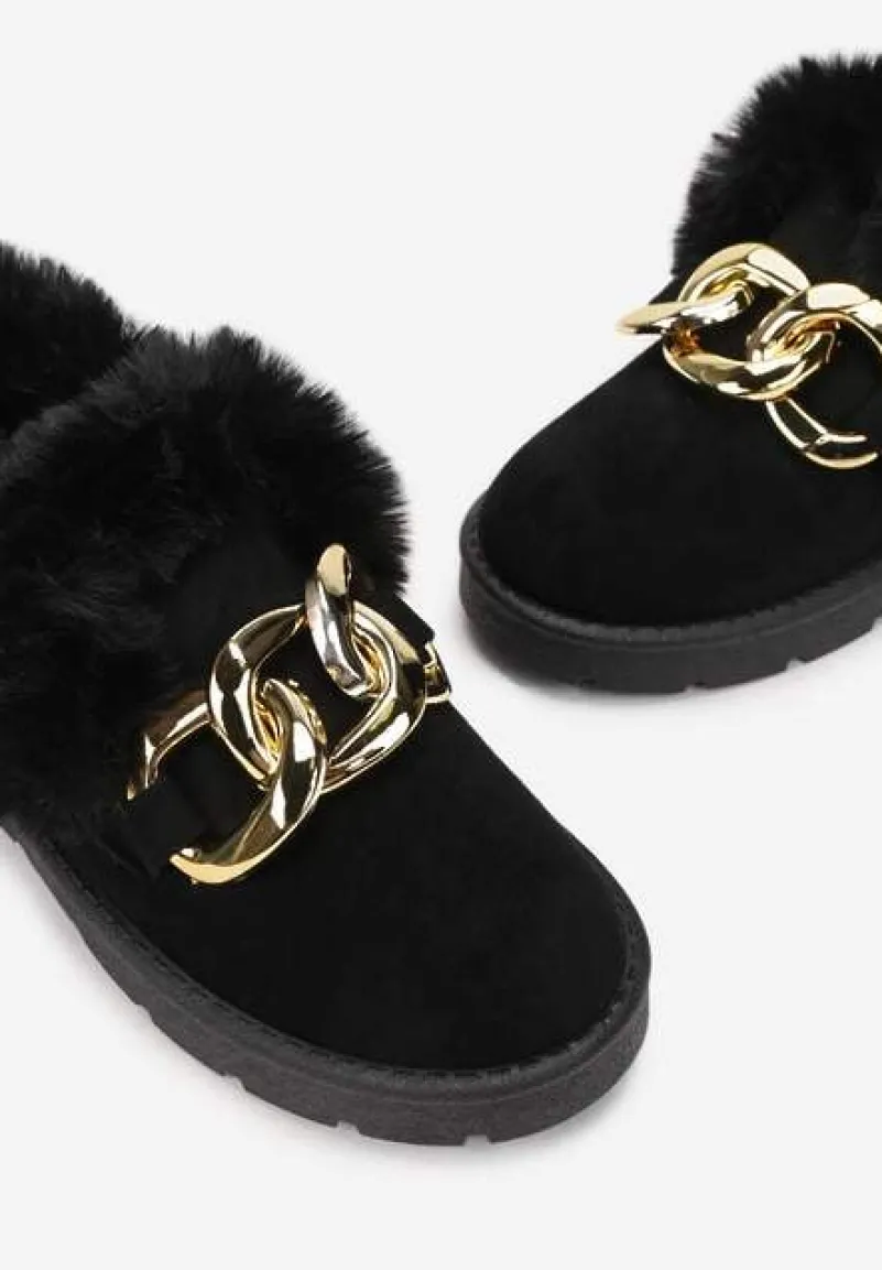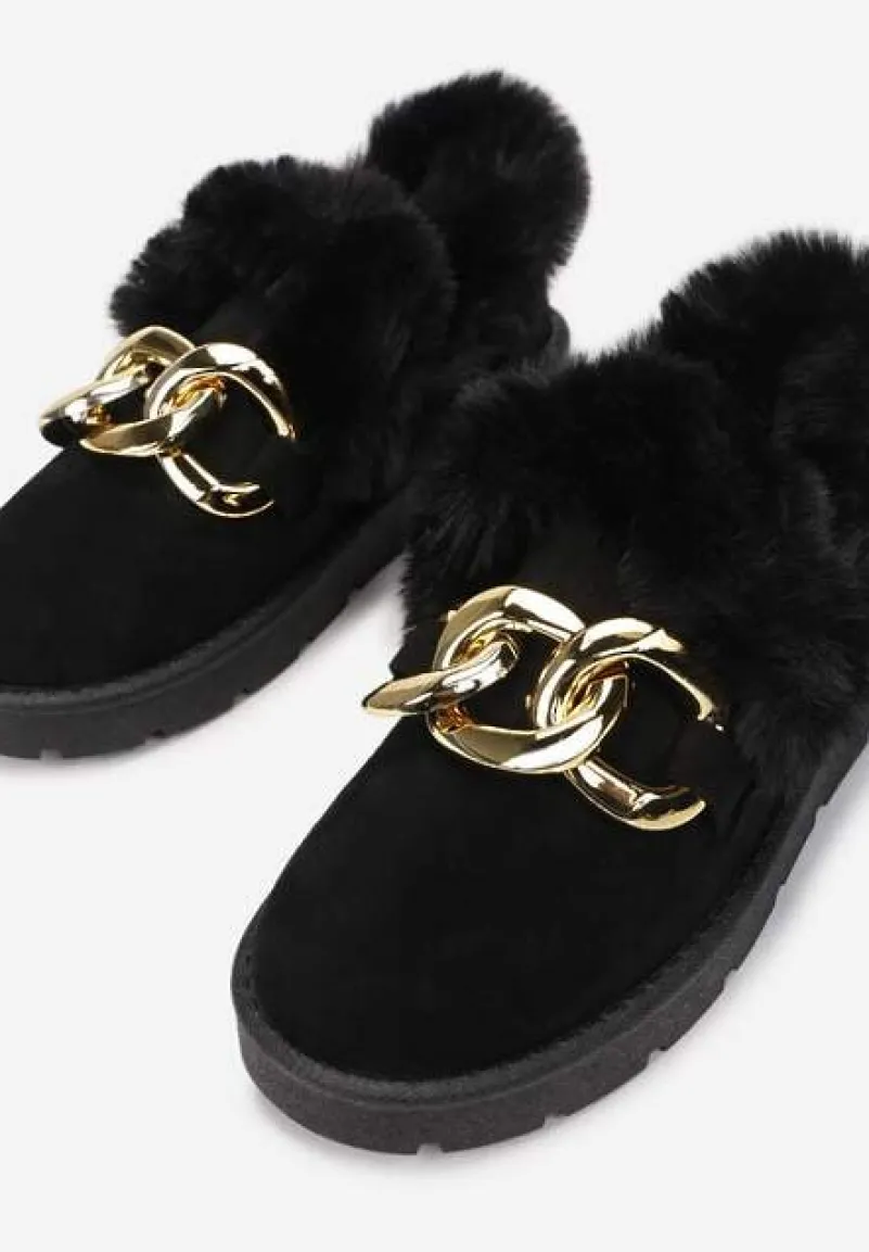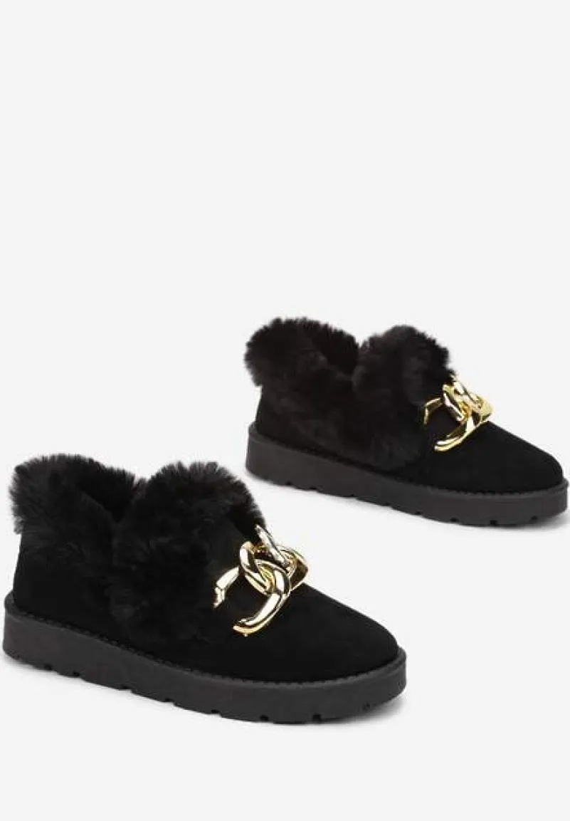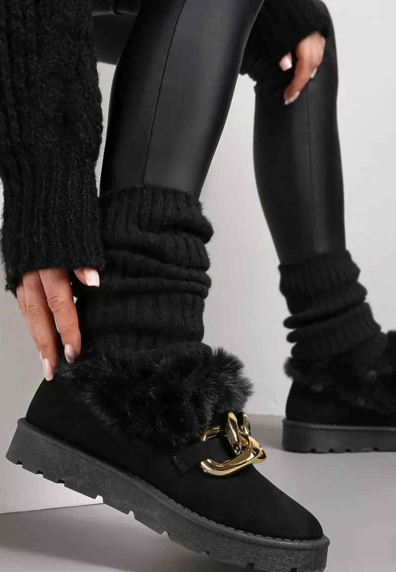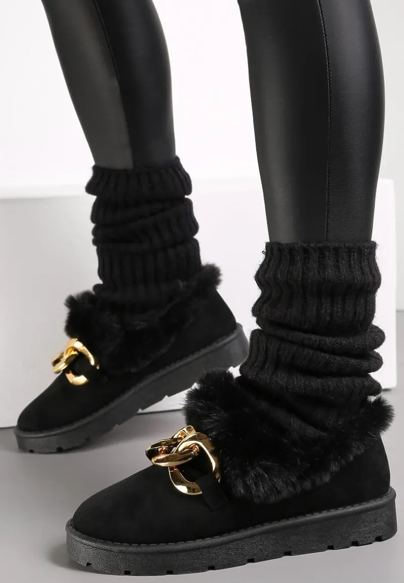 Śniegowce Erele na grubej, płaskiej podeszwie z protektorem pod spodem. Cholewka przed kostkę, nosek okrągły. Wsuwane, udekorowane imitacją futerka dookoła w górnej części cholewki. Z przodu znajduje się modny łańcuch w złotym kolorze. Wykonane z ekozamszu, mocno ocieplane od środka imitacją futra. Polecamy wybór rozmiaru o 1 większego. Noś je np. z jeansami z dopasowaną nogawką i futrzaną kurtką.