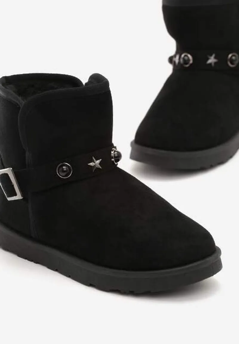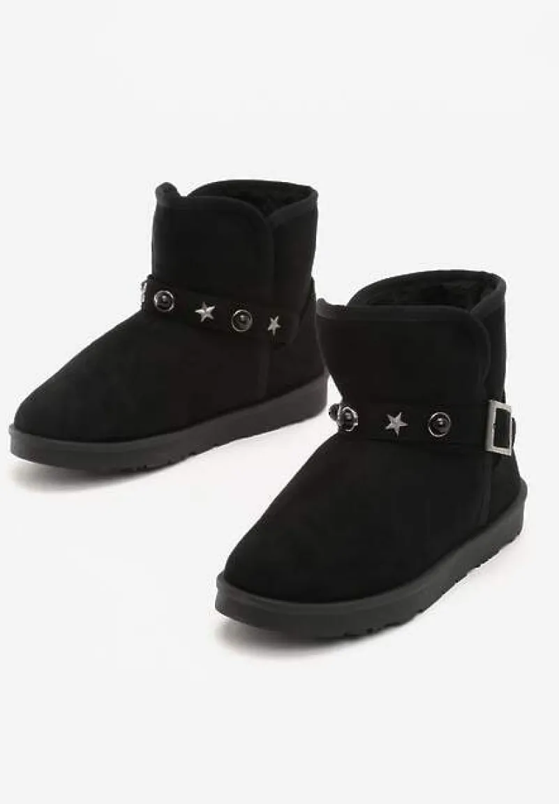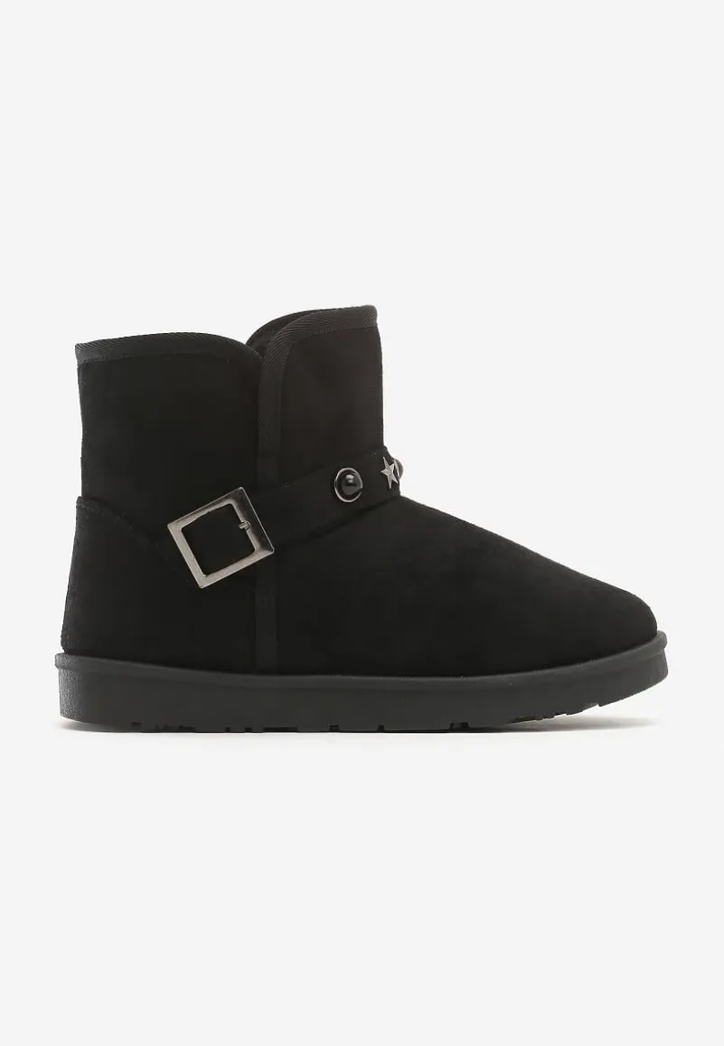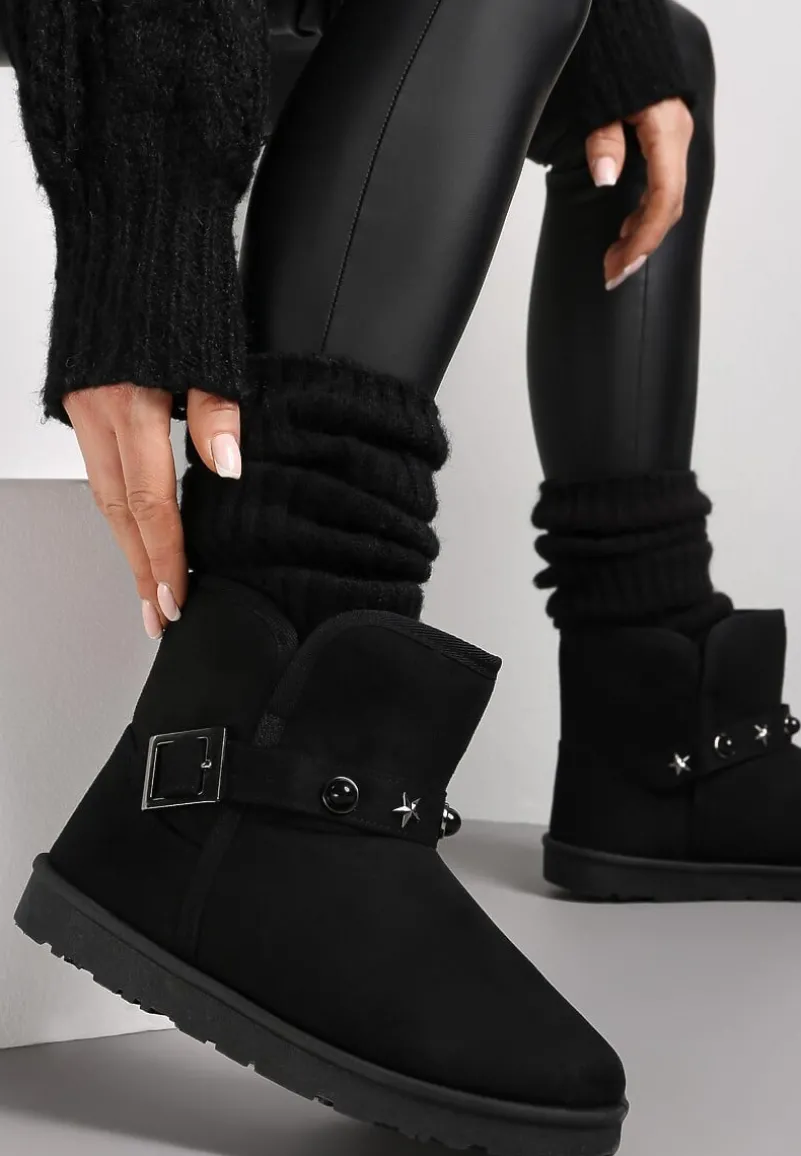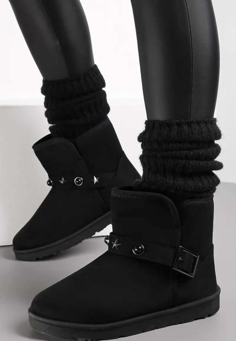 Śniegowce Merriman na płaskiej, jednokolorowej podeszwie z protektorem, z gumowego tworzywa. Wsuwane, z lamówką przy cholewce przed kostkę. Udekorowane paskiem z klamrą i ćwiekami o różnych kształtach. Ocieplone od wewnątrz materiałem imitującym futerko. Szukasz maksymalnie komfortowych śniegowców, w których poczujesz się wygodnie jak w kapciach? Postaw na model Tallbrook!