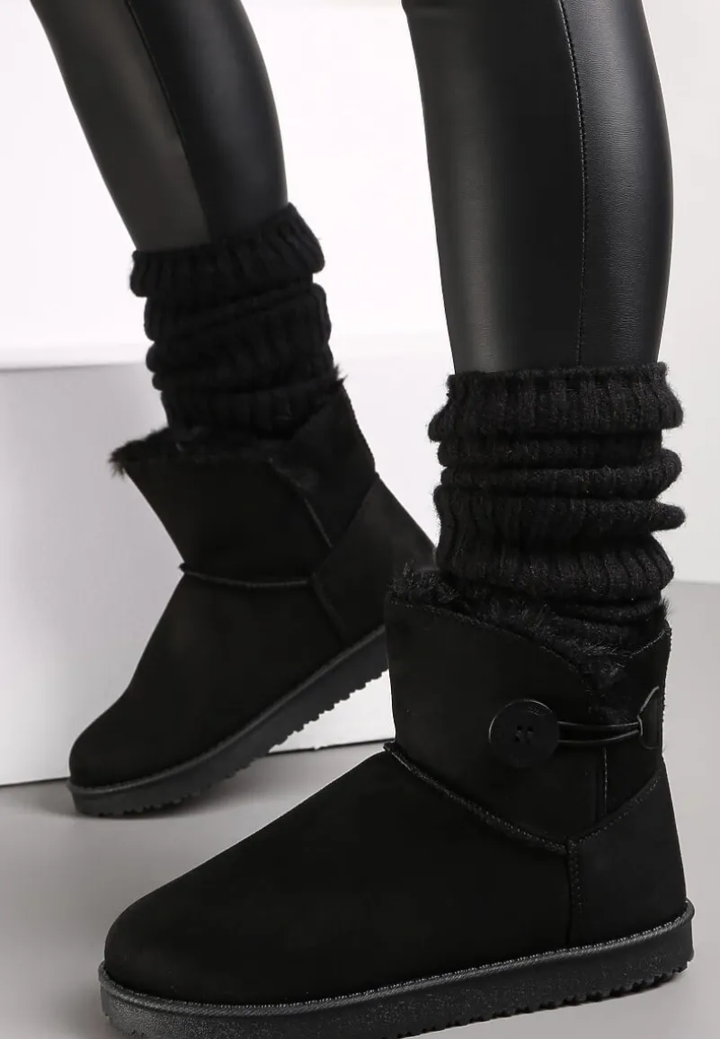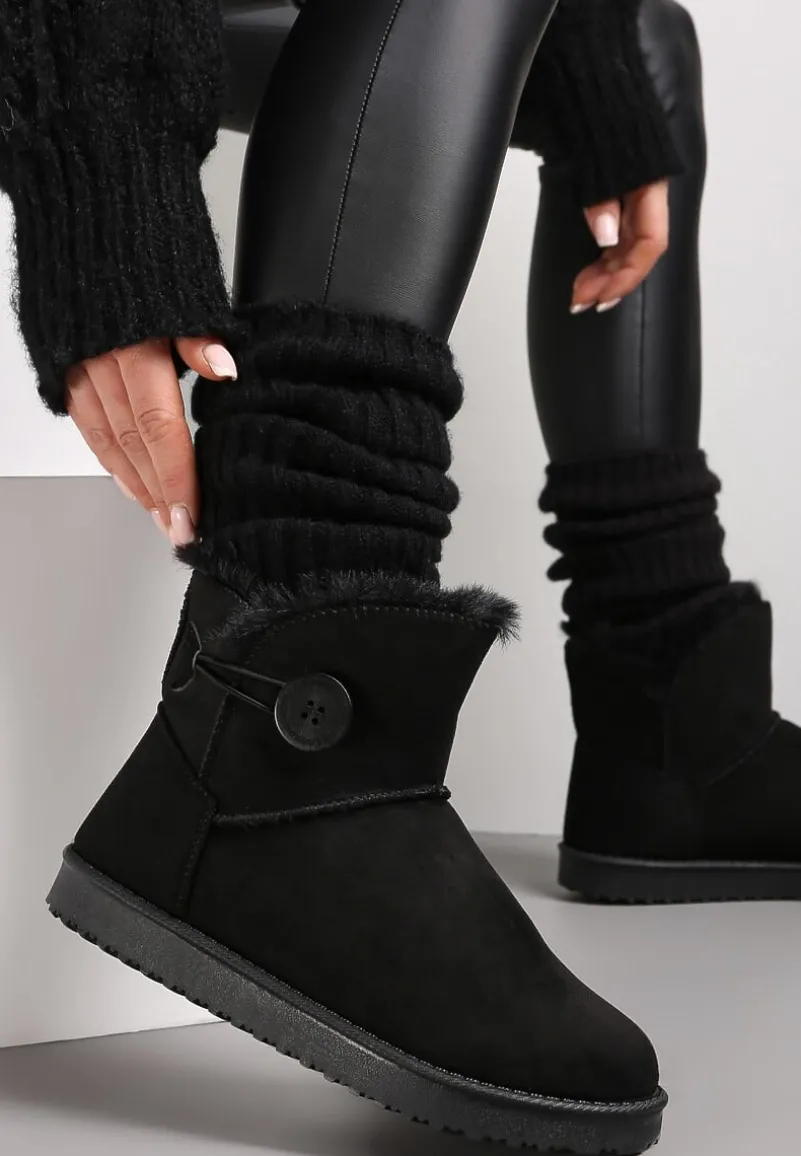 Śniegowce Chalfi mocno ocieplone sztucznym futerkiem. Na grubej podeszwie z drobnym bieżnikiem. Z boku cholewki guzik i elastyczna, cienka gumka. Okrągłe noski. Wykonane z ekozamszu. Będą doskonale pasować do kurtki parku lub pikowanej kurtki puffer.
