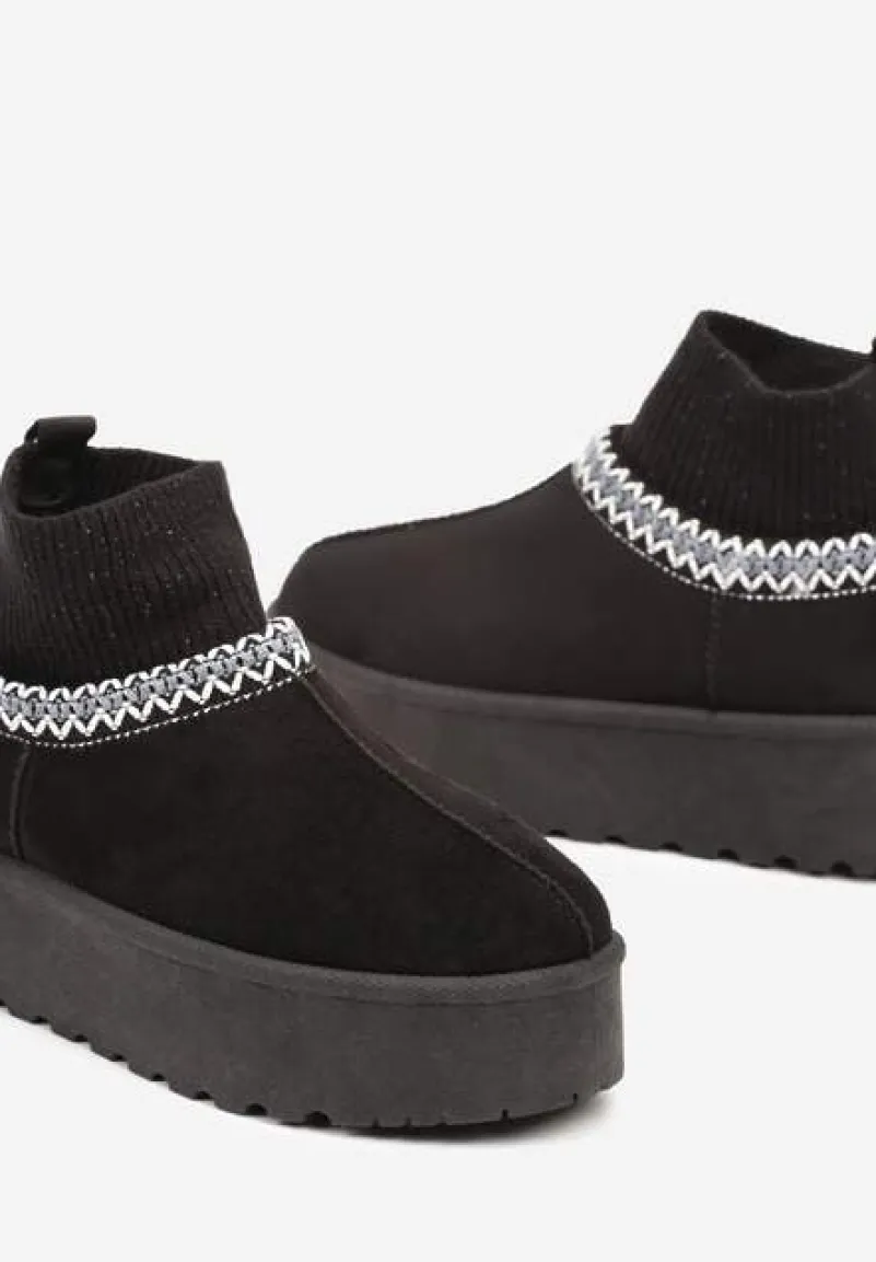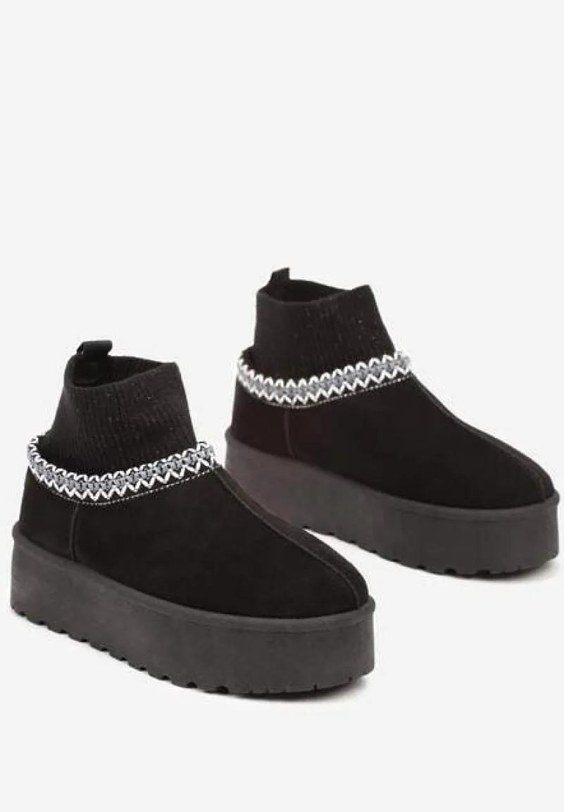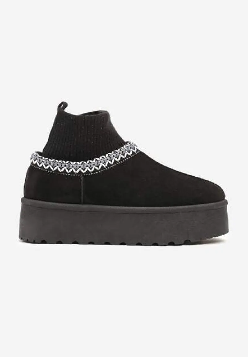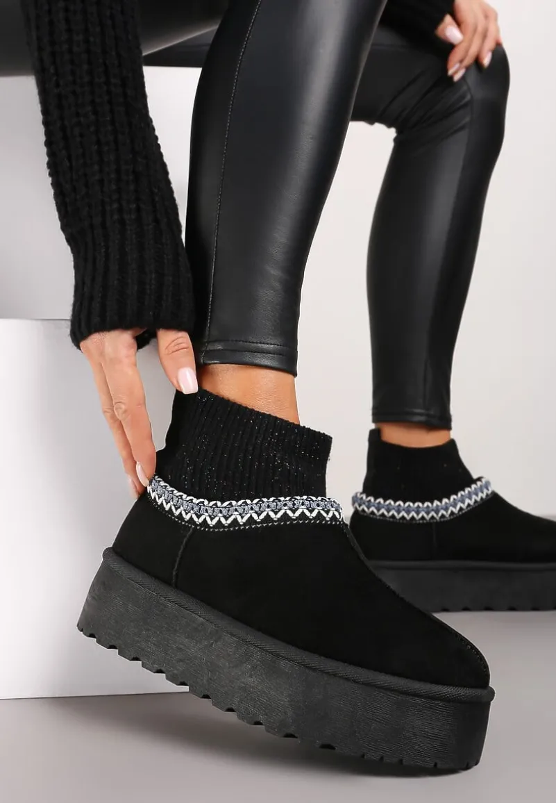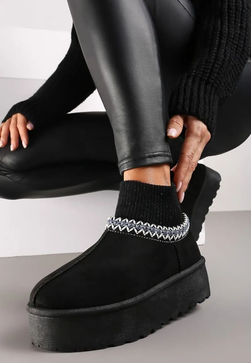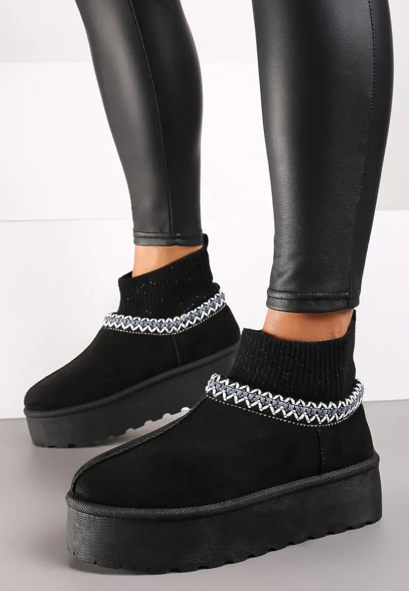 Stylowe śniegowce Sinirae na koturnie ze skarpetkową cholewką obszytą metaliczną nicią to idealny wybór dla miłośniczek miejskiej mody. Wyraźnie zaznaczone platformy stanowią pewną podstawę. Cholewka zakończona skarpetowym mankietem dodaje współczesnego charakteru, a subtelne metaliczne zdobienia przyciągają spojrzenia. Te buty świetnie uzupełnią codzienny, miejski outfit – połącz je z oversizowym płaszczem i jeansami dla nieformalnego wyglądu lub z tylna spódnicą i dopasowaną górą na mniej zobowiązujące okazje.