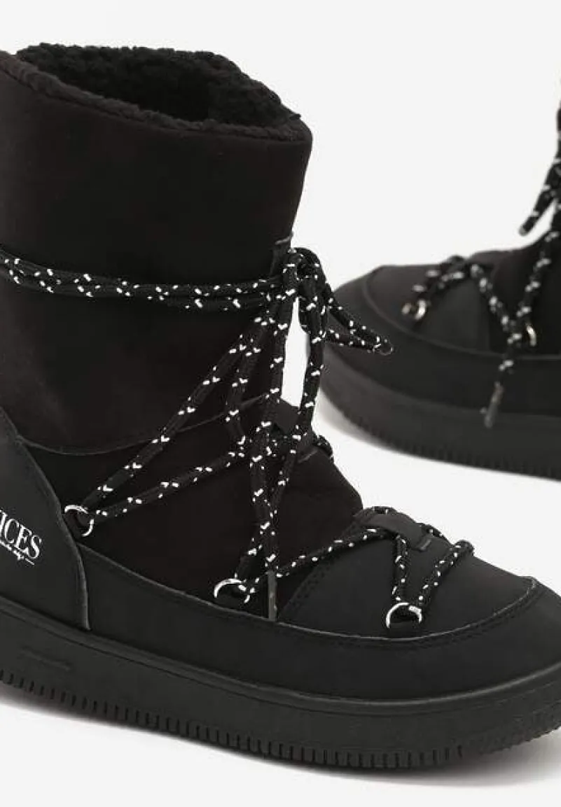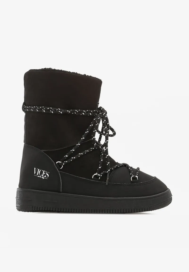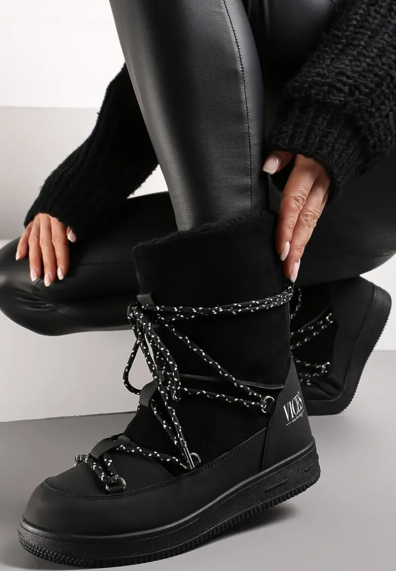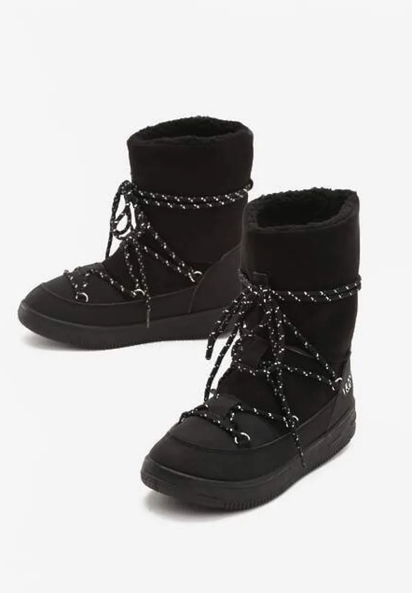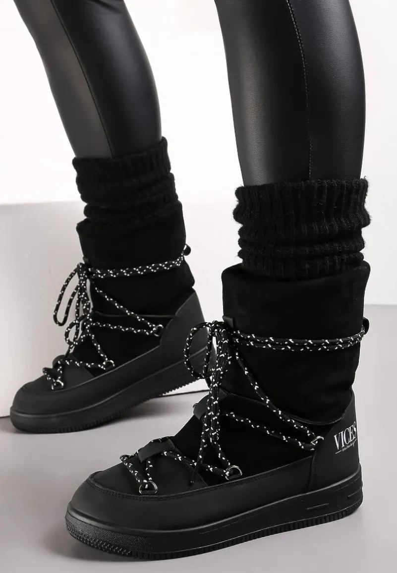 Śniegowce Night Magic na grubej podeszwie, wsuwane. Wysoka cholewka, wokół przeplatane wiązanie. Wykonane z nubuku syntetycznego i materiału tekstylnego. Ocieplane imitacją futerka. To fason typu mukluki zainspirowany sportowym stylem! Sugerujemy wybór większego rozmiaru.