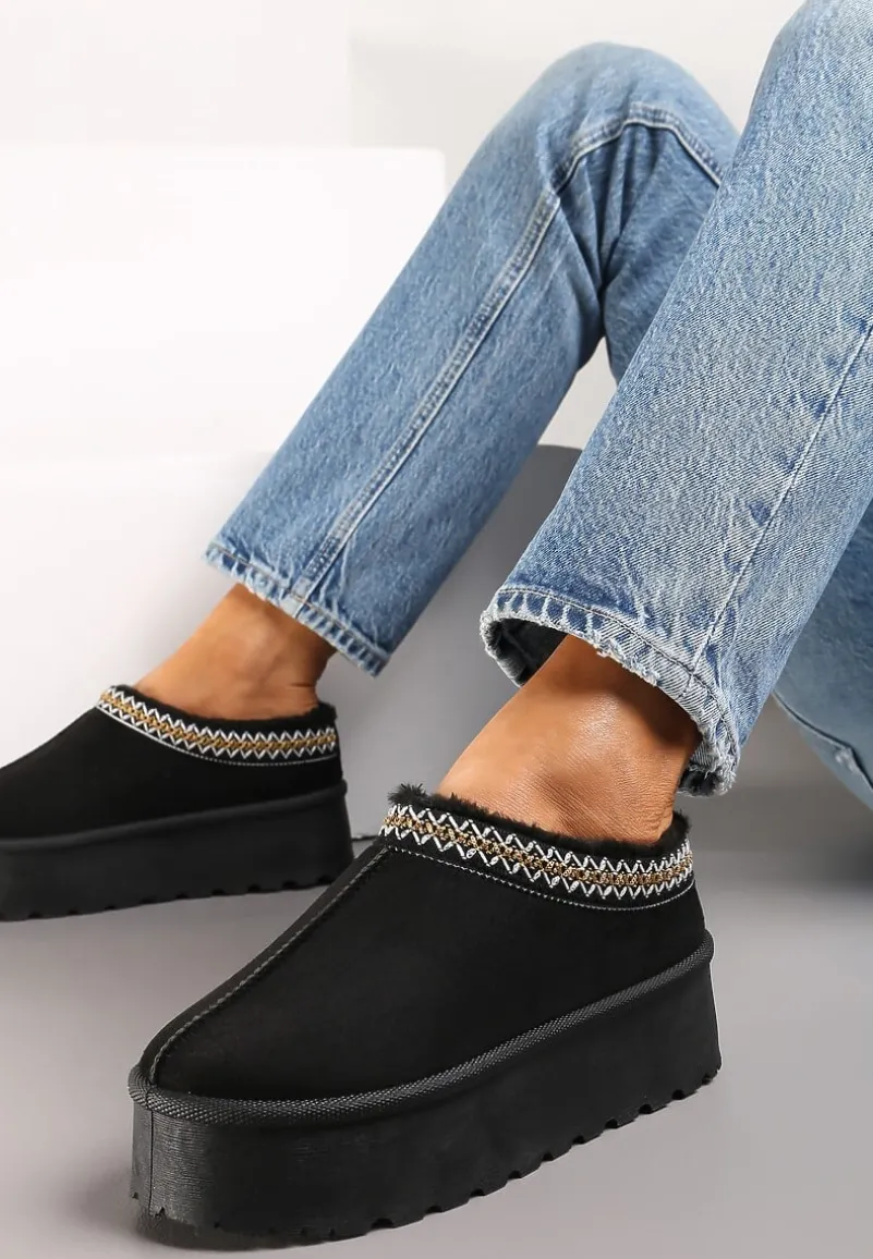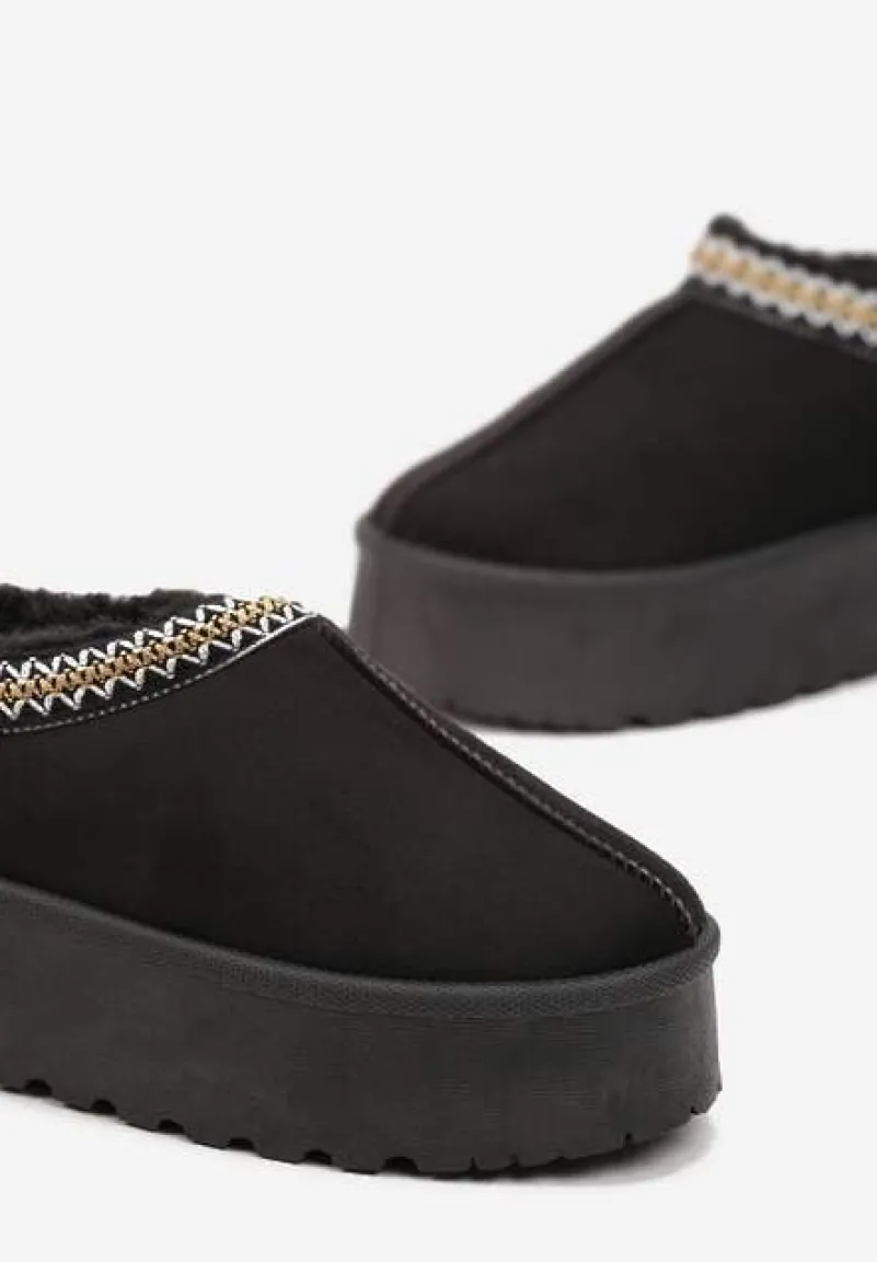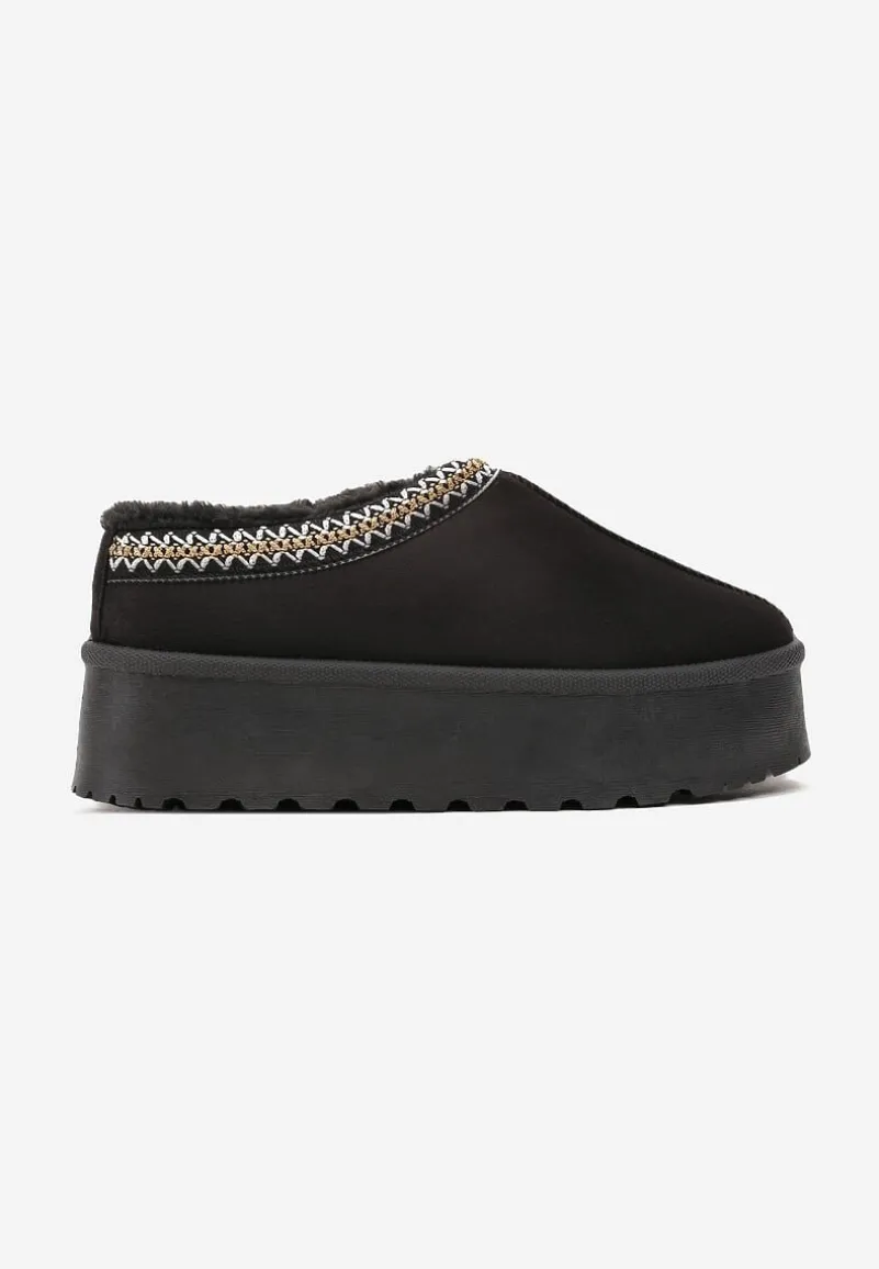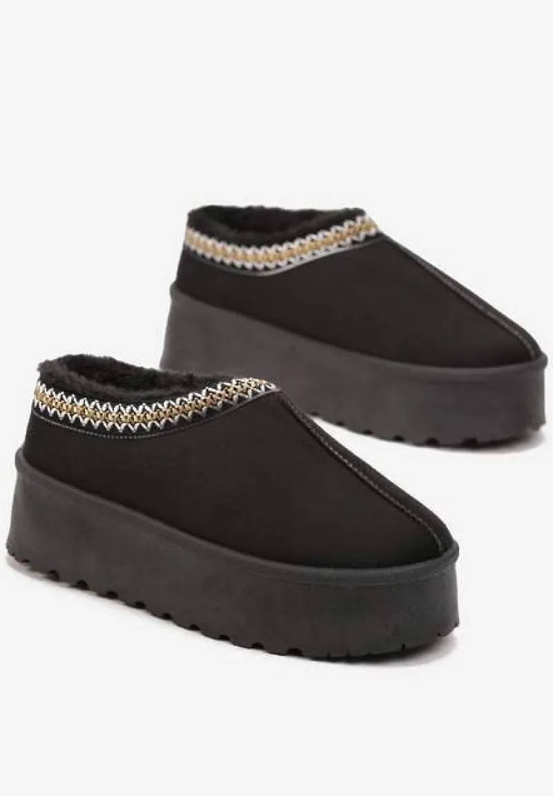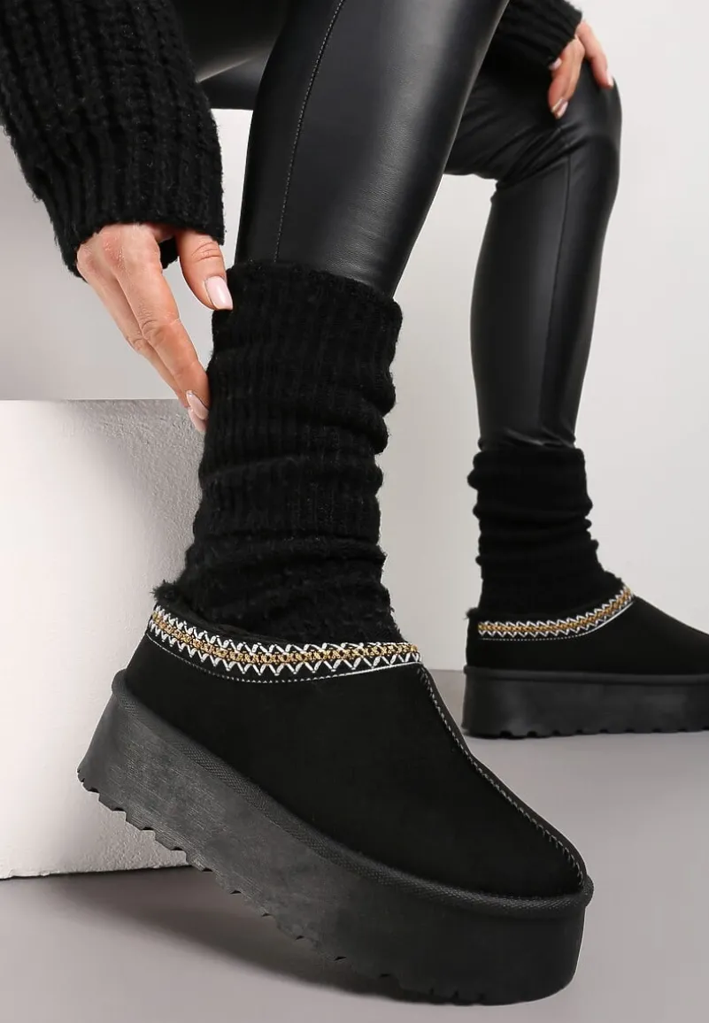 Śniegowce Meliria na grubej podeszwie. Wykonane z ekozamszu z ozdobną lamówką w paski. W środku wyścielone miękkim futerkiem. Będą idealnie się komponować w zestawieniu z kardiganem i białymi skarpetkami.