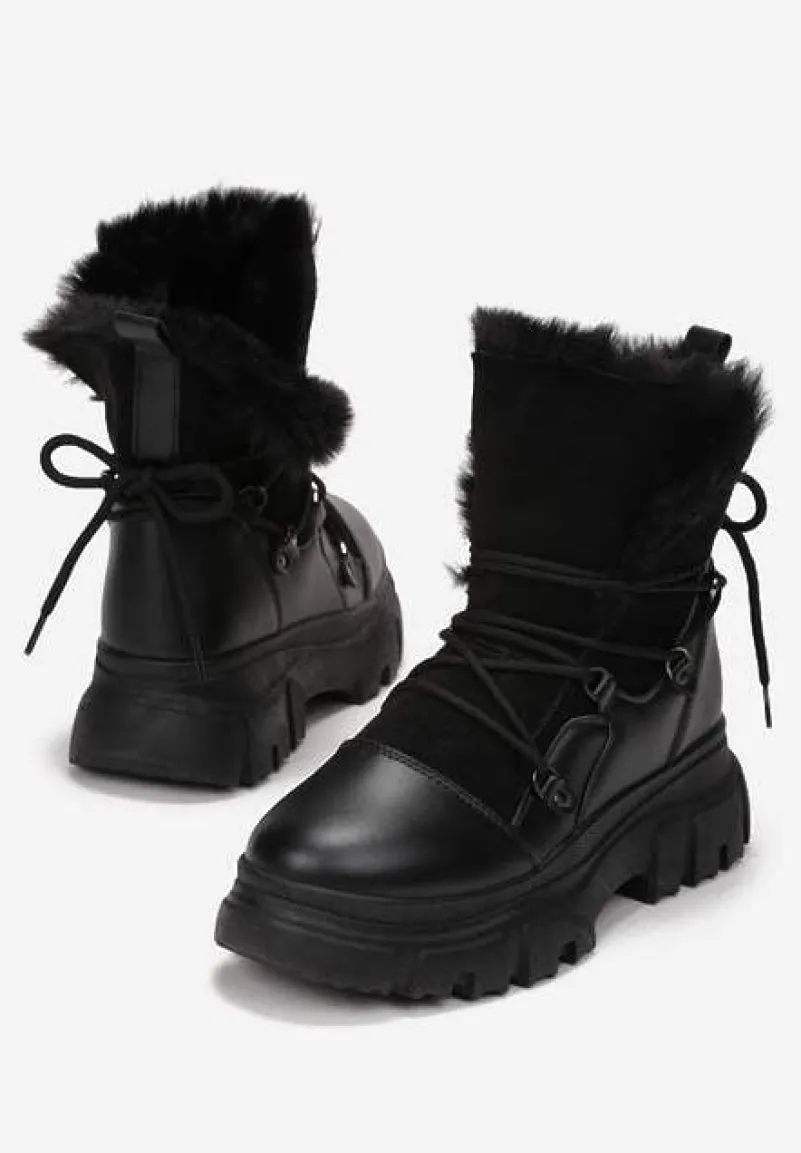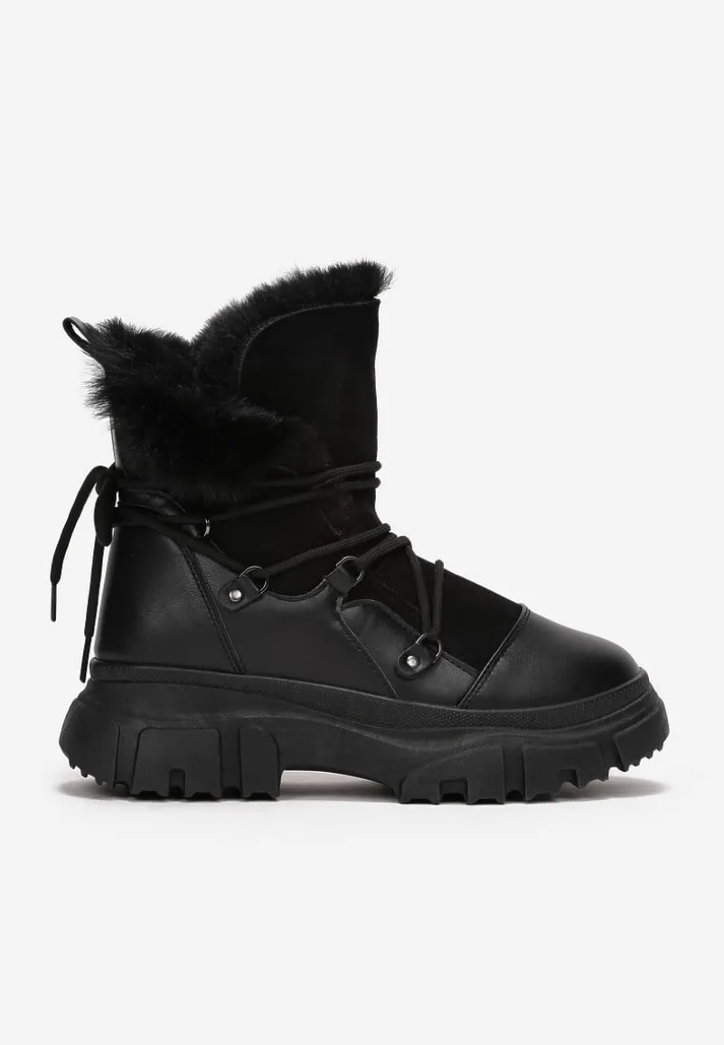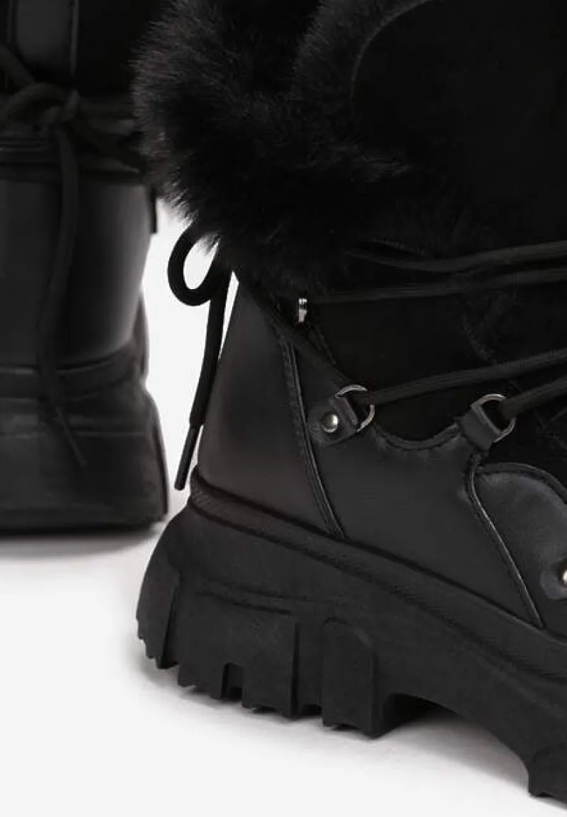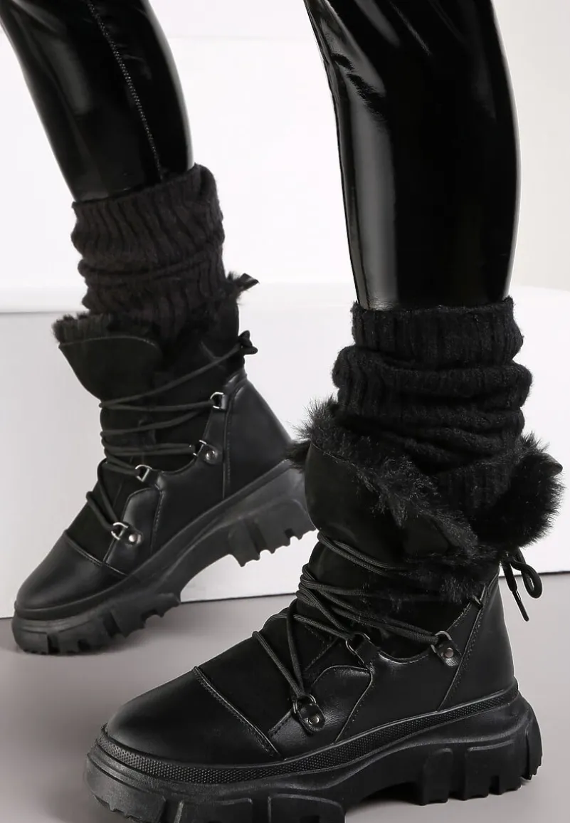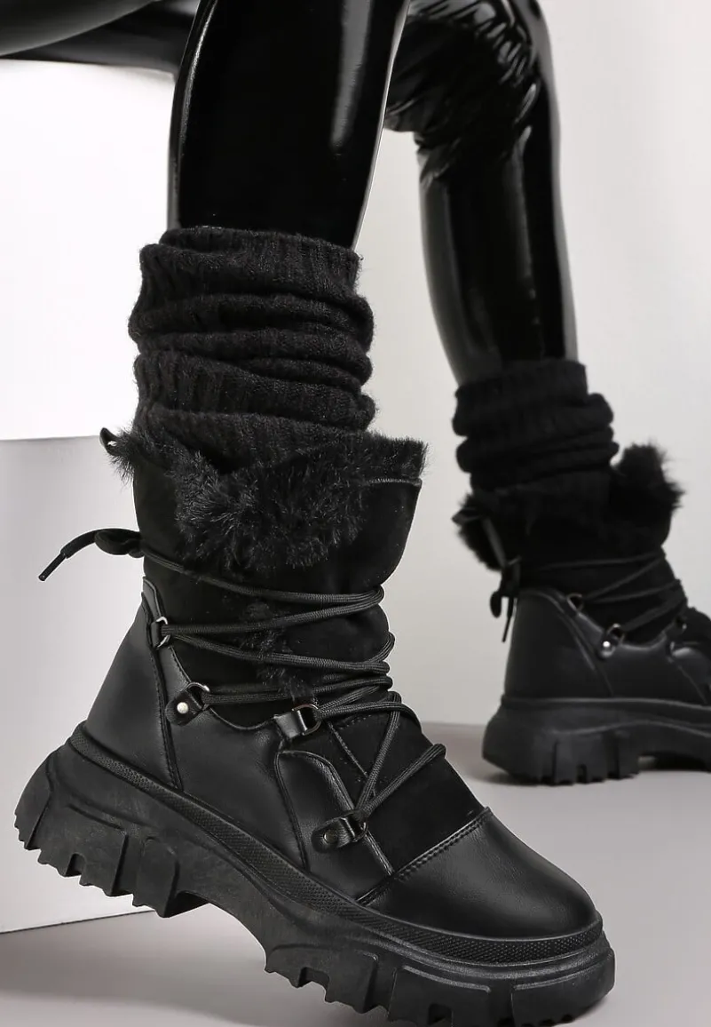 Śniegowce Bavim na platformie z wypustkami i bieżnikiem. Model z wywijaną cholewką za kostkę zdobioną miękkim, sztucznym futerkiem. Zaokrąglone noski i wstawki przy sznurowaniu ze wstawkami z ekoskóry. Sznurowanie długie, możesz je owinąć wokół cholewki na kilka sposobów. Wykonane z ekozamszu, ocieplone sztucznym futerkiem i kocem obuwniczym. Modne śniegowce moon boots z futerkiem wyróżnią zimowe stylizacje.