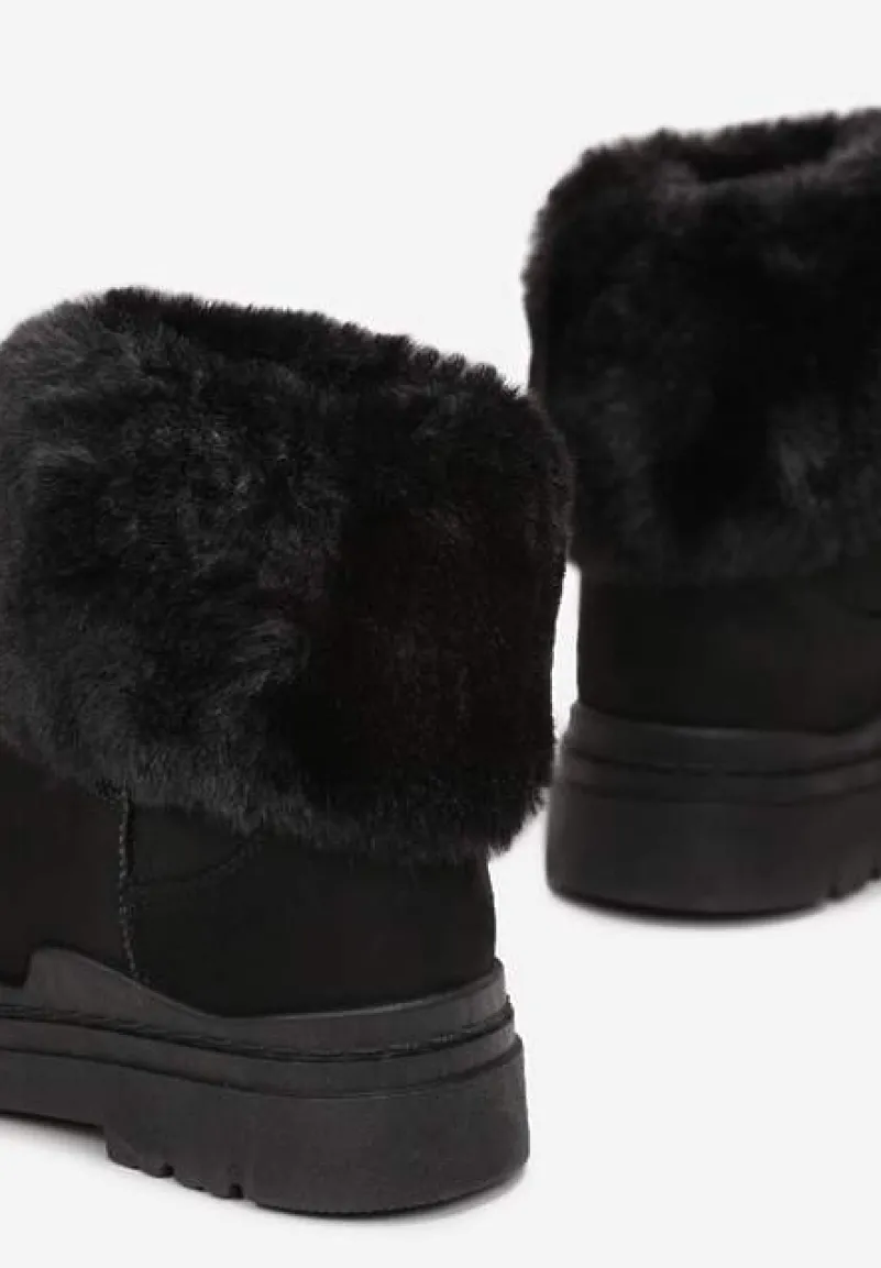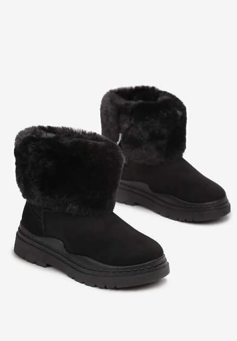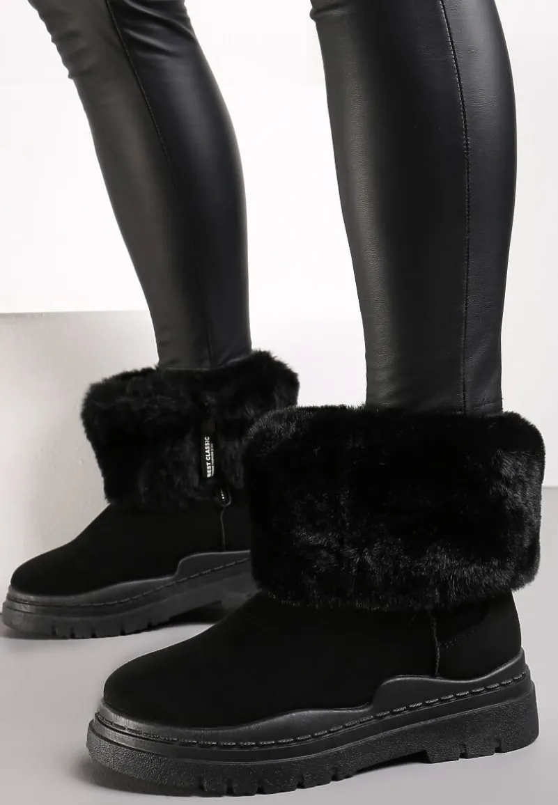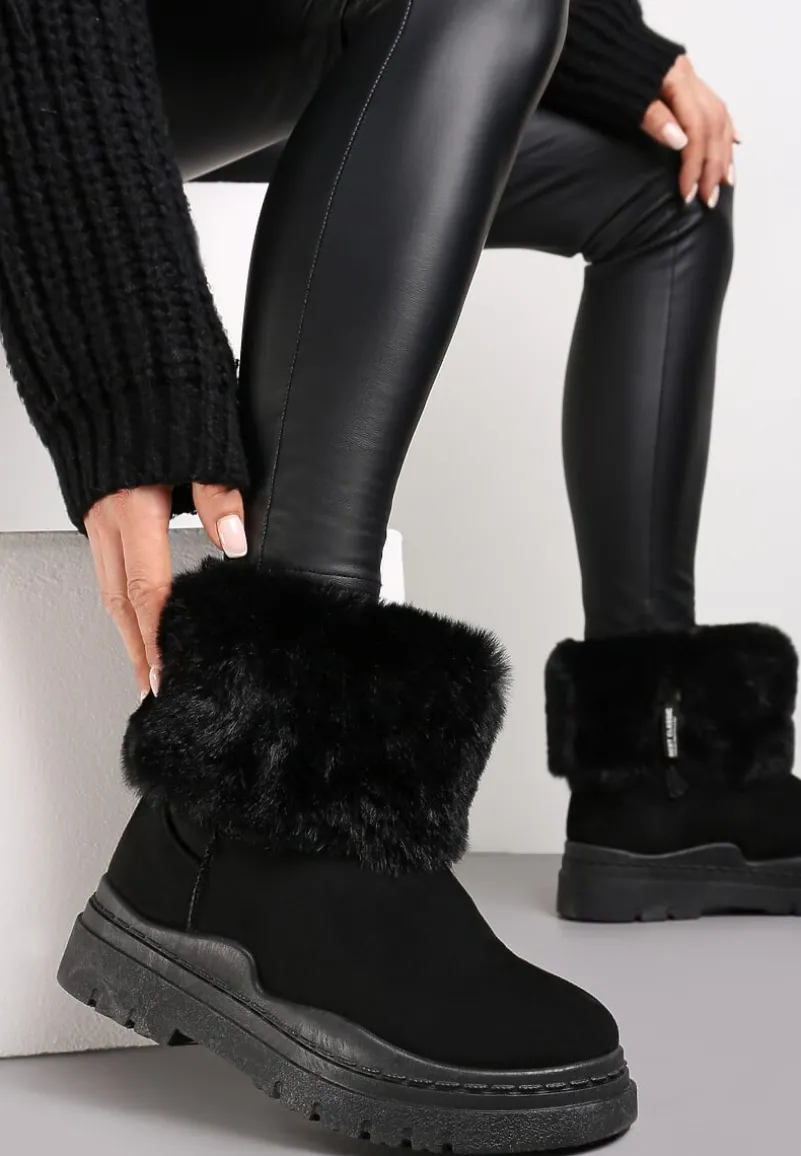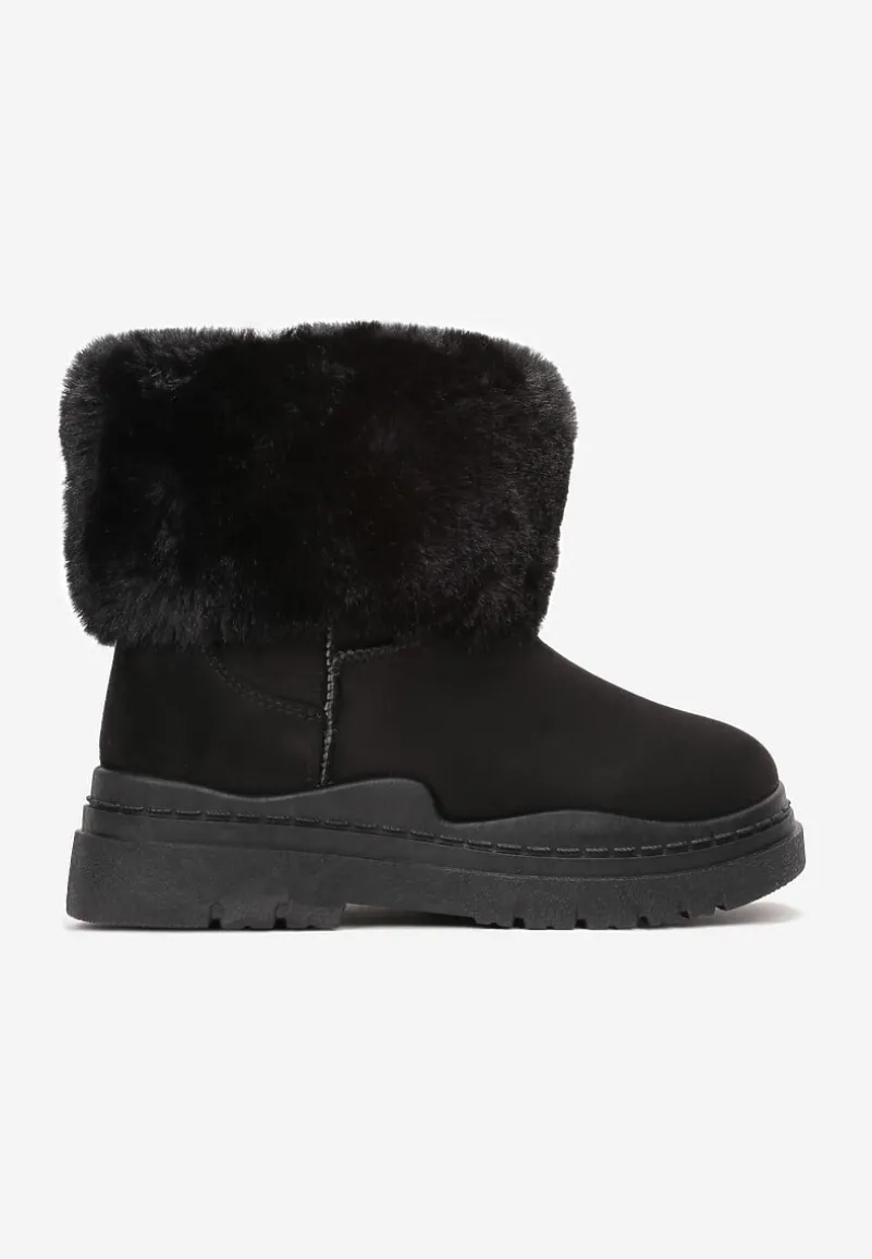 Śniegowce Nonva z cholewką do połowy łydki, zdobioną wokół imitacją futerka. Zasuwane na zamek błyskawiczny z boku. Wykonane z gładkiego ekozamszu, środek mocno ocieplany imitacją futerka. Model osadzony na grubej podeszwie. Zalecamy wybór rozmiaru o 1 większy.