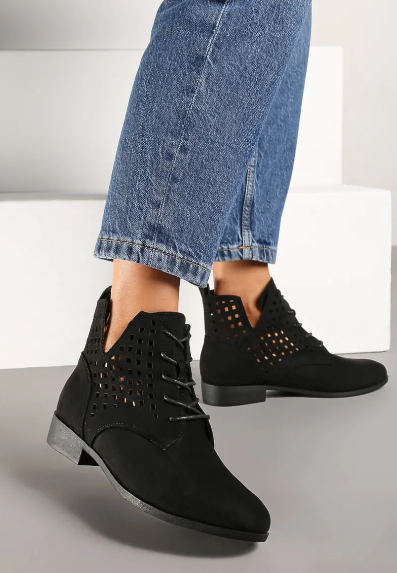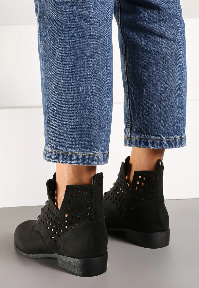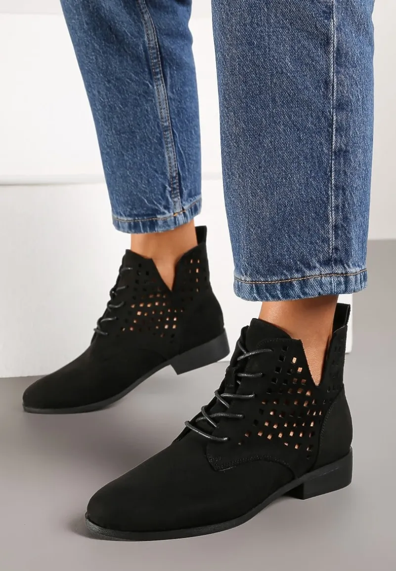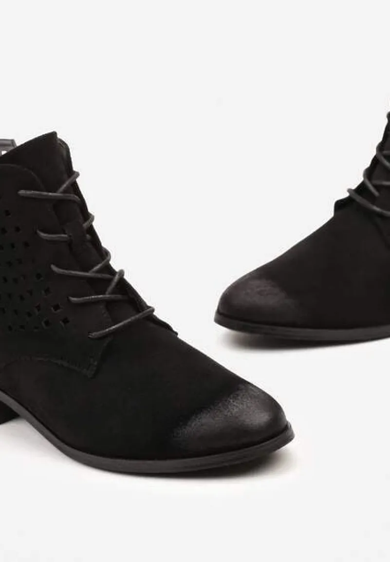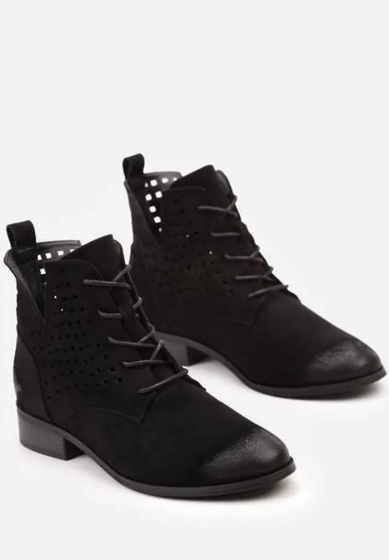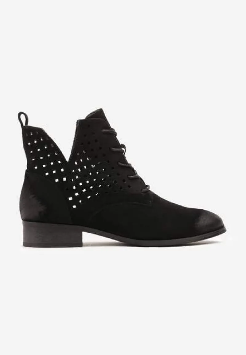 Czarne Sznurowane Botki ze Skórzaną Wkładką Ażurową Cholewką za Kostkę i Wycięciem Tlixa