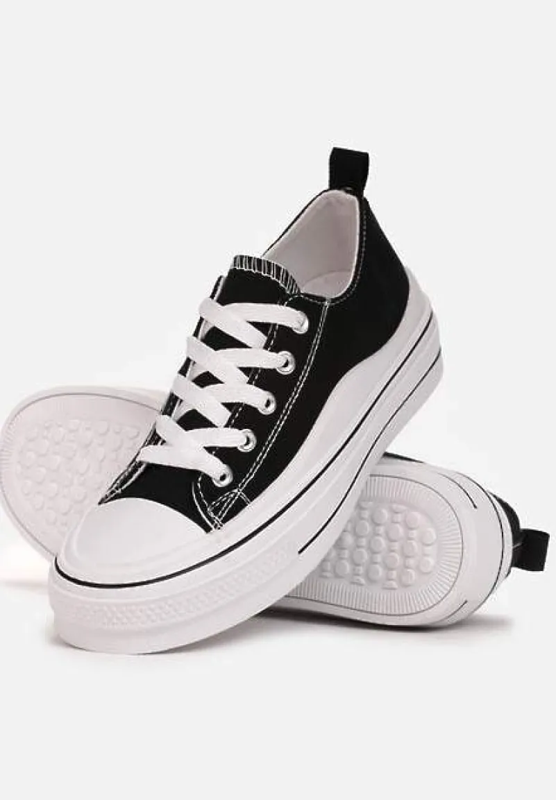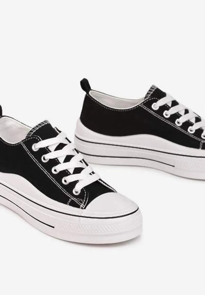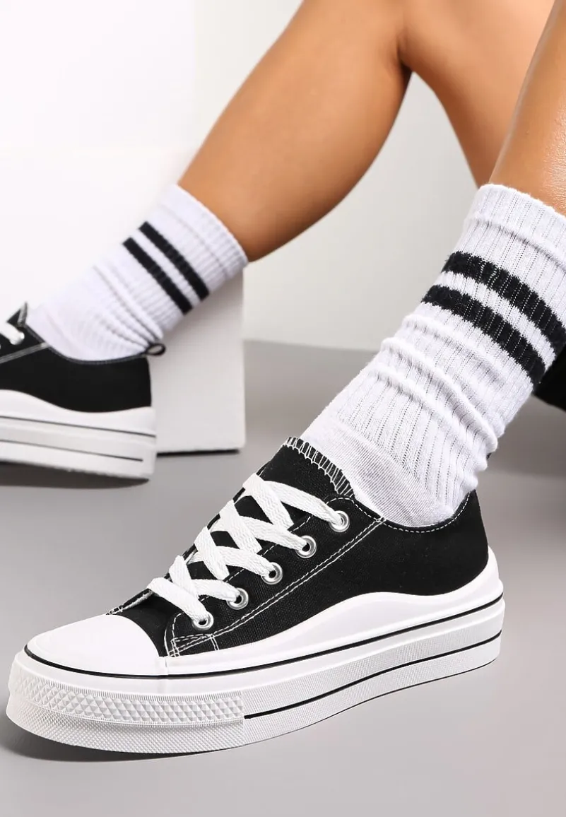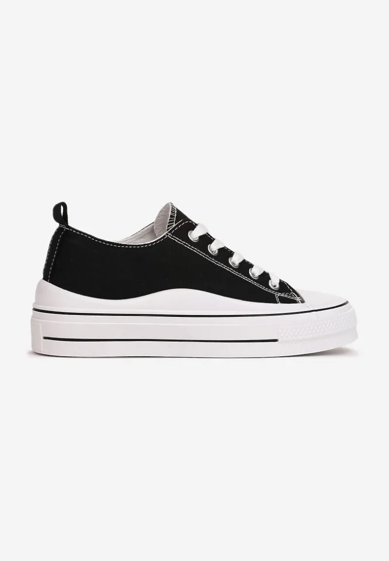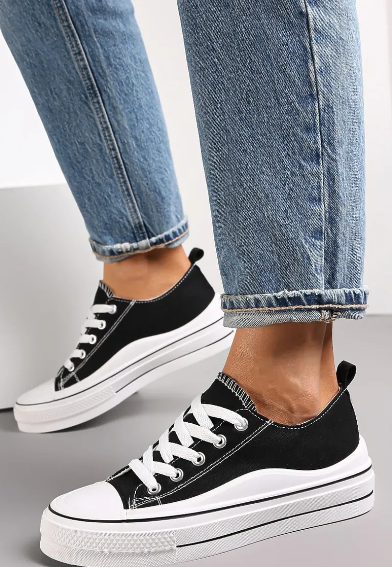 Trampki Dayami wykonane z gładkiego materiału tekstylnego. Osadzone na grubej podeszwie z lamówkami oraz wokół asymetryczna wstawka. Sznurowane. Cholewka sięga przed kostkę, z zaokrąglonym noskiem z gumową wstawką.