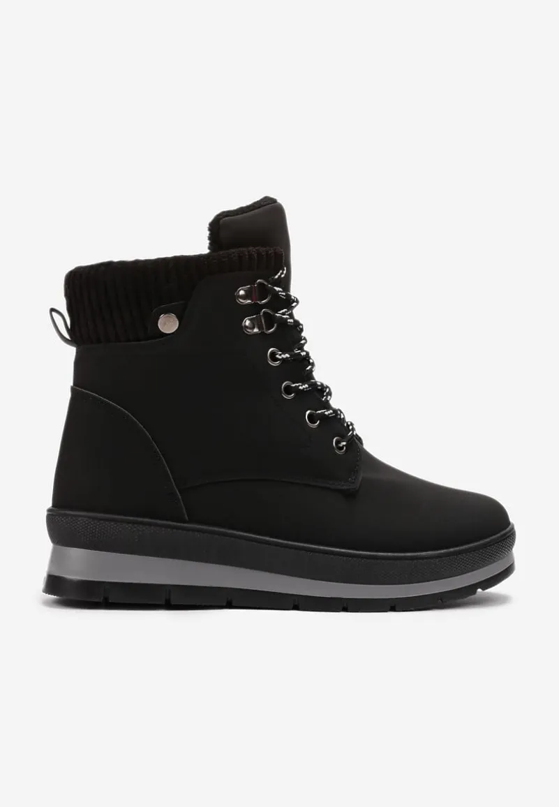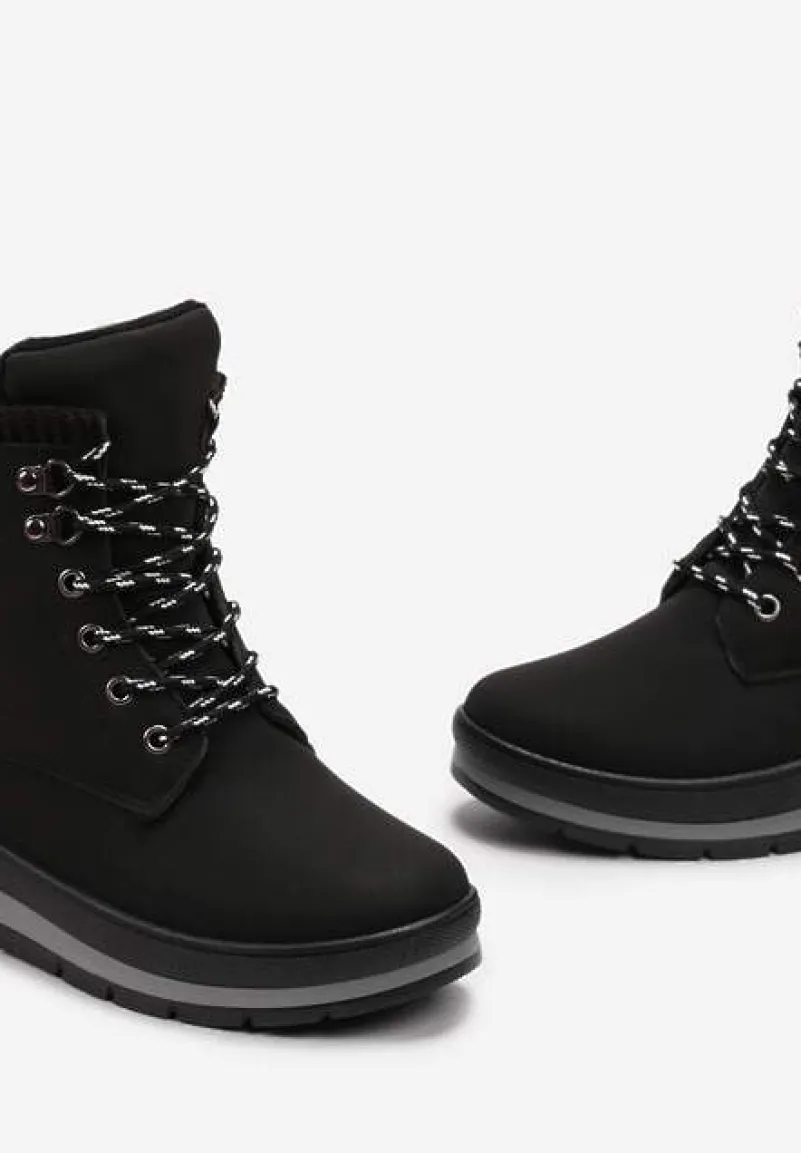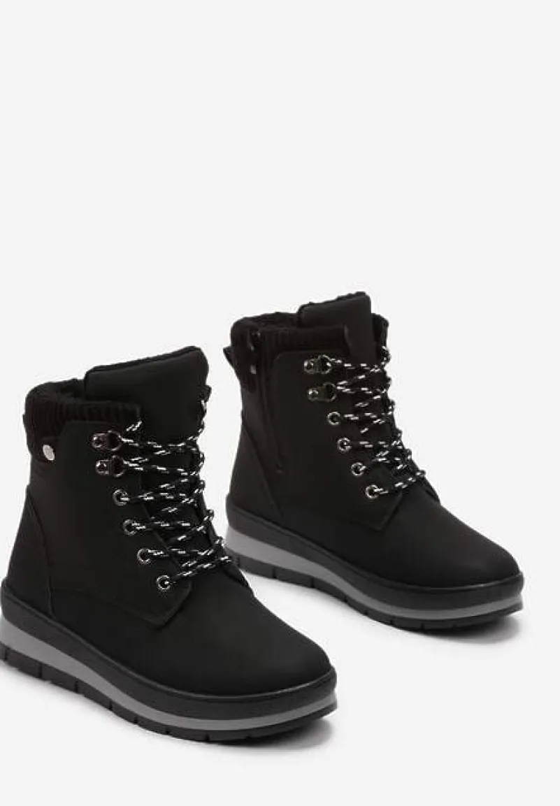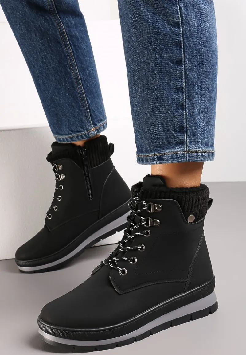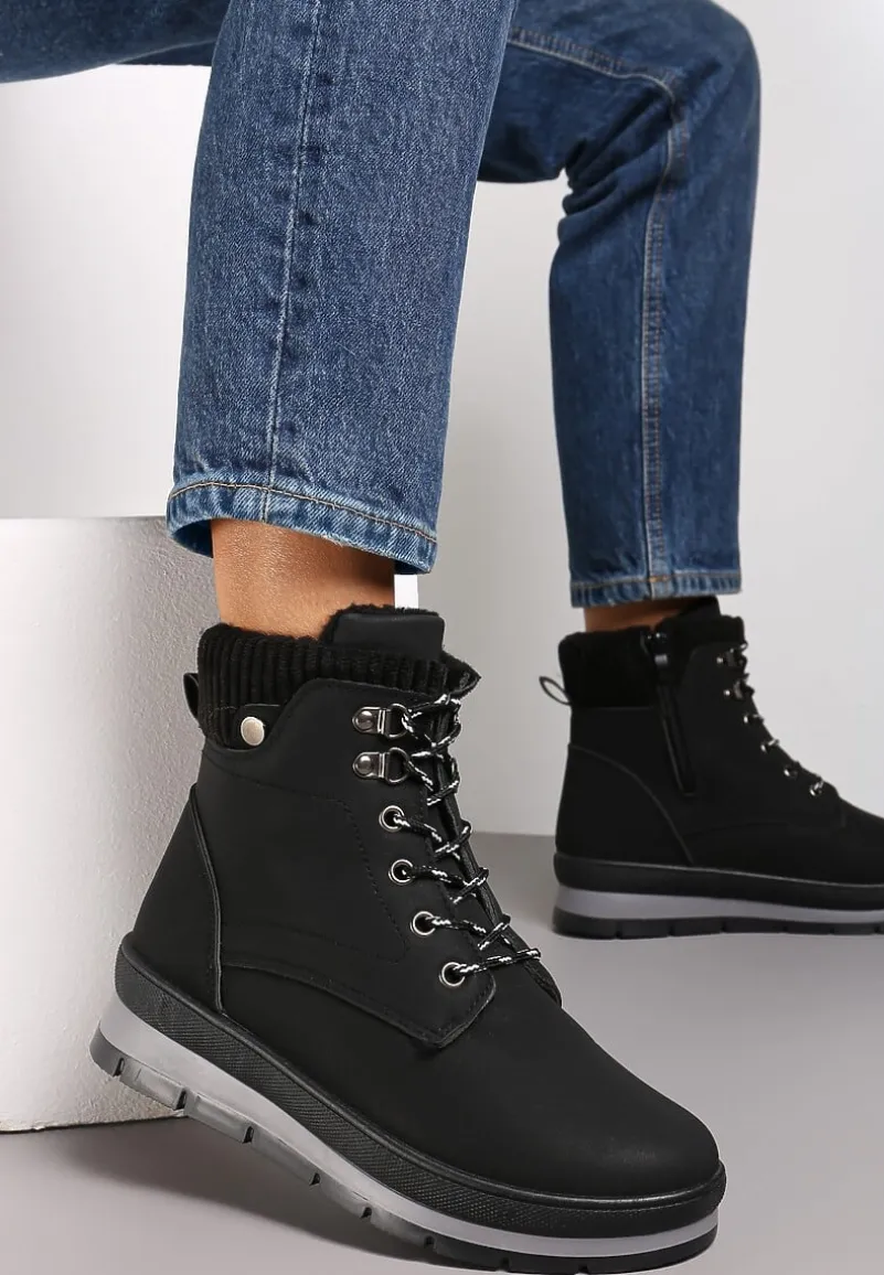 Sznurowane traperki Pisanara na płaskiej podeszwie, wykonane z ekoskóry. Ozdobione przeszyciami wzdłuż cholewki i sweterkowym wykończeniem przy kostce. W środku ocieplone futerkiem.