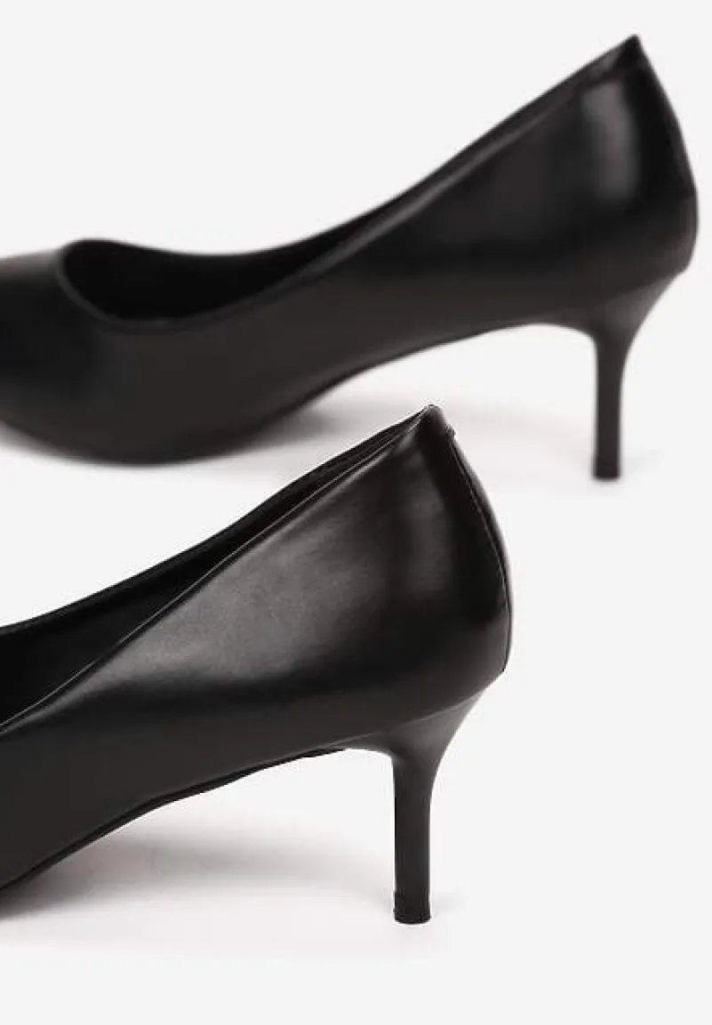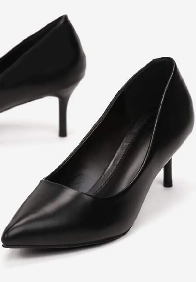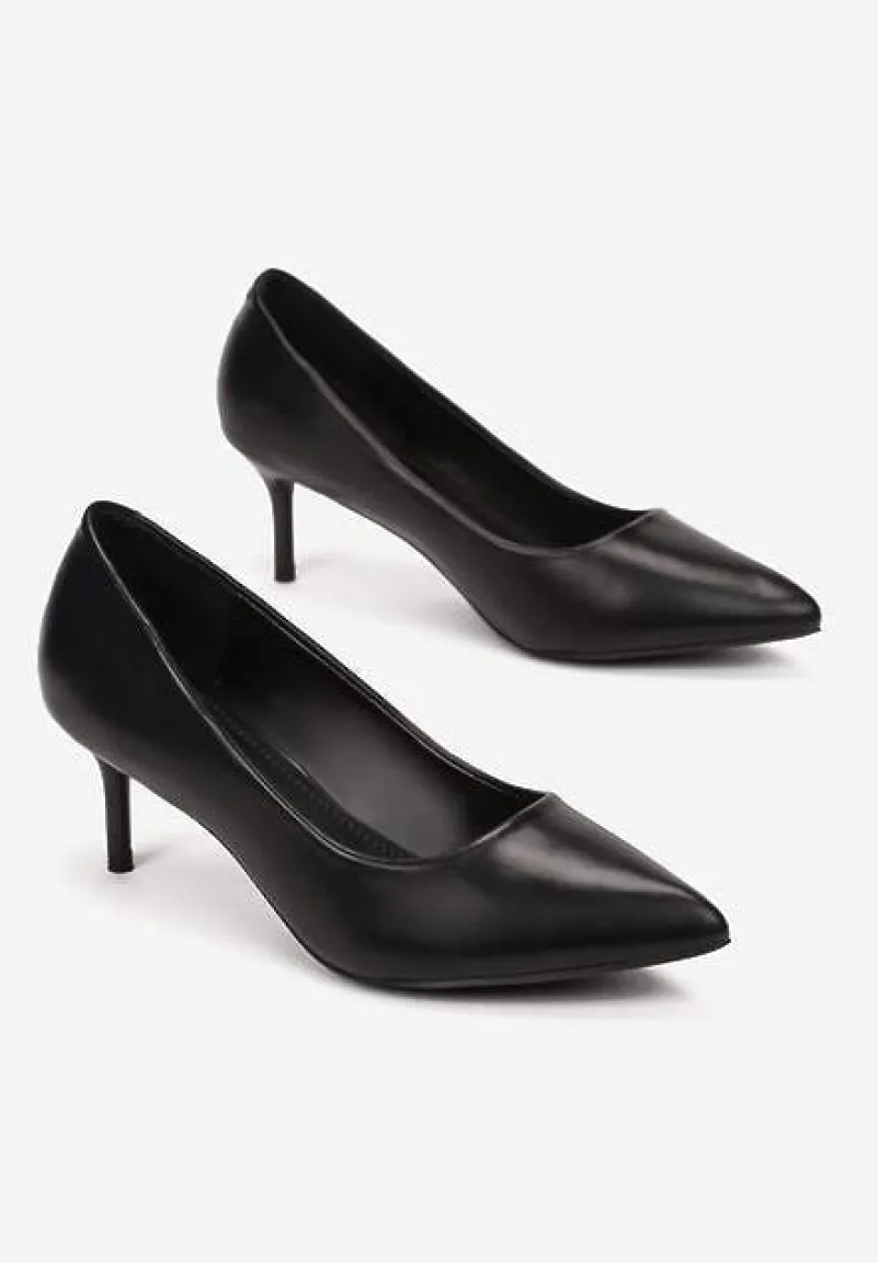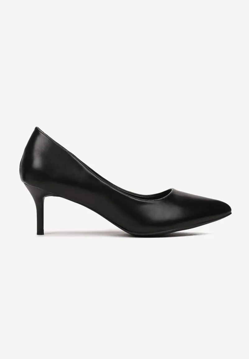 Szpilki Kalineira ze szpiczastym noskiem. Osadzone na niskim, cienkim obcasie typu szpilka. Wsuwane, wykonane z jednolitej ekoskóry. To kwintesencja klasy i niewymuszonej elegancji: must have każdej kobiety. Założysz je na rozmowę o pracę, rodzinną uroczystość, romantyczne spotkanie lub większe wyjście. Najlepiej leżą na wąskiej stopie. Rekomendujemy zakup rozmiaru o 1 większego.