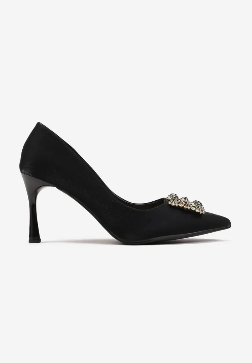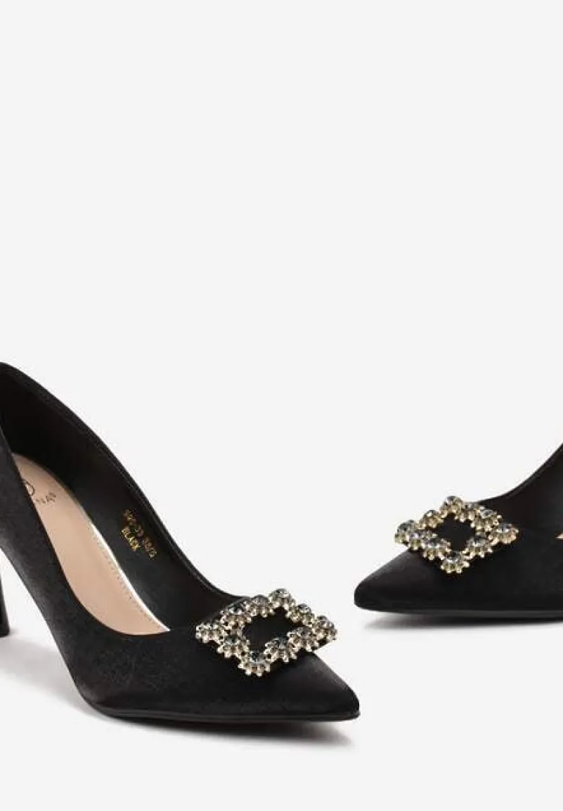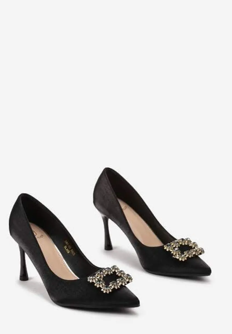 Szpilki Luneve na lakierowanym obcasie. Wykonane z ekoskóry z metalicznym połyskiem. Z przodu ozdobione klamrą z kryształkami. To idealny wybór na wielkie wyjścia.