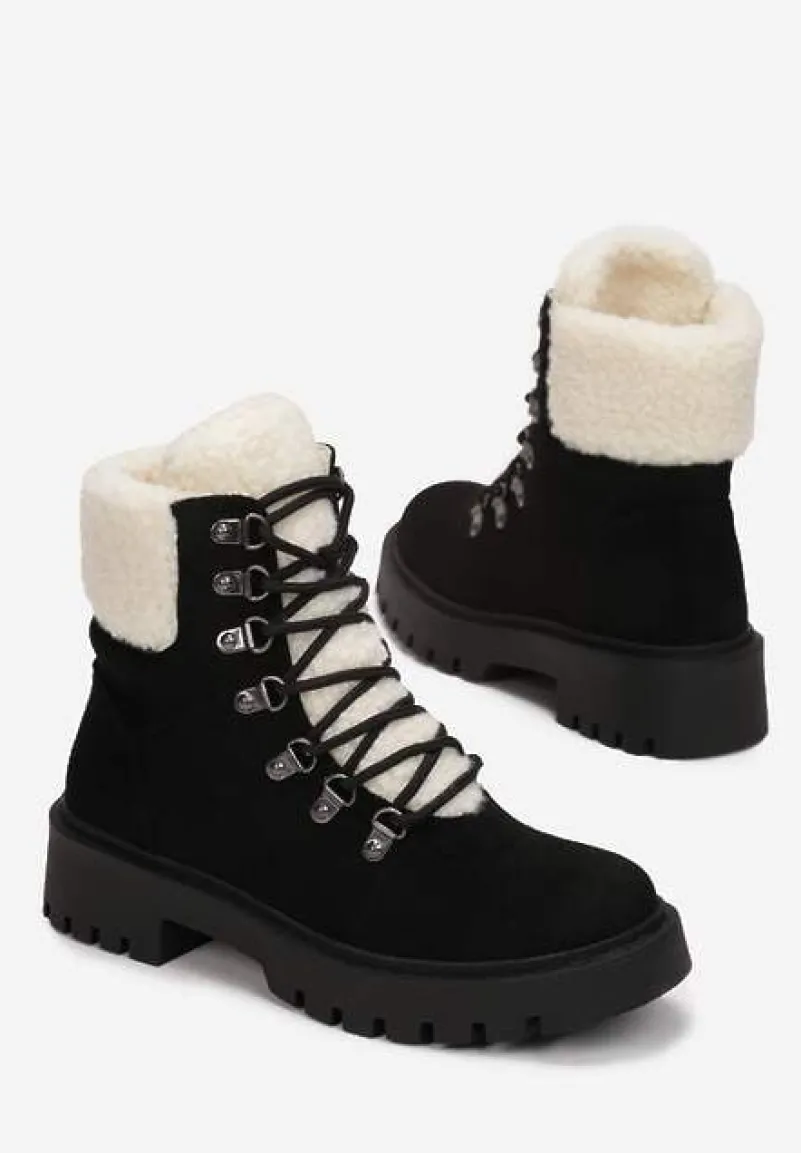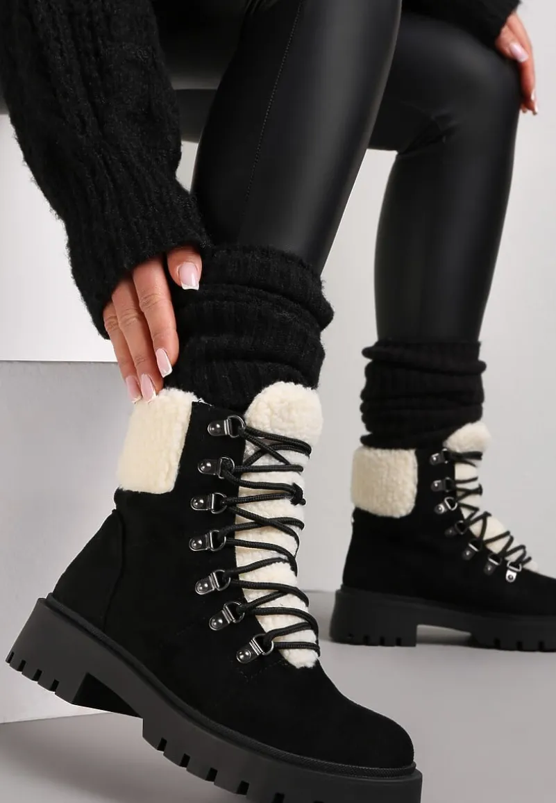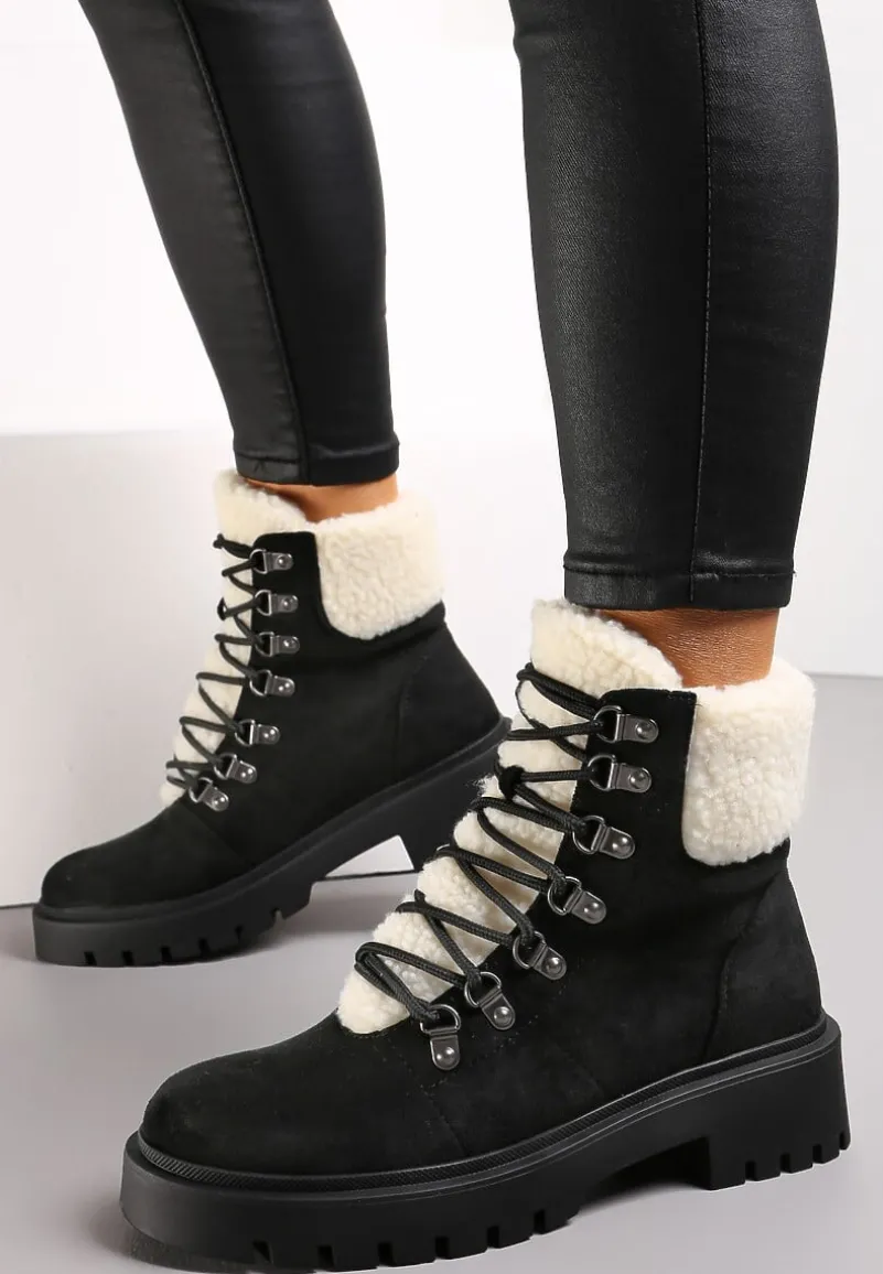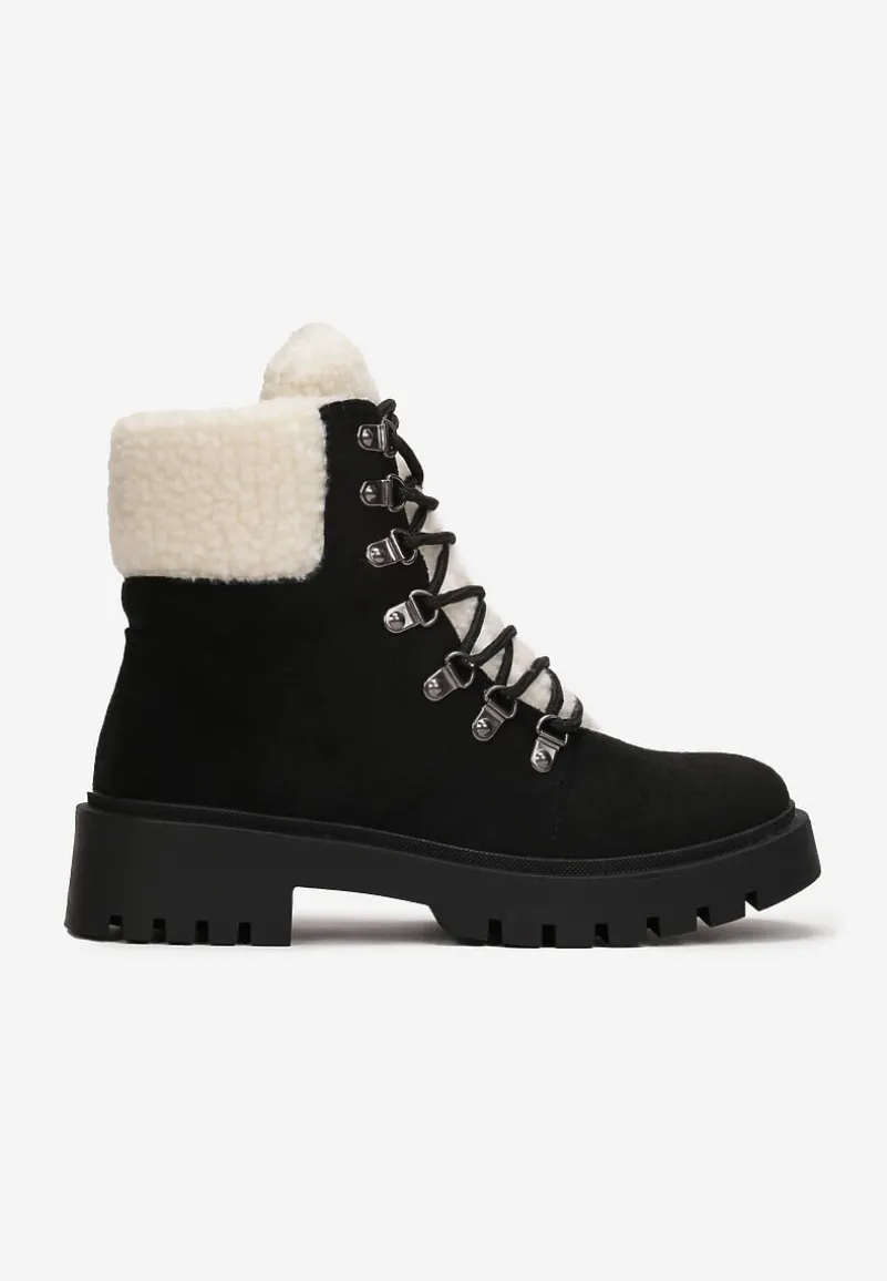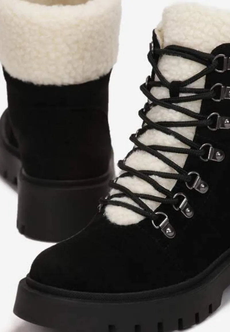 Traperki Isirae z ekozamszu. Ocieplane kocem obuwniczym. Model osadzony na grubej podeszwie z bieżnikiem. Wysoka za kostkę cholewka i język ozdobiono sztucznym barankiem. Buty mają wiązanie na sznurowadła z przodu. Ciepłe traperki sprawdzą się w zimne jesienne i zimowe dni. Doskonale prezentują się w towarzystwie dopasowanych skinny jeansów lub spódnic midi.