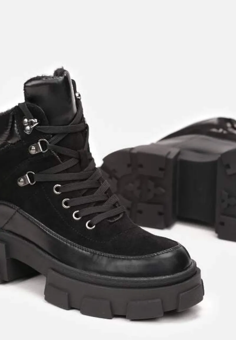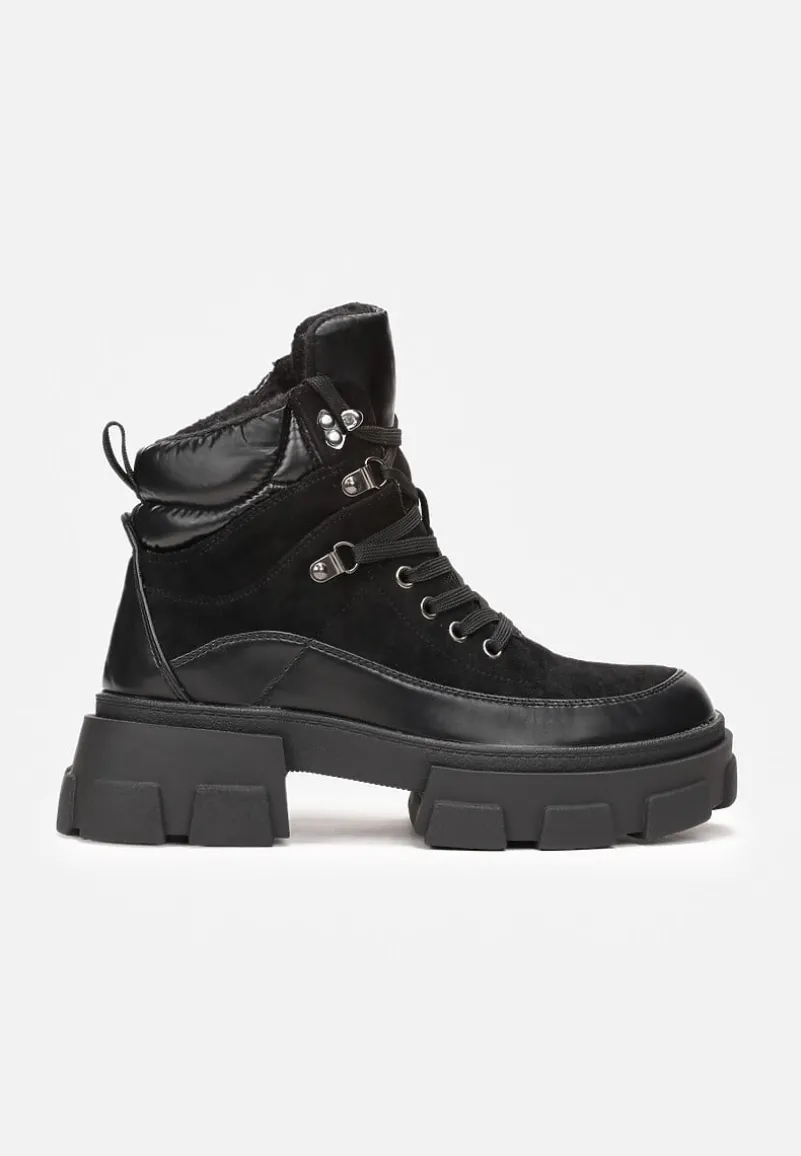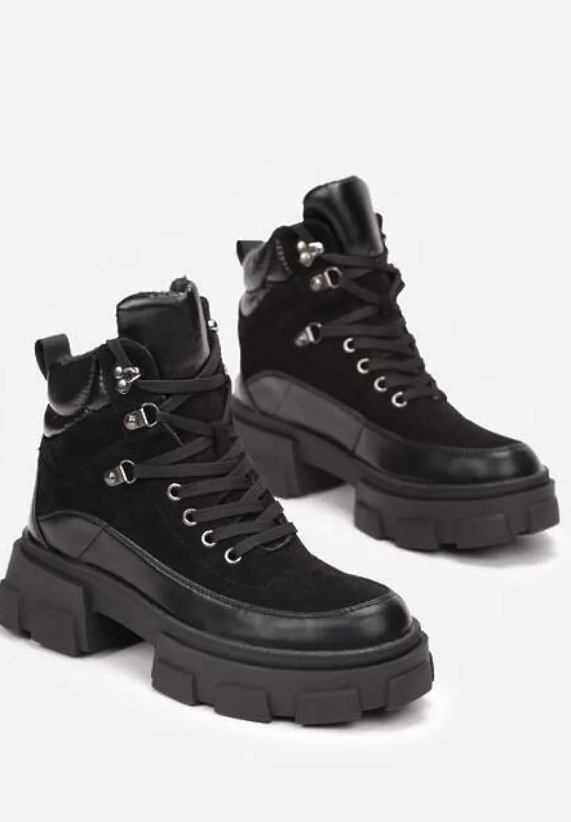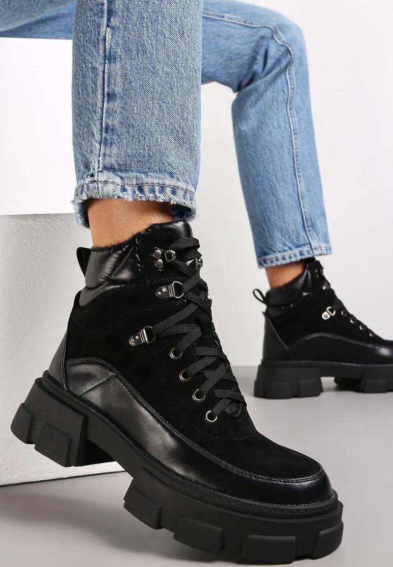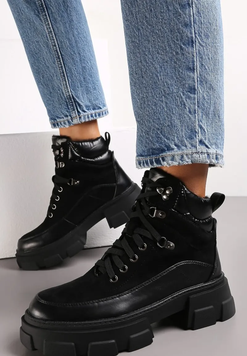 Botki Vodre na modnej traktorowej podeszwie, sznurowane z przodu. Wykonane z połączenia ekoskóry i ekozamszu w stylu workerów.