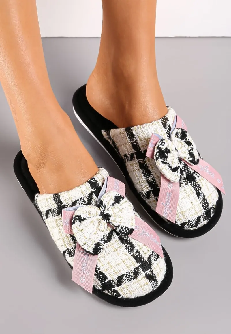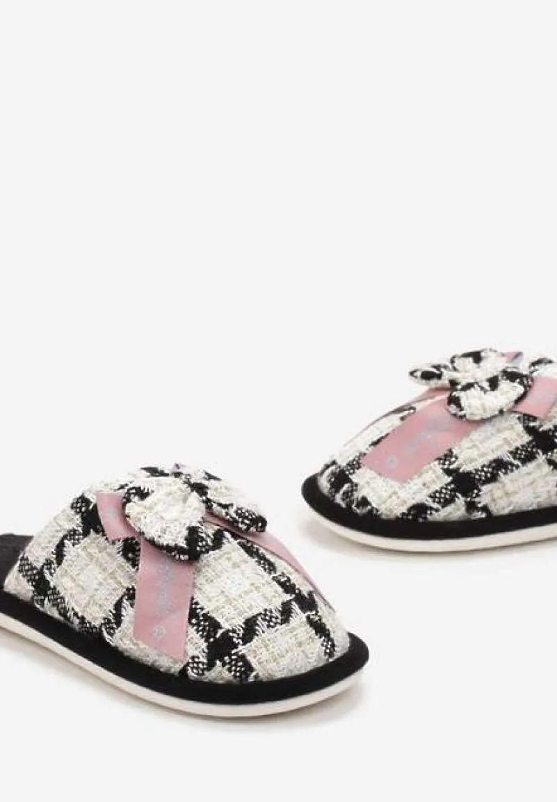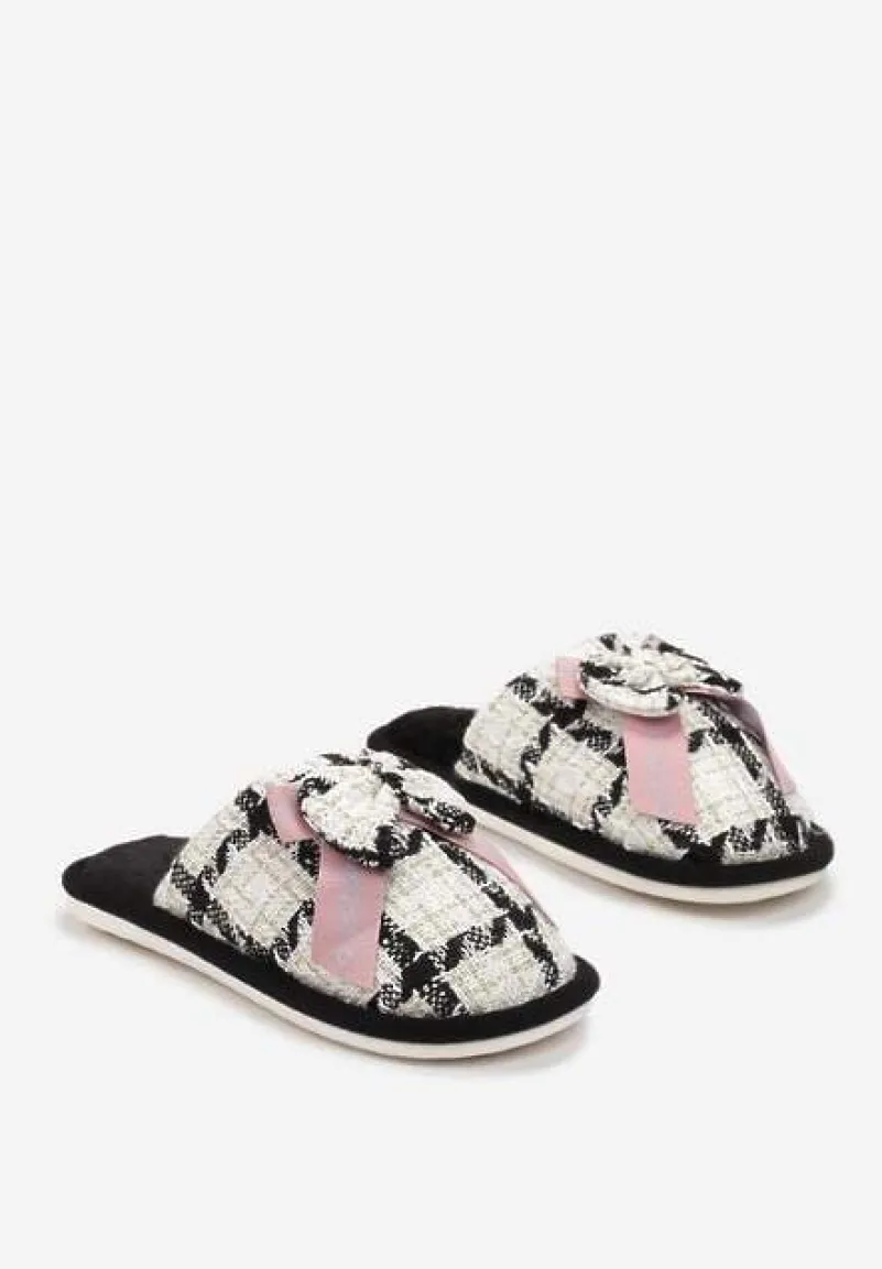 Kapcie Kapati w kratkę, z płaską podeszwą. W środku wyścielone przyjemnym w dotyku materiałem. Ozdobione kokardką i metaliczną nitką.