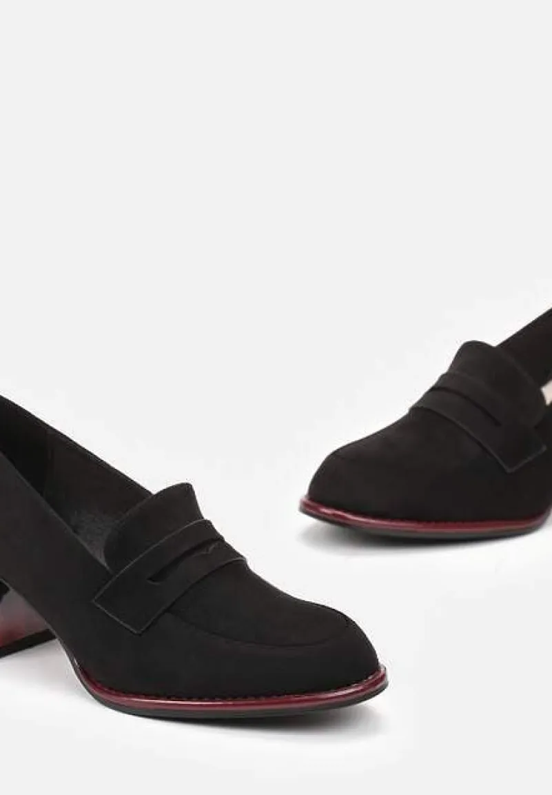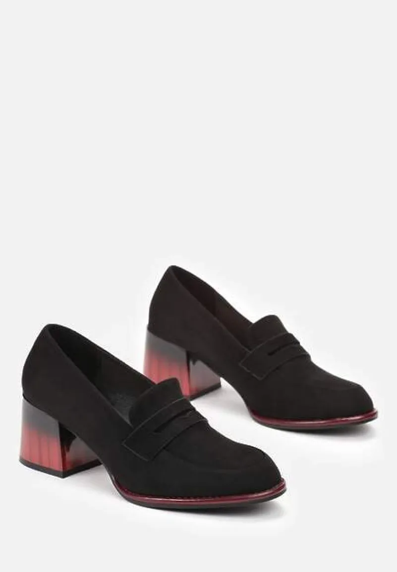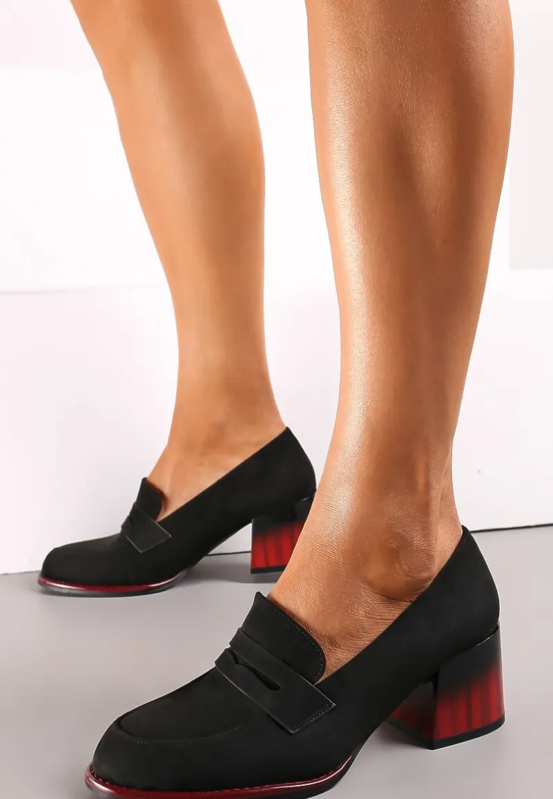 Nowoczesny półbuty Leensa – posiadają kolorystyczny akcenyt na trapezowym słupku. Wsuwane, okrągły nosek.