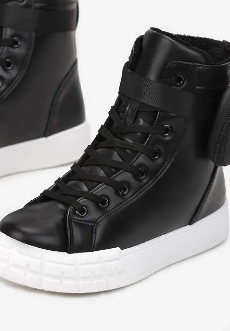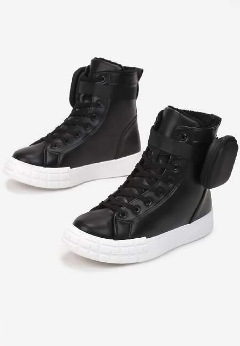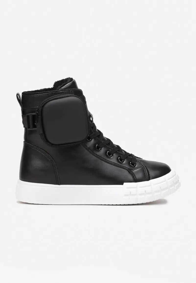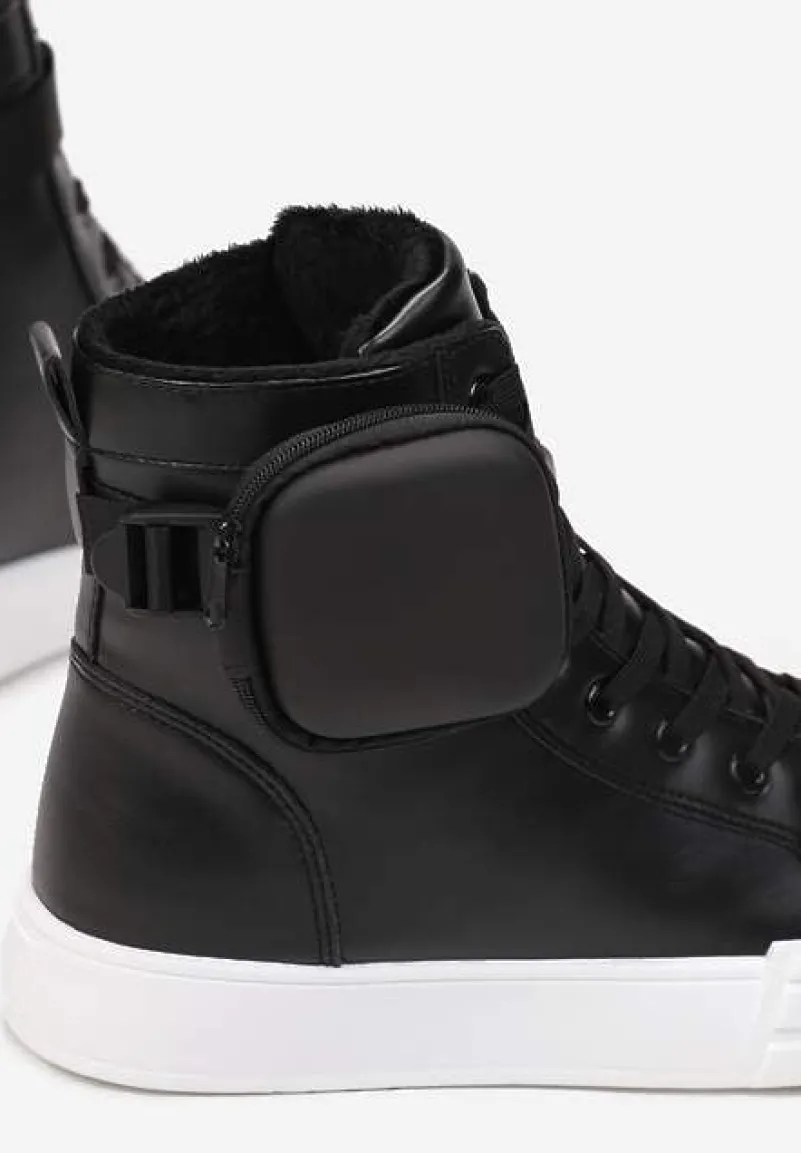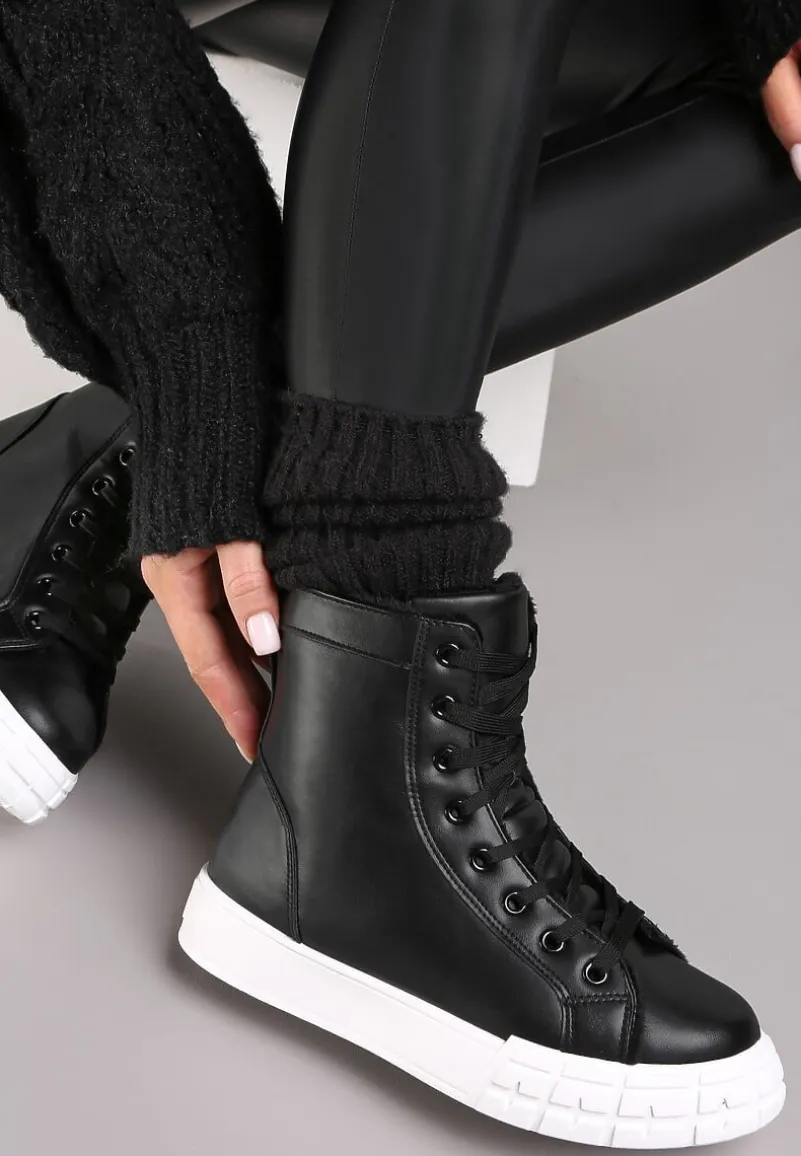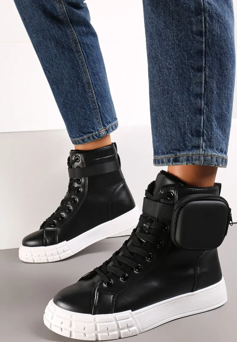 Botki Cecyrea na płaskiej platformie, sięgające za kostkę. Przednia część podeszwy udekorowana geometrycznymi żłobieniami. Wiązane, z okrągłym noskiem. Cholewkę oplata pasek zapinany na plastikową klamrę, z doczepioną zasuwaną kieszonką. Wykonane z ekoskóry, lekko ocieplane kocem obuwniczym. Ich nowoczesny design zachwyca! Polecamy wybór rozmiaru o 1 większego.