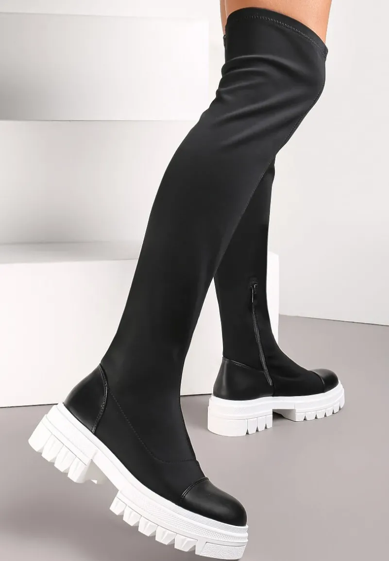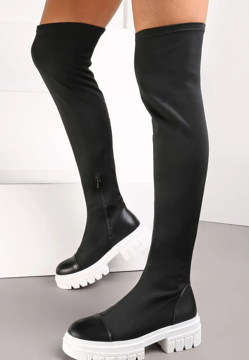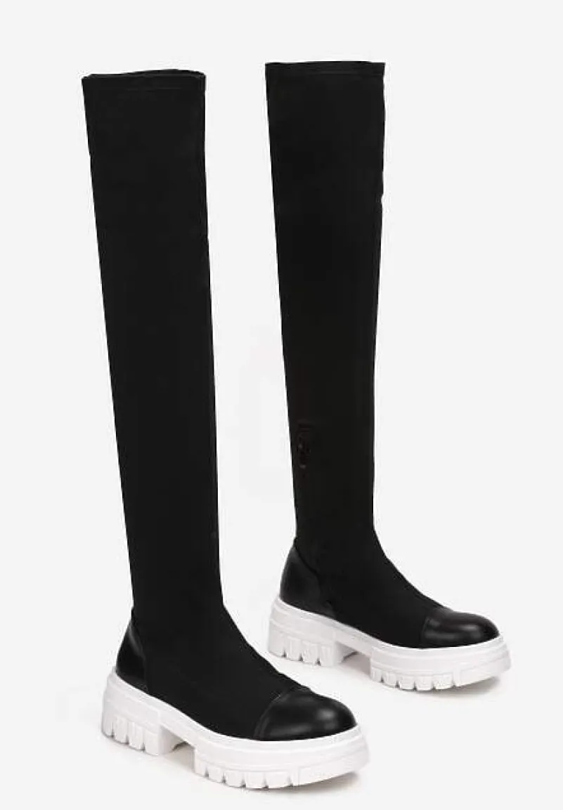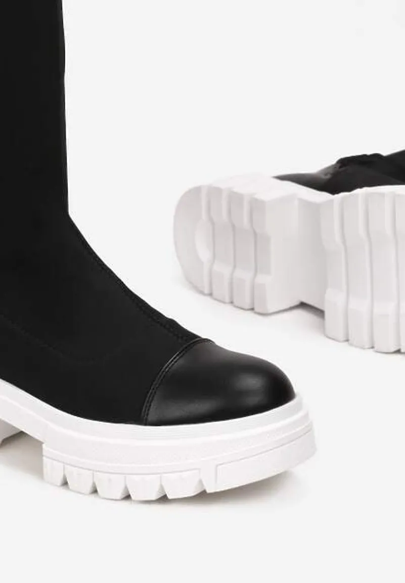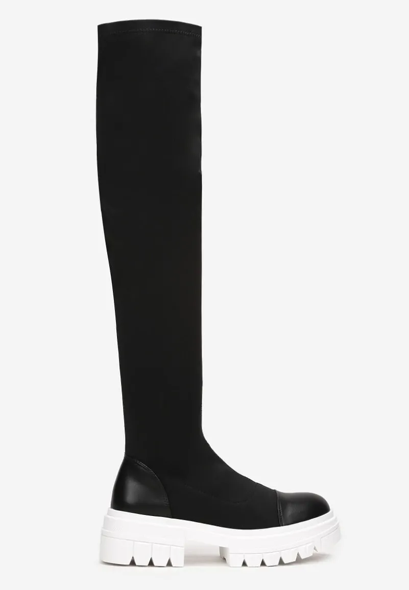 Kozaki Penthiche z dopasowaną cholewką. Wykonane z połączenia elastycznego materiału i ekoskóry. Wyjątkowe kozaki Penthiche zapinane są na zamek błyskawiczny.