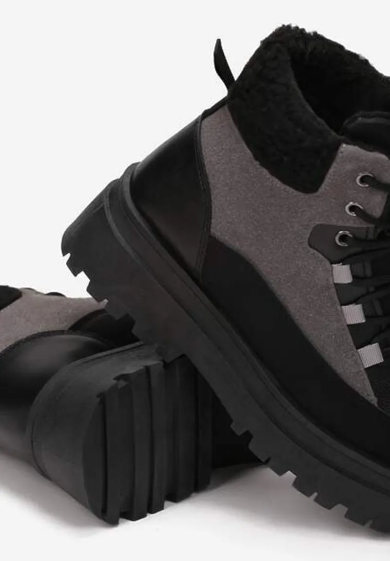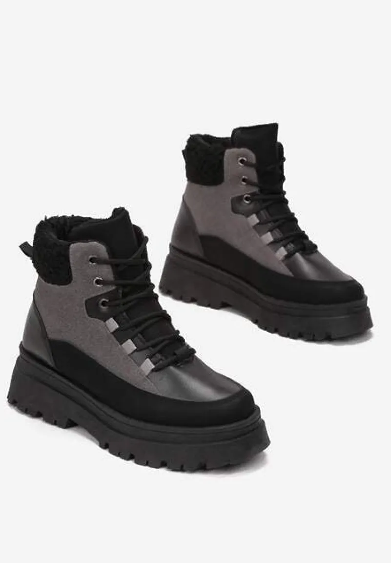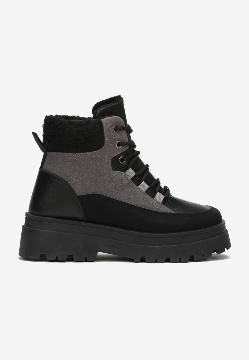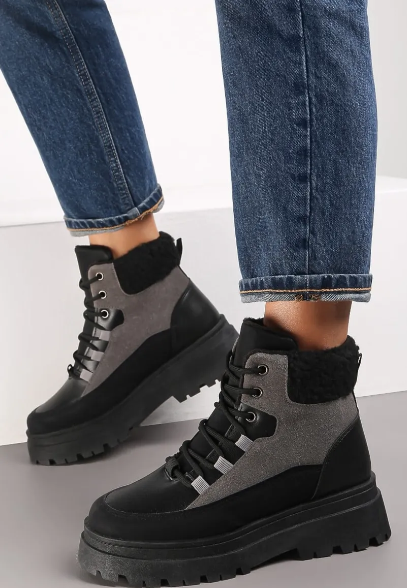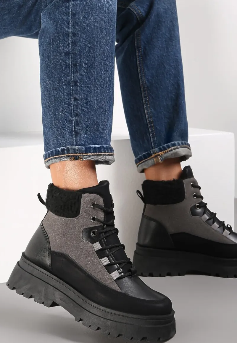 Botki Janne z cholewką za kostkę. Sznurowane trapery na grubej podeszwie z bieżnikiem. Na krawędzi cholewki wstawka ze sztucznego futerka o fakturze baranka. Smukły, okrągły nosek. Zdobione kolorowymi wstawkami, w tym jedną z ekozamszu. Wykonane z ekoskóry, lekko ocieplone za pomocą koca obuwniczego. Traperki z futerkiem Janne to must have dla miłośniczek streetwearowej klasyki. Zamów większy rozmiar!