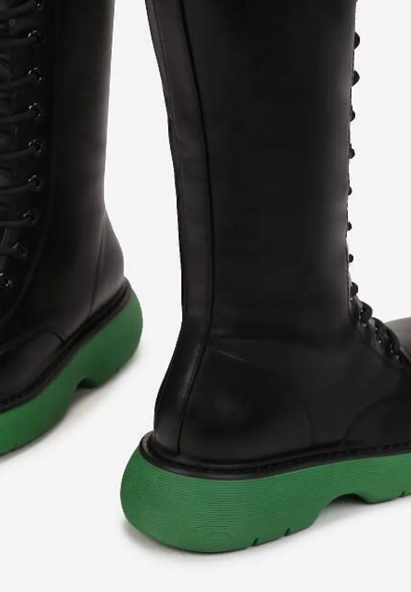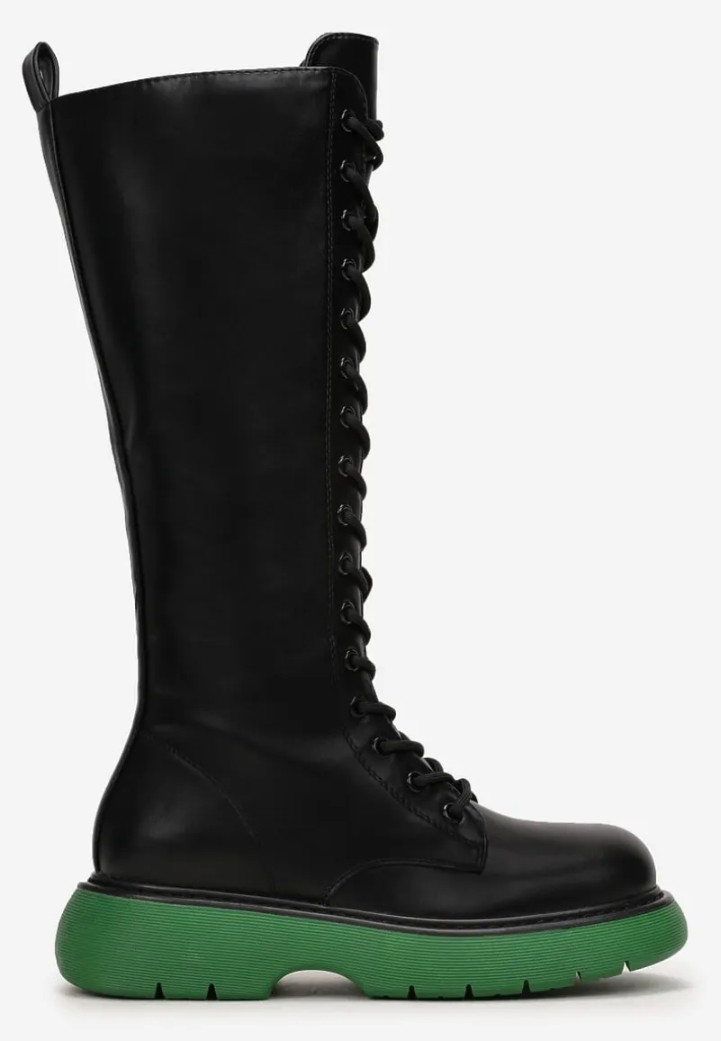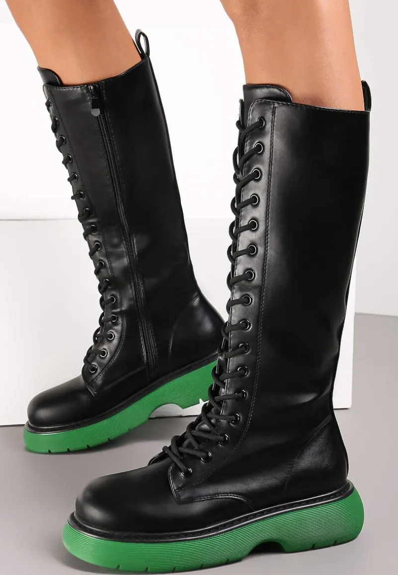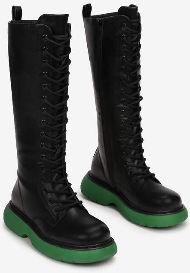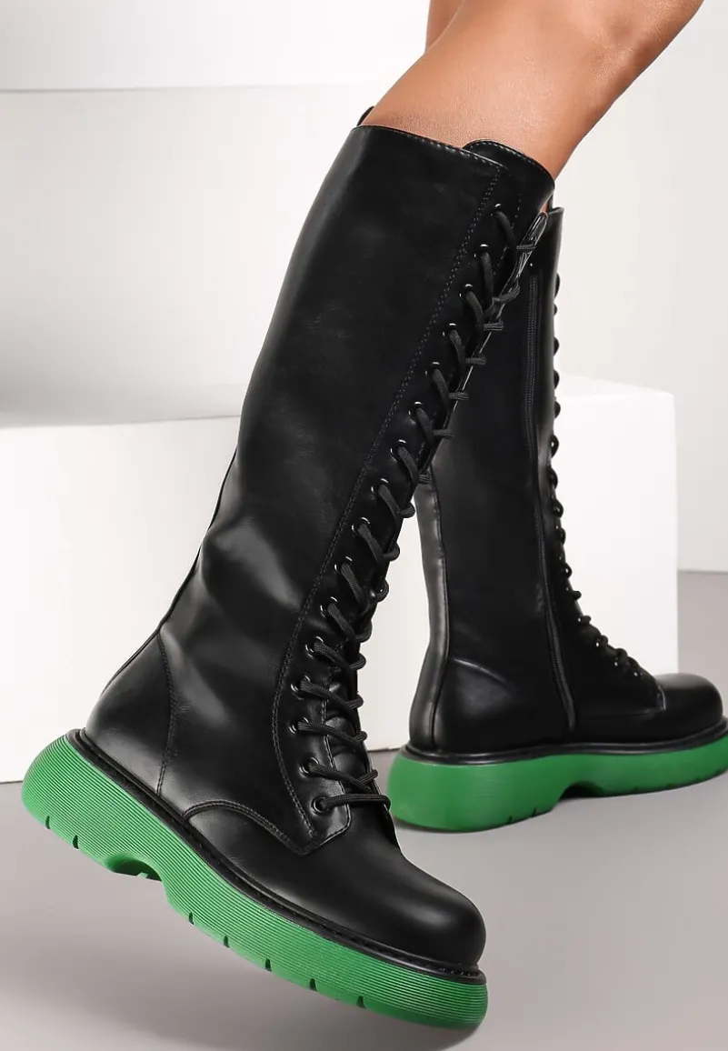 Kozaki Zolmi wykonane z ekoskóry. Osadzone są na grubej podeszwie z ciekawymi żłobieniami. Kozaki Zolmi posiadają z boku klasyczny zamek błyskawiczny, z przodu wiązanie na okrągłe sznurówki.