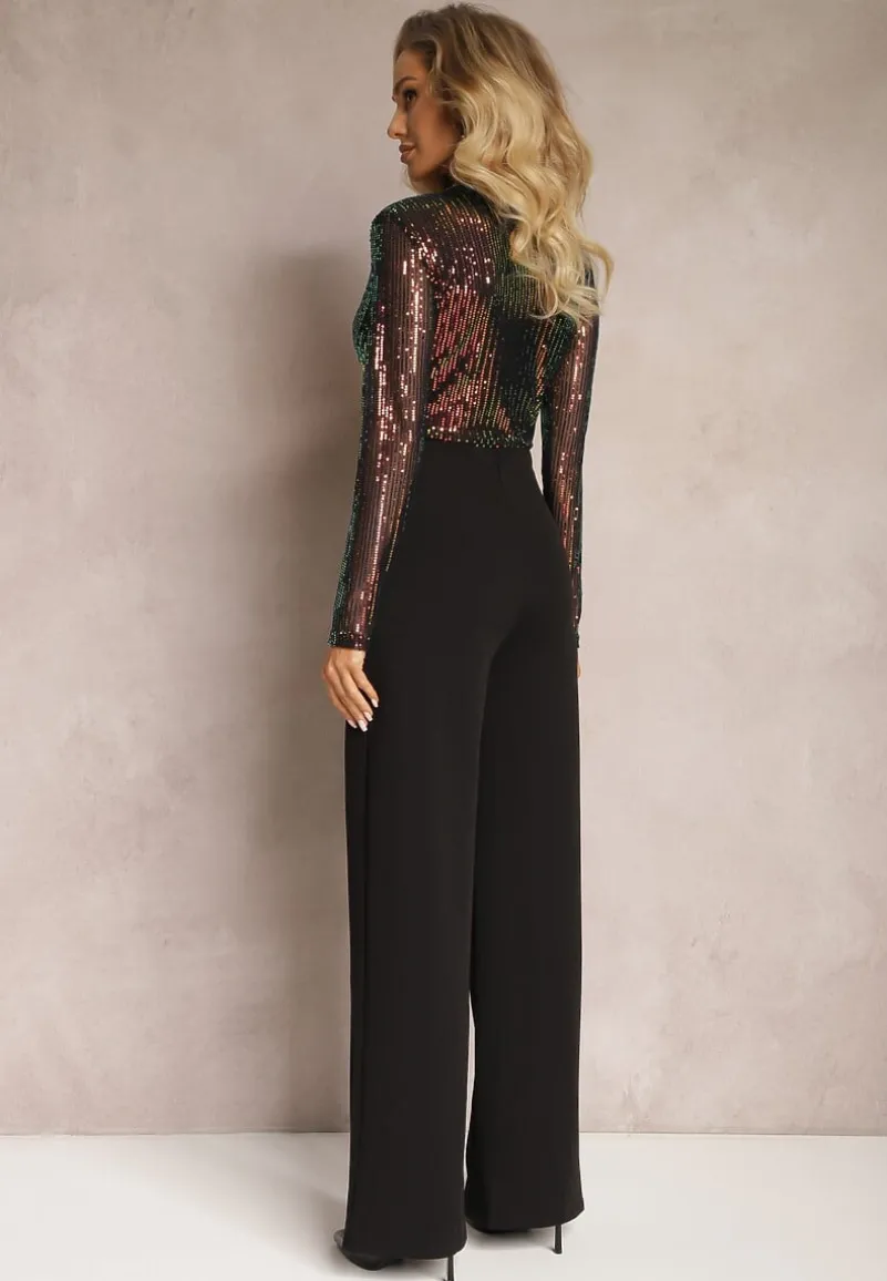 Czarny Błyszczący Długi Kombinezon w Cekiny z Kopertowym Dekoltem Campara