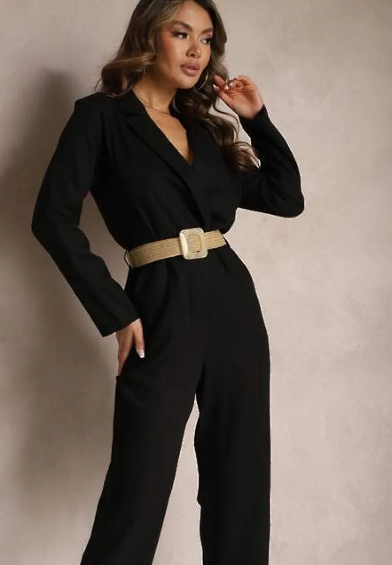 Czarny Kombinezon z Paskiem z Plecionki Kopertową Górą i Zwężającymi się Nogawkami Avnja