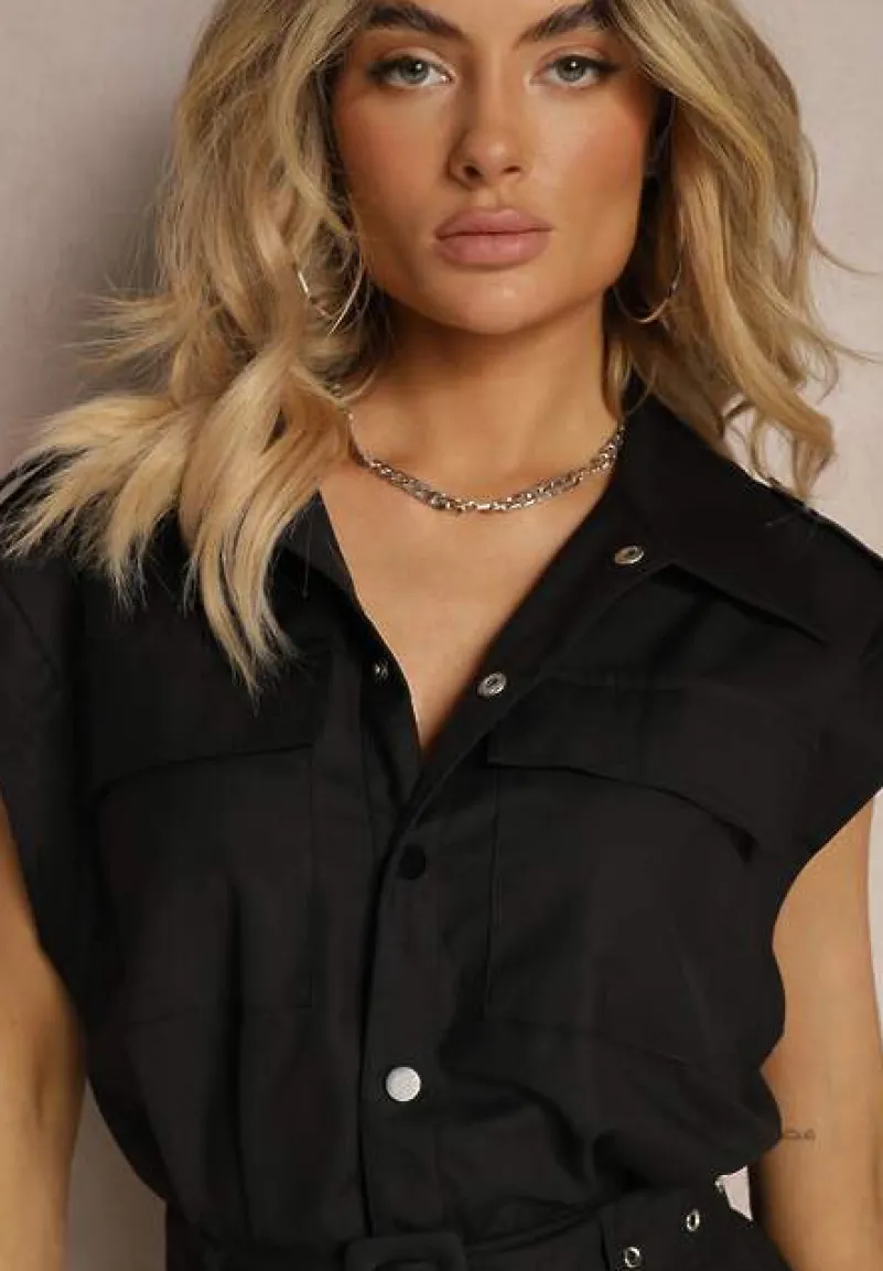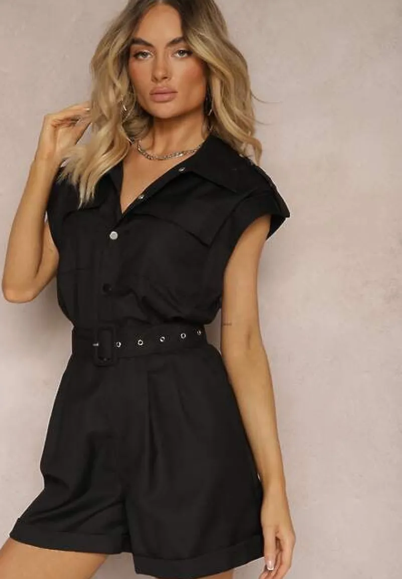 Czarny Kombinezon Zapinany na Guziki z Krótkim Rękawem i Materiałowym Paskiem Tiamante