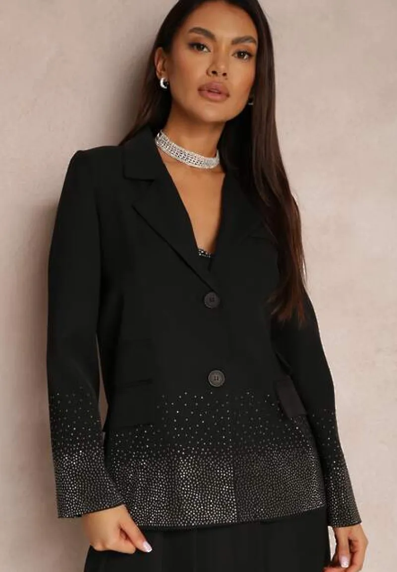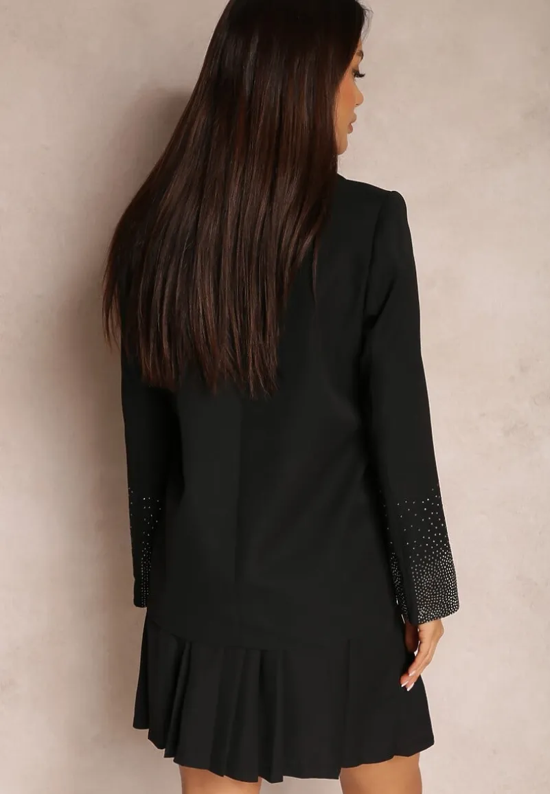 Komplet Eme składa się z dwóch części: sukienki i marynarki. Całość dekorowana efektowną imitacją cyrkonii. Sukienka mini na cienkich, regulowanych ramiączkach. Plisowany dół. Z boku zamek błyskawiczny. Dekolt w usztywnianymi miseczkami. Sukienka posiada podszewkę. Marynarka jednorzędowa, zdobiona imitacją kieszeni.