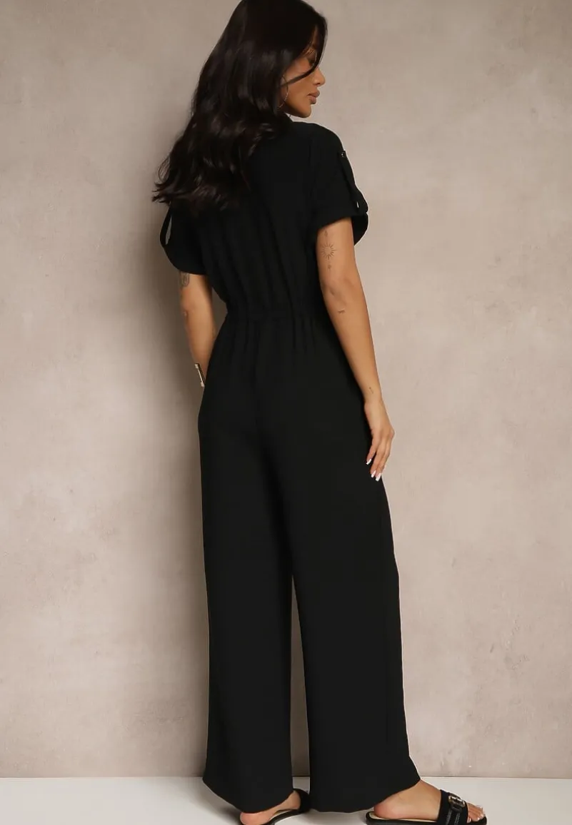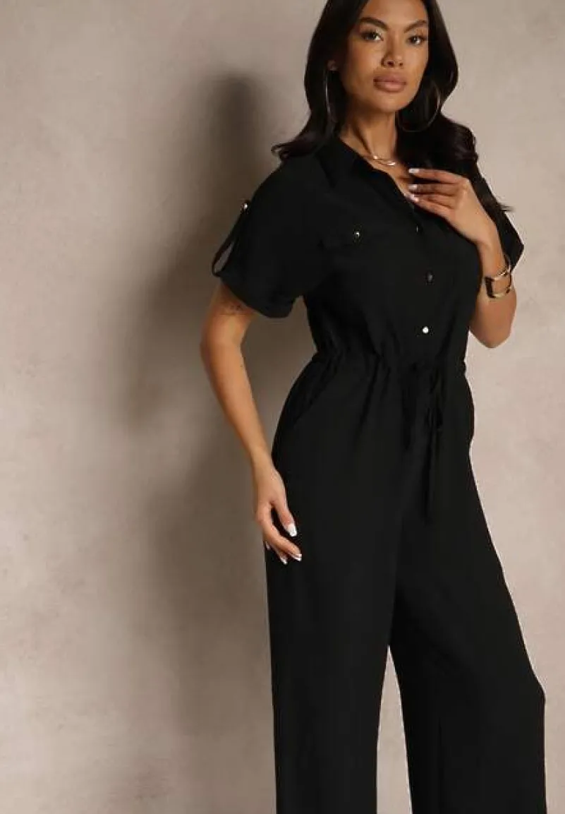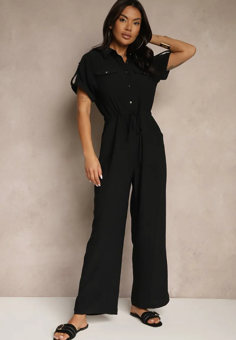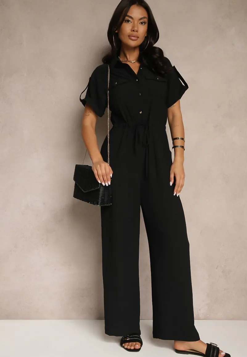 Czarny Koszulowy Kombinezon z Krótkim Rękawem Wiązany w Pasie Maraisla
