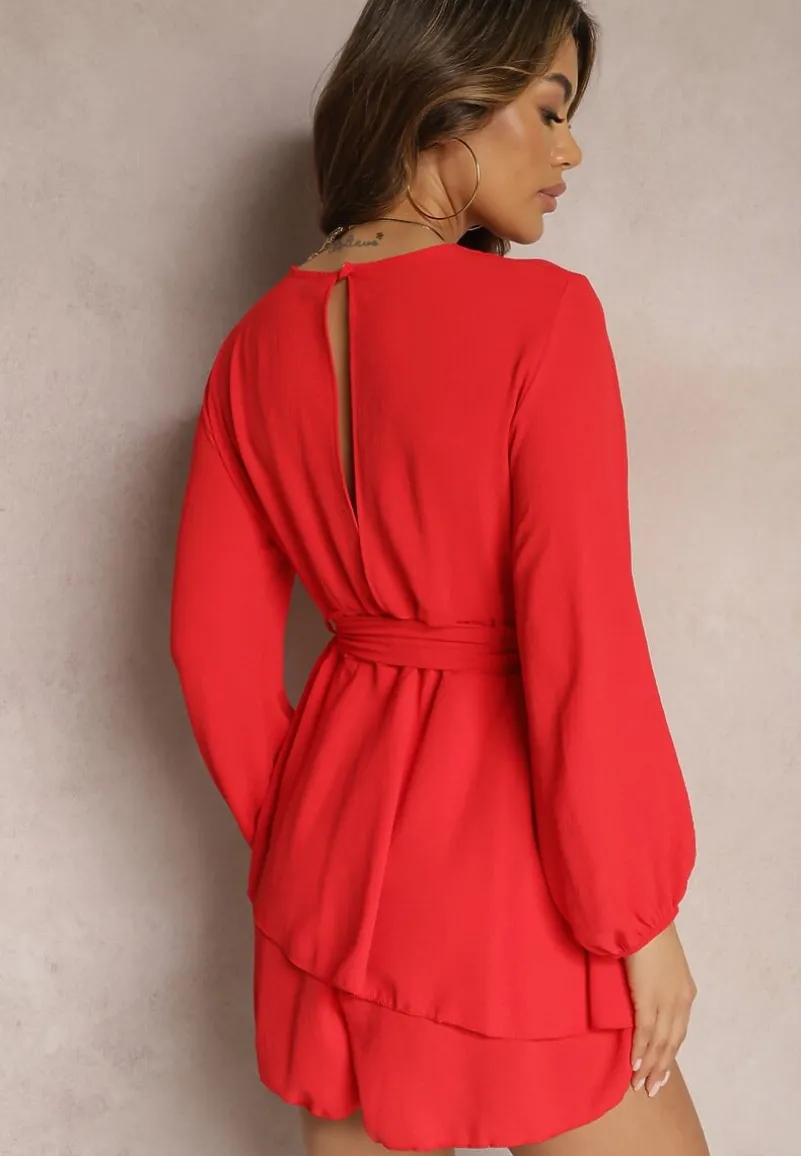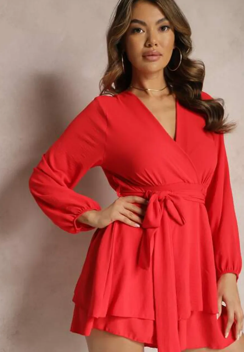 Czerwona Rozkloszowana Sukienka Kombinezon z Kopertowym Dekoltem i Falbanką Vomitta