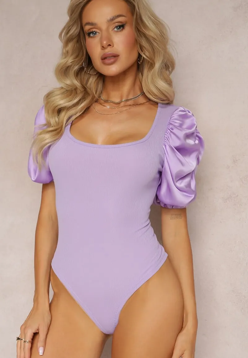 Body Lojmi ze stylowymi, bufiastymi rękawami. Wykonany z prążkowanej dzianiny. Dół wygodnie zapinany na haftki.