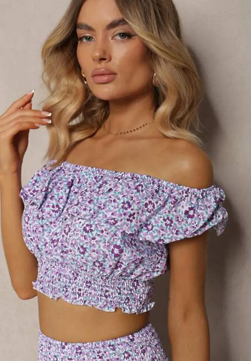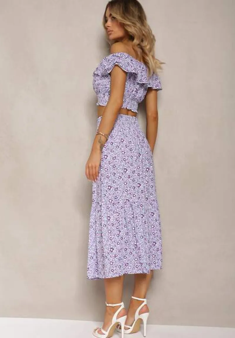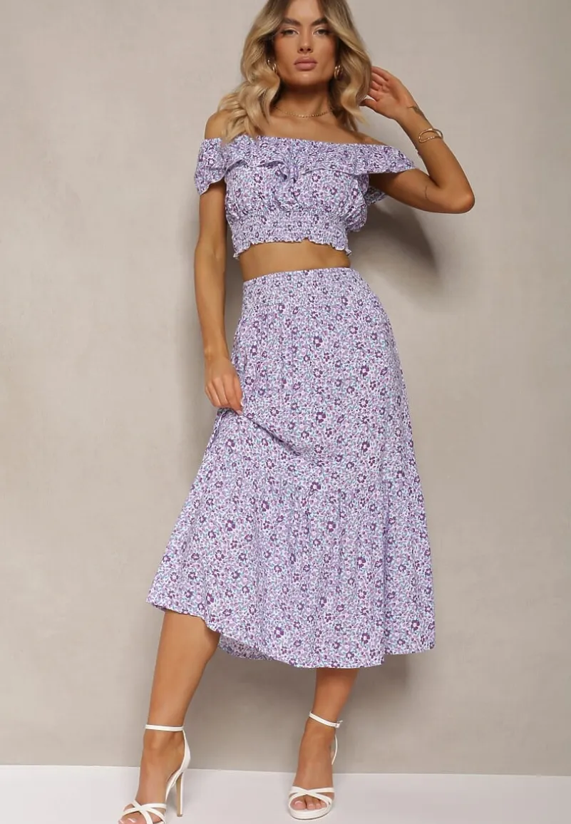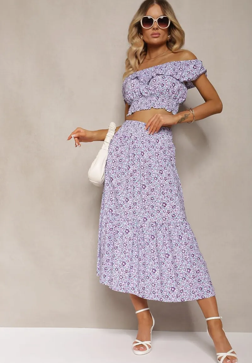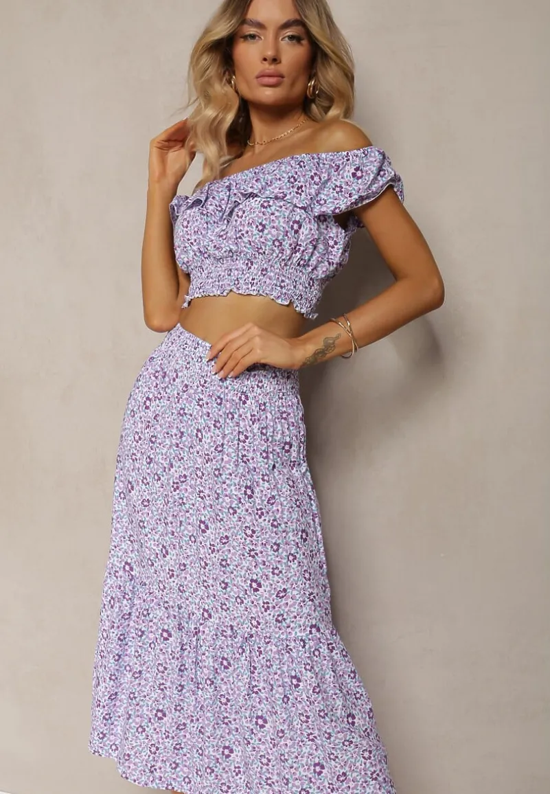 Modny komplet w kwiaty z letniej kolekcji, składający się z topu hiszpanki i spódnicy midi z gumką w pasie.
