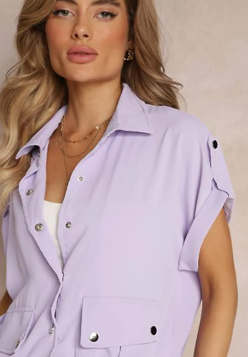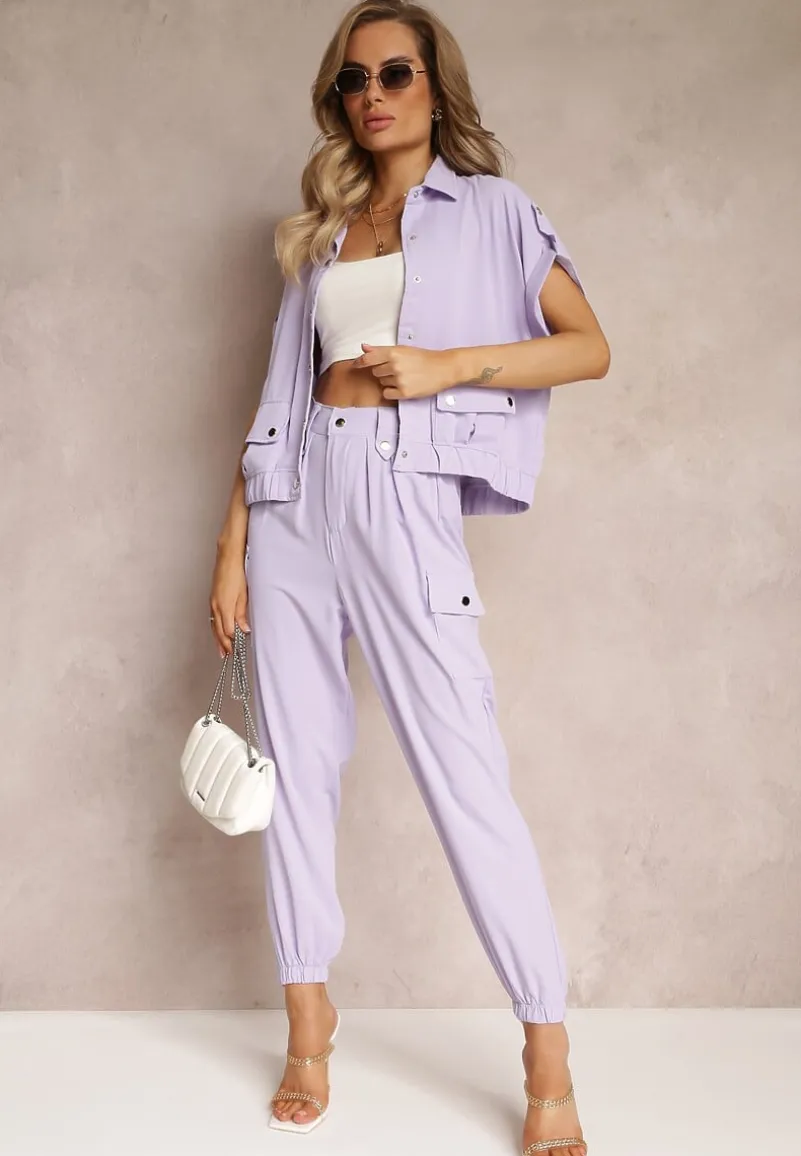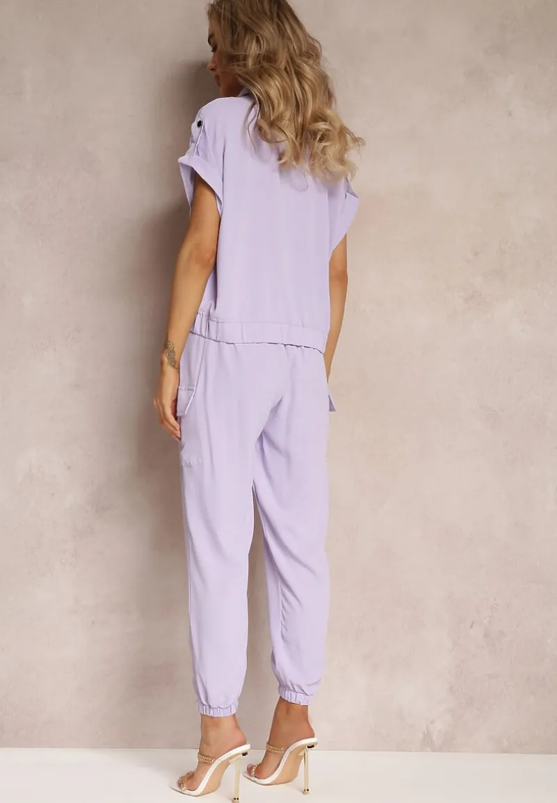 Dwuczęściowy Komplet Ezrala składający się z bluzki oraz spodni. Bluzka zapinana z przodu na napy, dół zakończony lekko marszczoną gumką. Dodatkowo zdobiona kieszeniami z klapą. Spodnie do zestawu z gumką w pasie i na dole nogawek. Zapinane na guzik i suwak. Po bokach naszyte kieszenie z klapami.