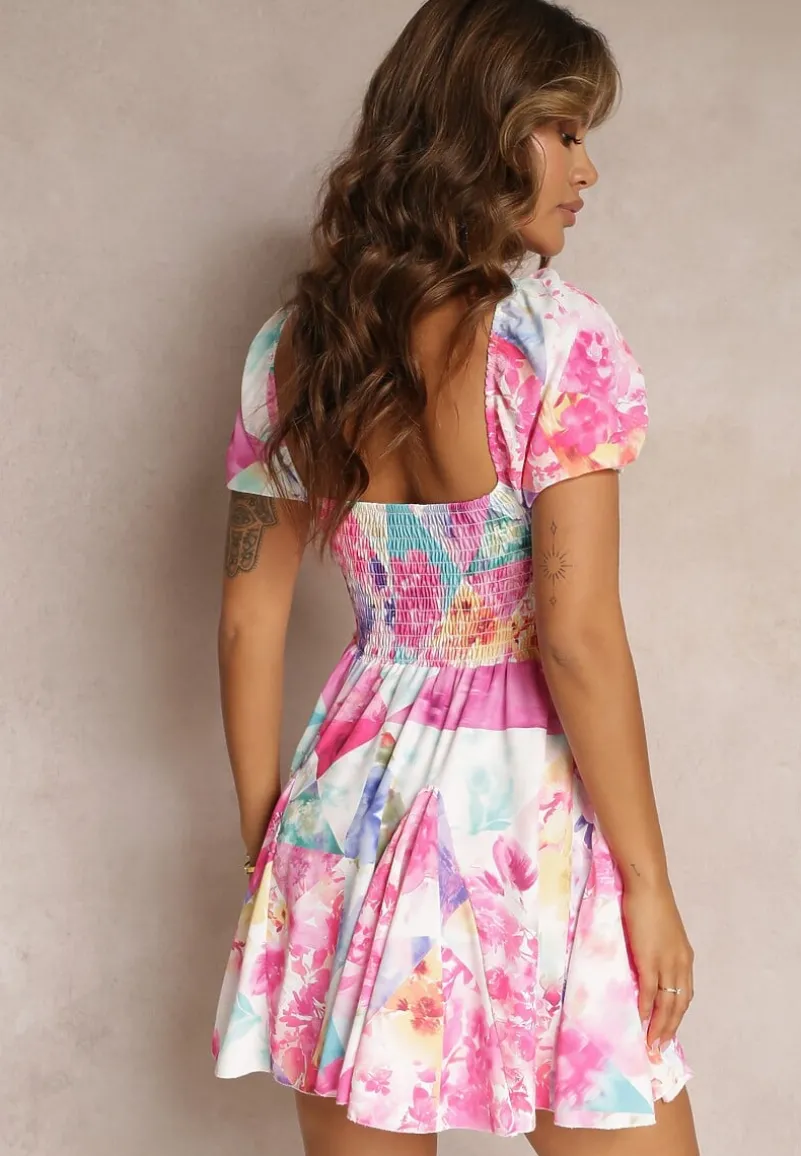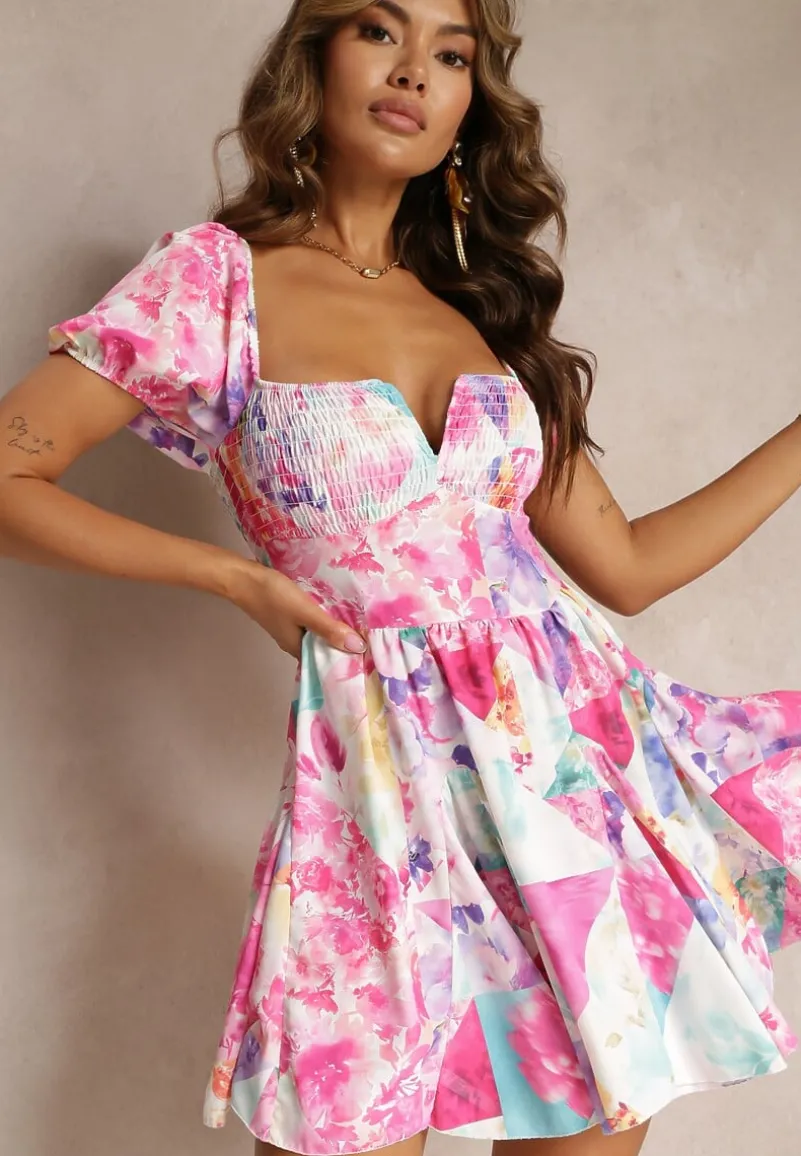 Rozkloszowana sukienka Evelilles w kwiatki. Wykonana z gładkiej tkaniny. Model z krótkimi rękawami o długości mini. Wyróżnia się gumkami wszytymi w górnej części oraz głębokim wycięciem przy dekolcie. Nie posiada podszewki. Doskonale wygląda w duecie z klapkami czy sandałami na obcasie.