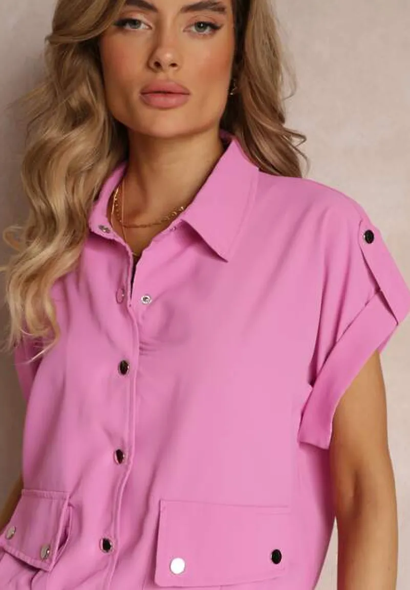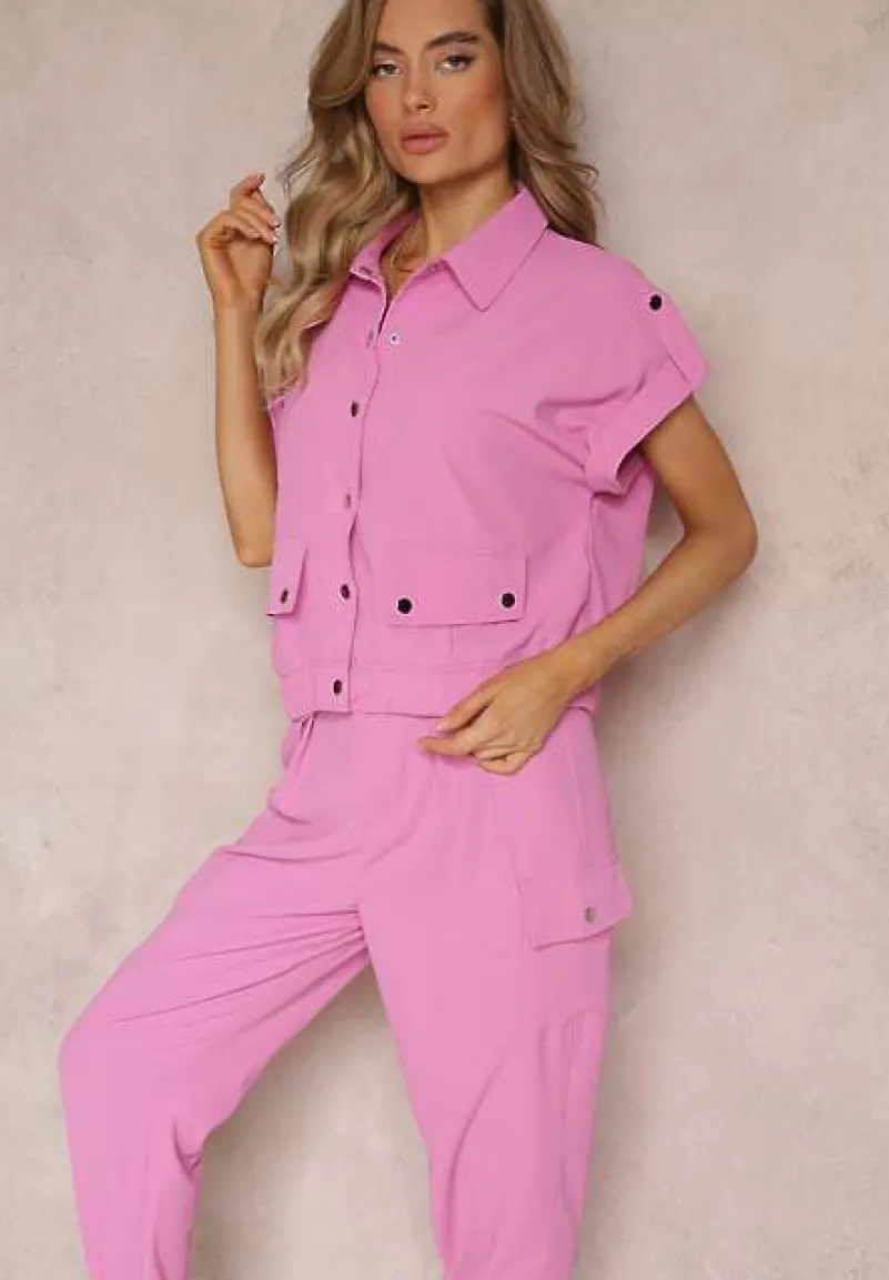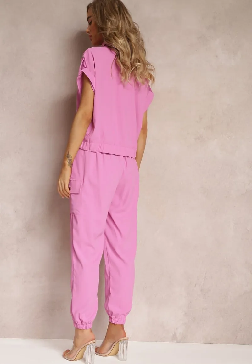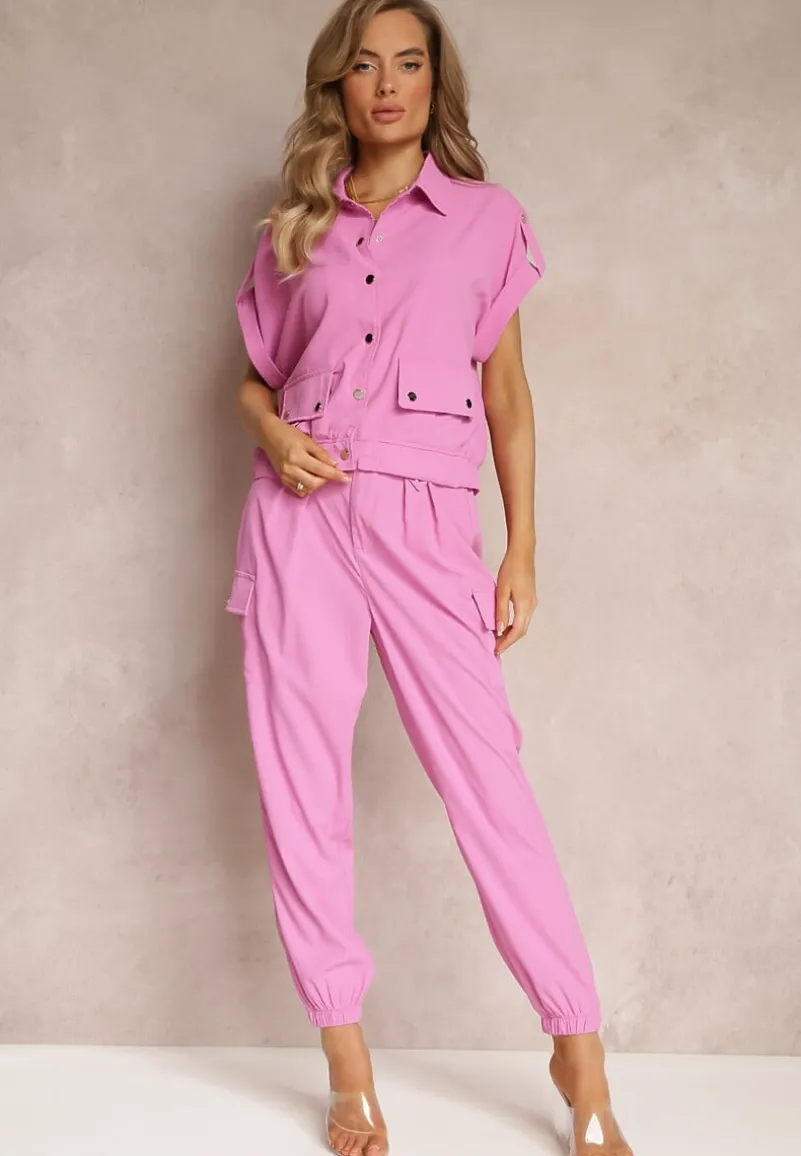 Dwuczęściowy Komplet Ezrala składający się z bluzki oraz spodni. Bluzka zapinana z przodu na napy, dół zakończony lekko marszczoną gumką. Dodatkowo zdobiona kieszeniami z klapą. Spodnie do zestawu z gumką w pasie i na dole nogawek. Zapinane na guzik i suwak. Po bokach naszyte kieszenie z klapami.