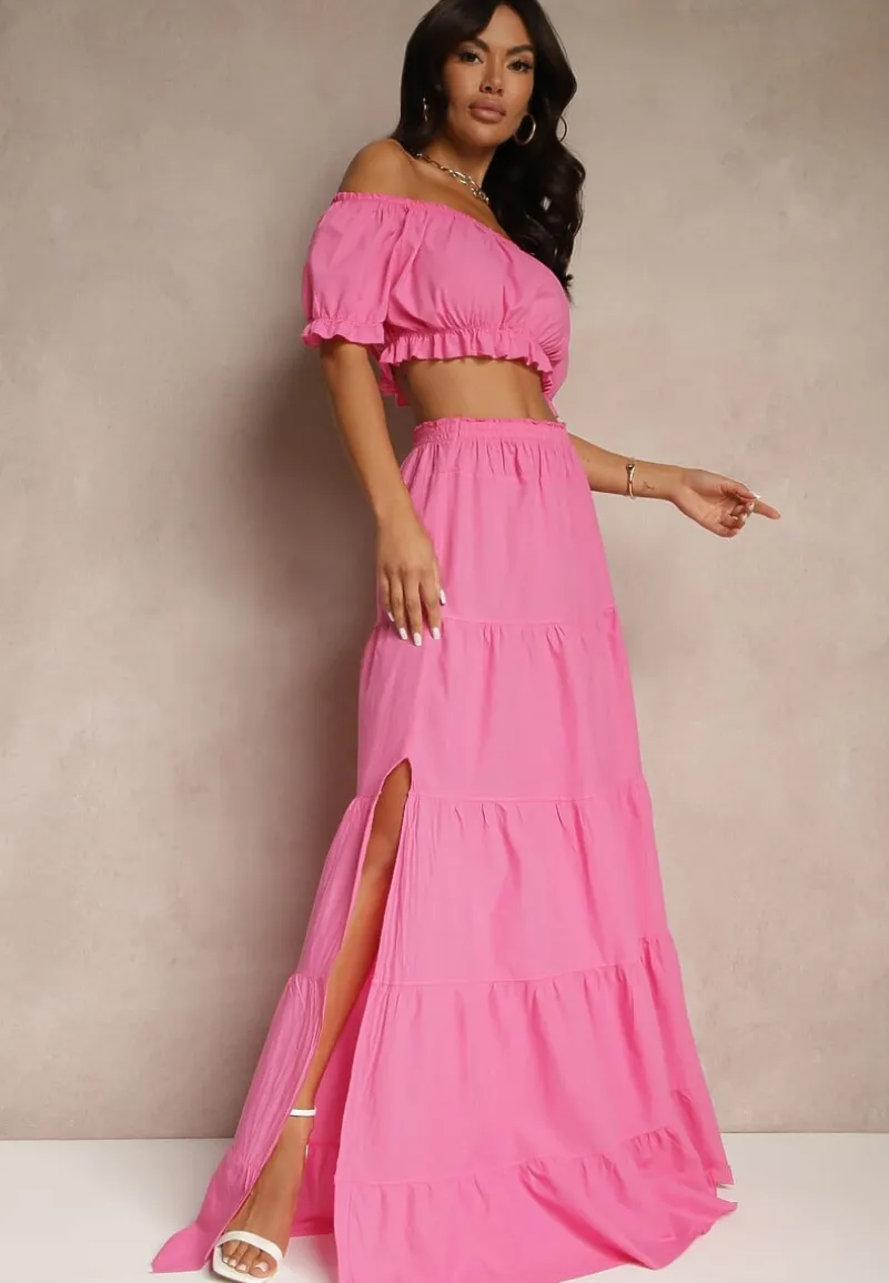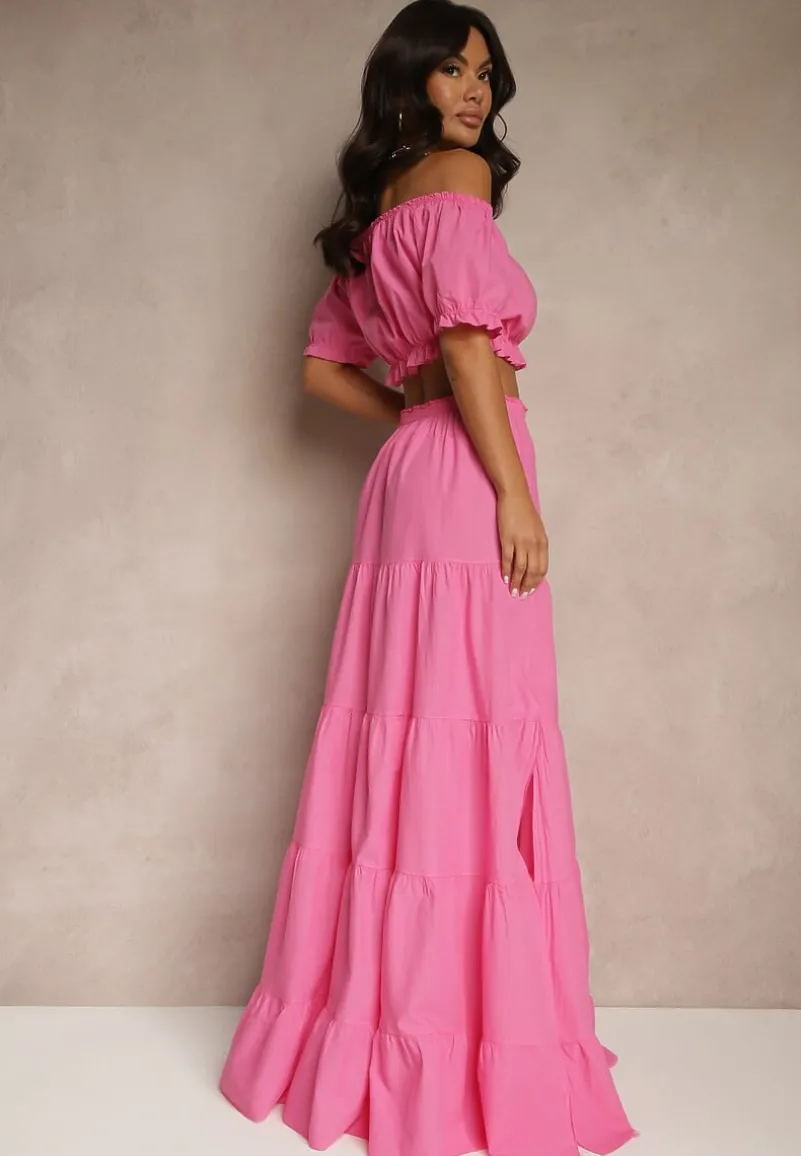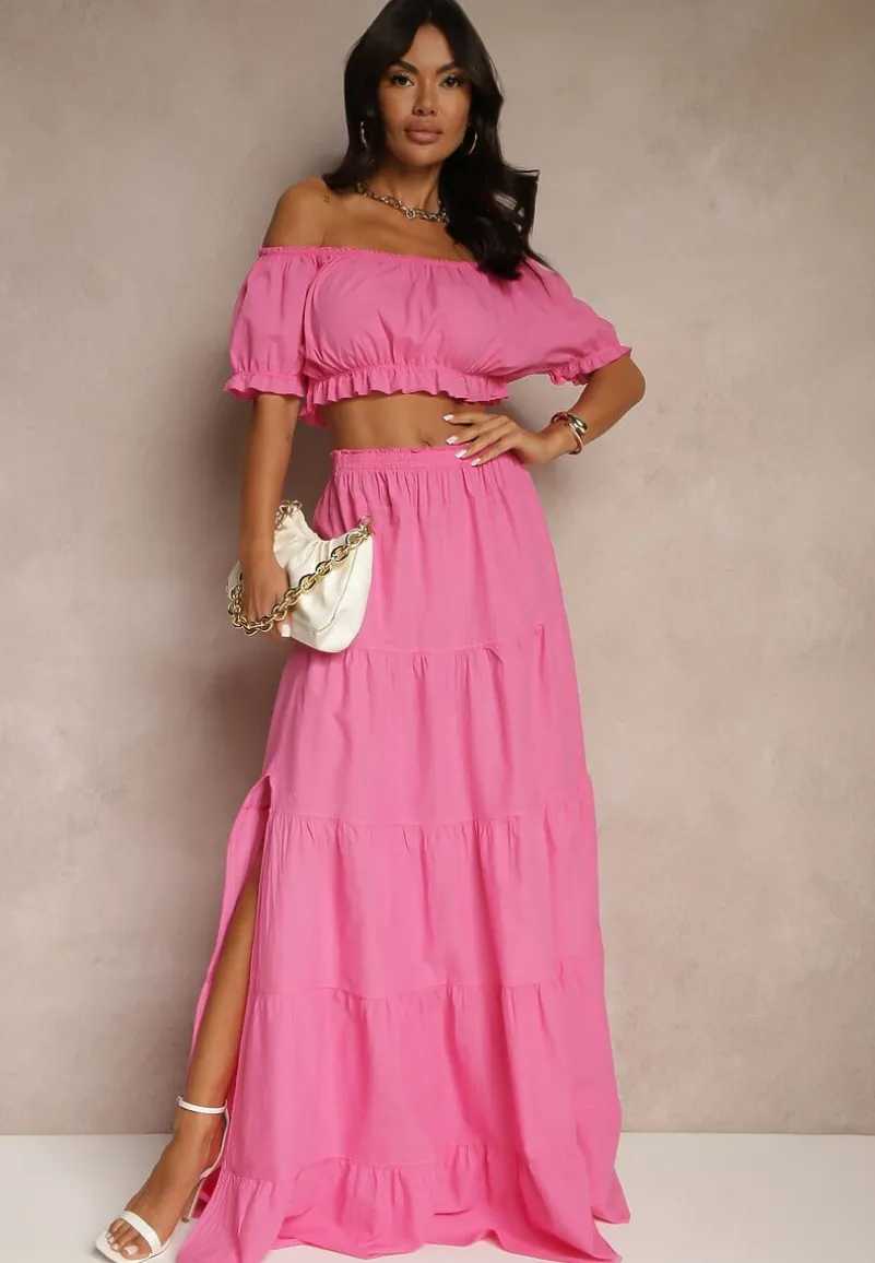 2-częściowy komplet Avasa, który świetnie sprawdzi się w letnich stylizacjach. Wykonany w 100% z wiskozy. Góra to uroczy top z hiszpańskim dekoltem. Dół to długa spódnica z gumką w talii, falbanką i rozcięciem.