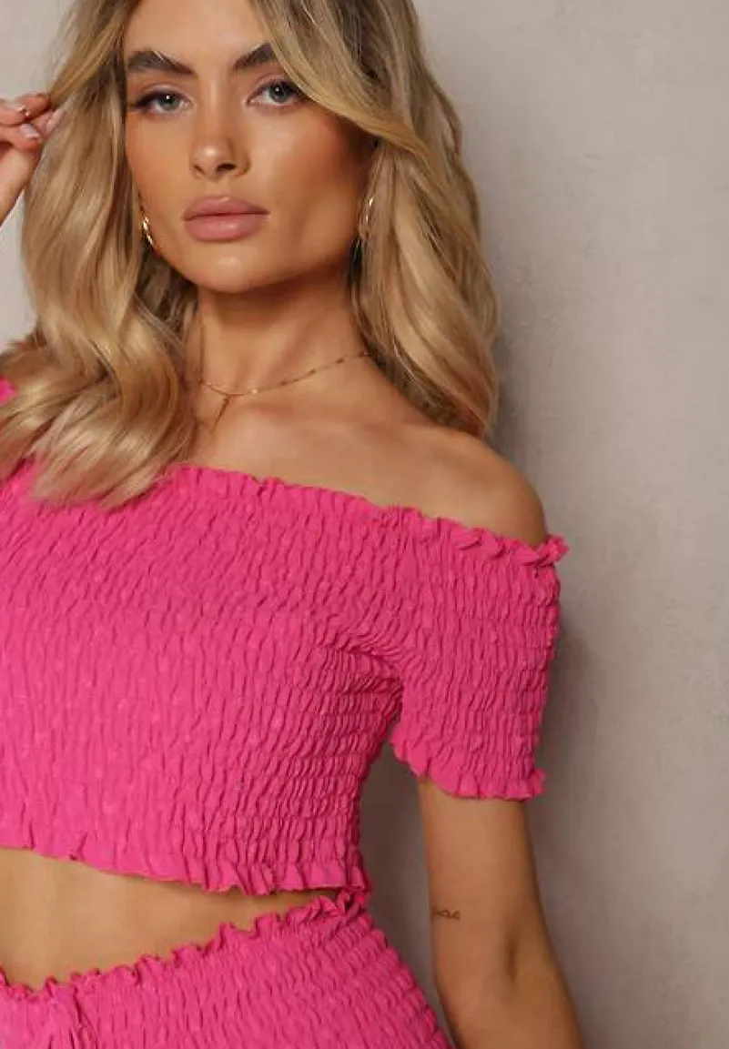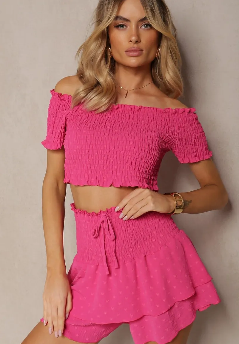 Komplet Rinaria to kwintesencja kobiecości i swobody, idealny na letnie dni i niezapomniane wieczory. Hiszpański dekolt topu i rękaw odkrywający ramiona dodają powiewu świeżości. Spódnico-spodenki z falbanami to synonim swobody ruchów i modnego designu. Tworząc zestaw z sandałkami na obcasie i delikatną biżuterią, podkreślisz romantyczny charakter stylizacji, natomiast połączenie z trampkami i jeansową kurtką sprawdzi się na casualowe wyjścia z przyjaciółmi.