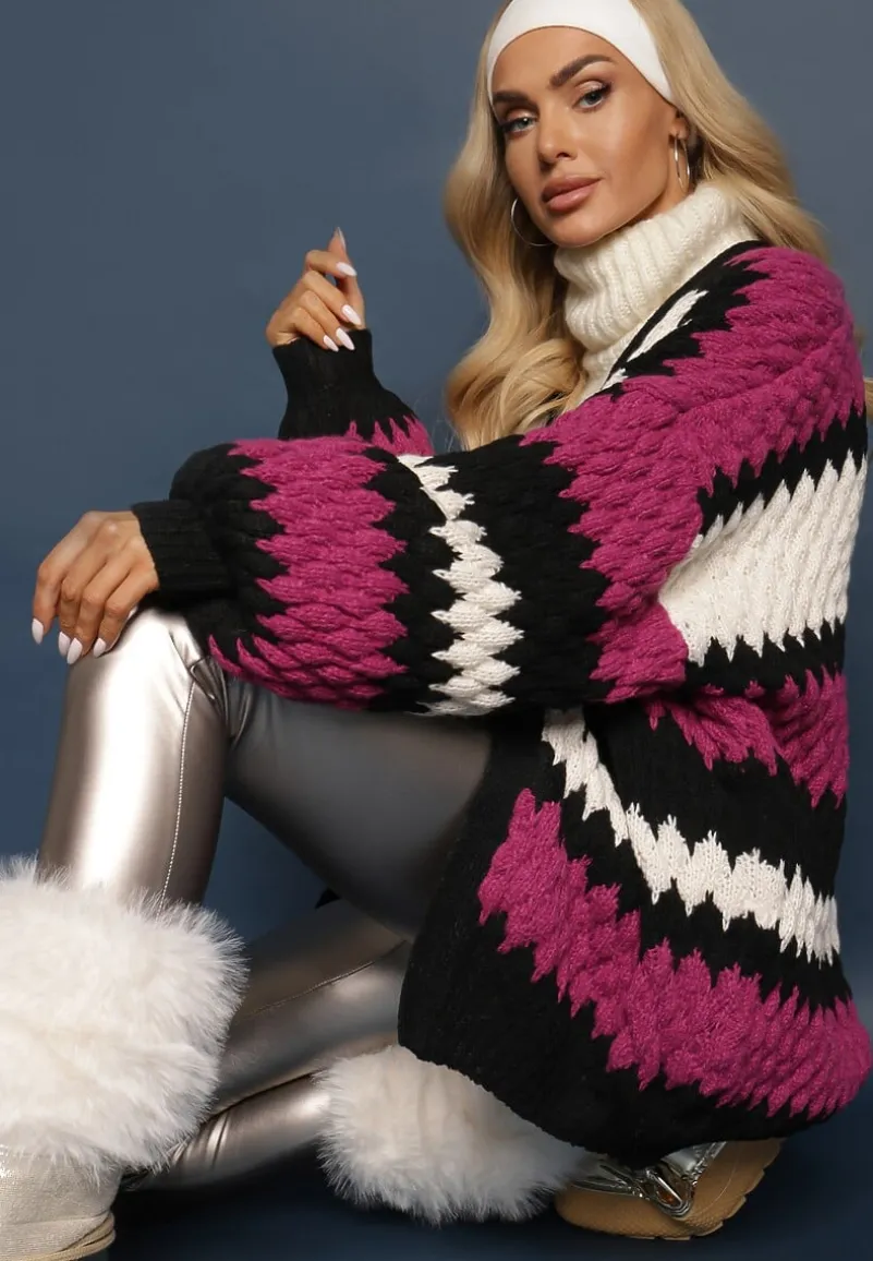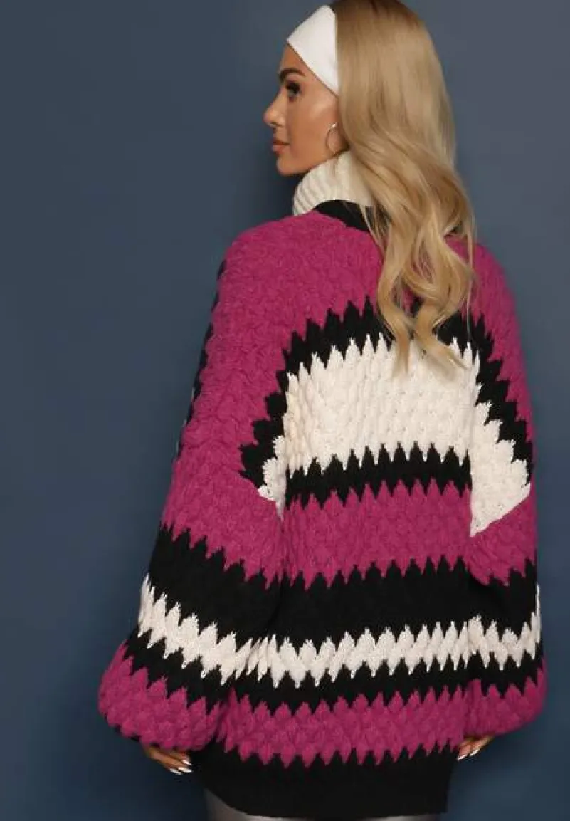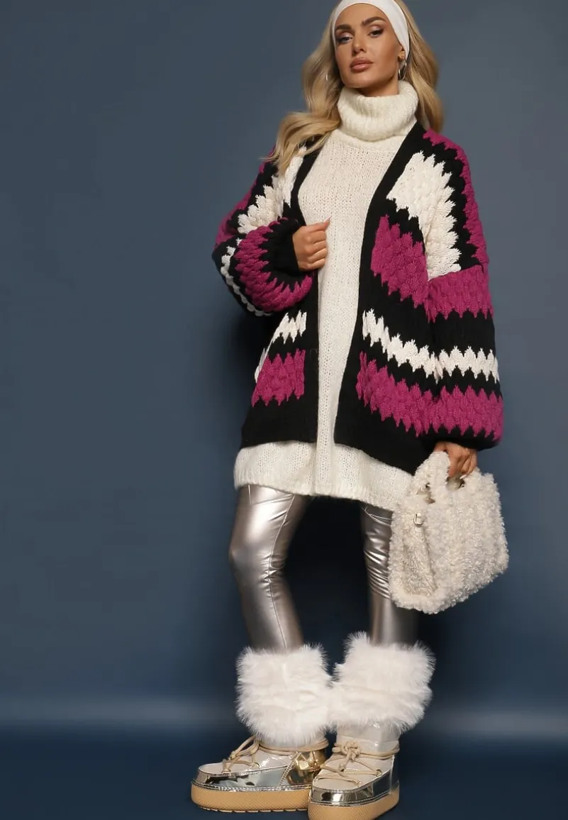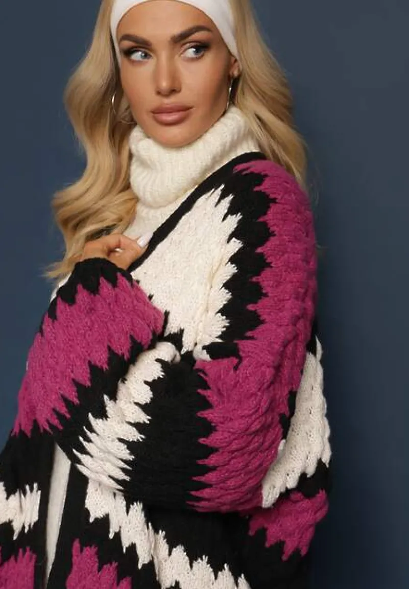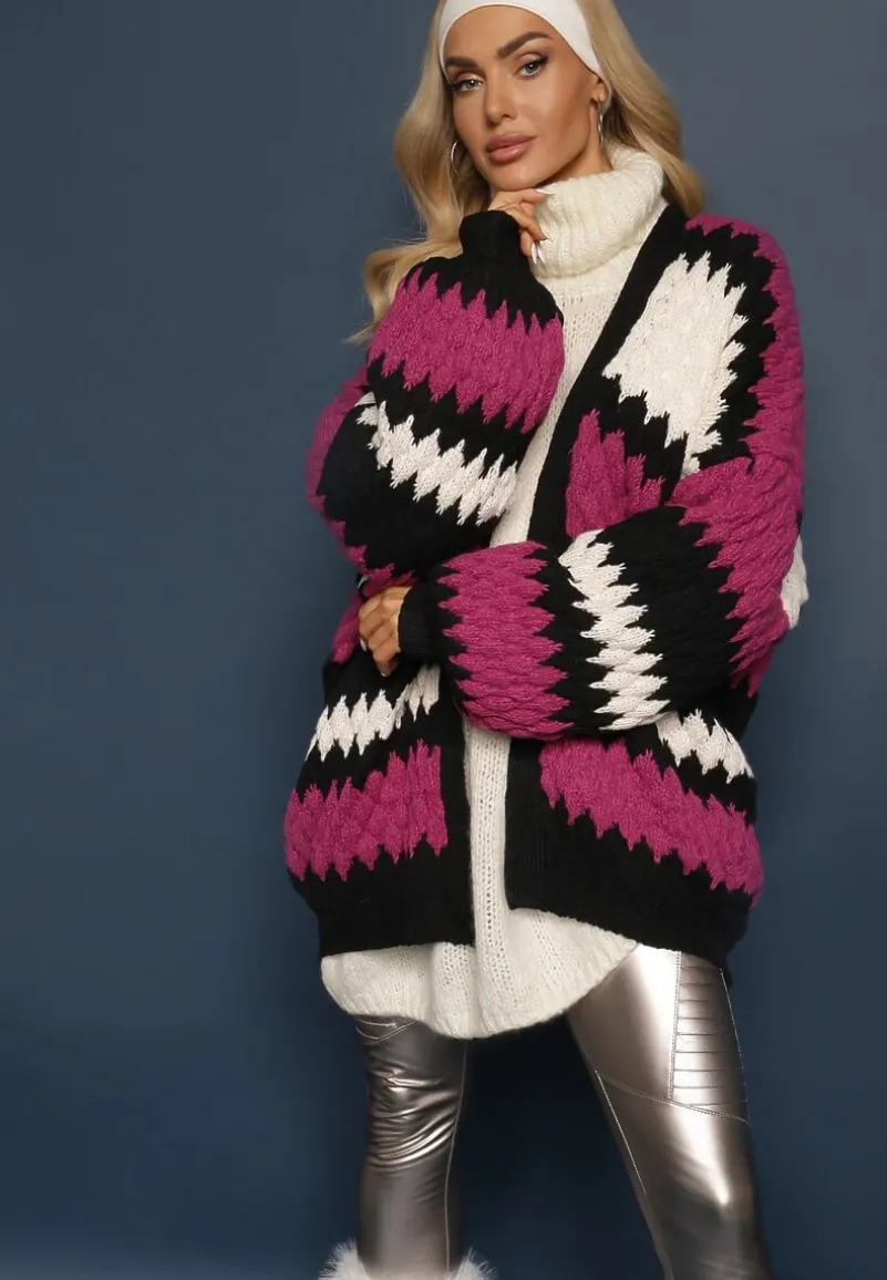 Kardigan Adocca o niezapinanym i luźnym fasonie. Wykonany z dzianinowej tkaniny w fantazyjne paski.