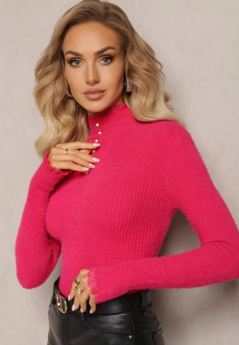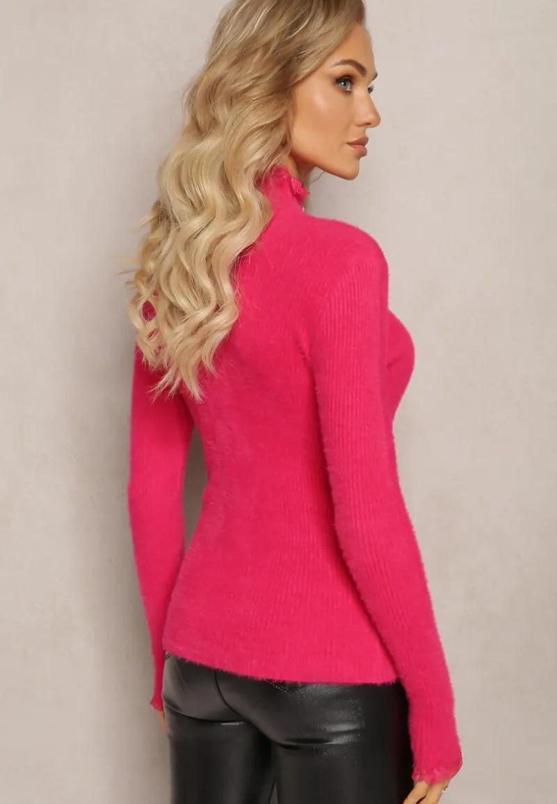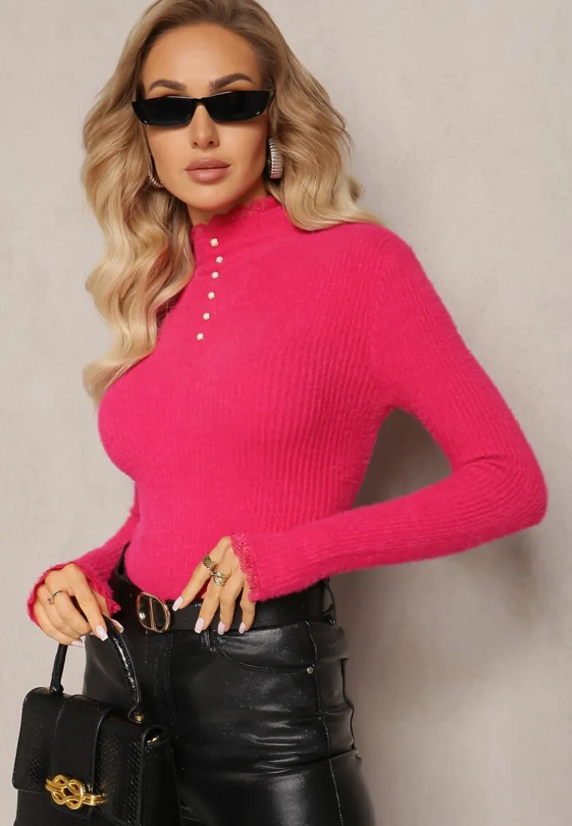 Golf Hejsunna z długim rękawem, wykonany z prążkowanej dzianiny z wełną. Dekorowany z przodu guzikami oraz koronkową tasiemką.