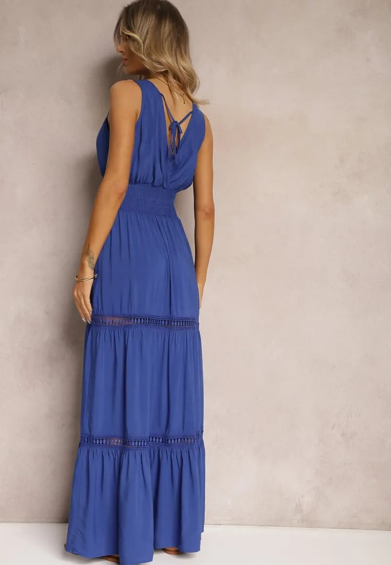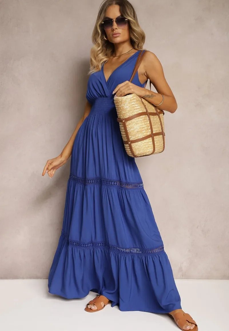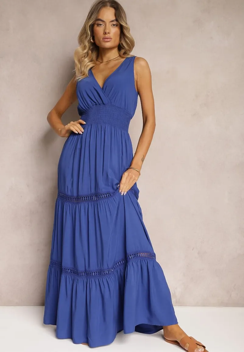 Sukienka Corisis z głębokim, kopertowym dekoltem w kształcie trójkąta, na szerokich ramiączkach. Długość maxi, u dołu wstawki z ażurowej tasiemki. W pasie dekoracyjne marszczenie tworzone przez ściągacze. Bez podszewki. Jednokolorowa sukienka będzie idealna do total looków! Szerokość gumki w pasie po naciągnięciu materiału wynosi: S = 99 cm, M = 105 cm.