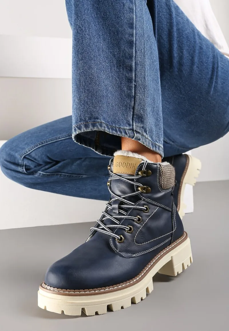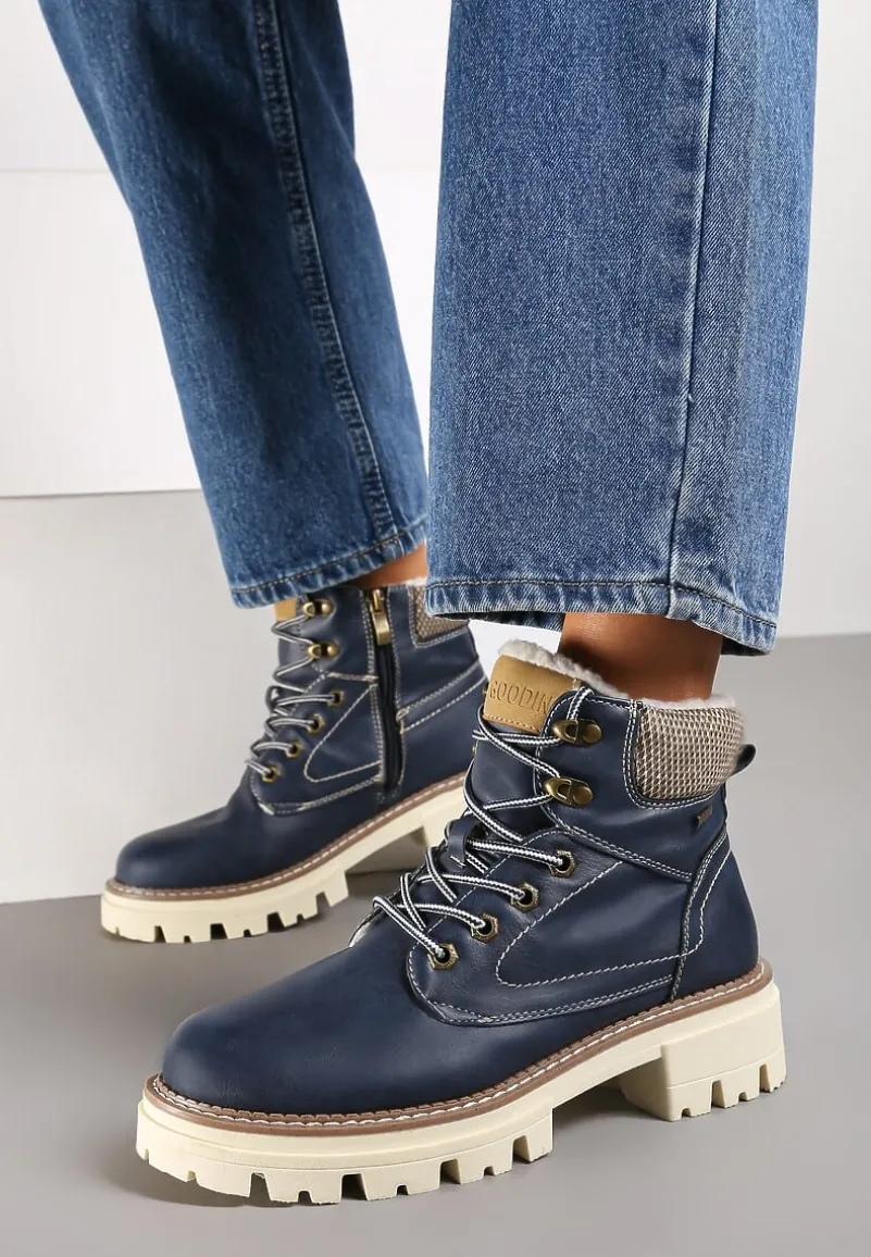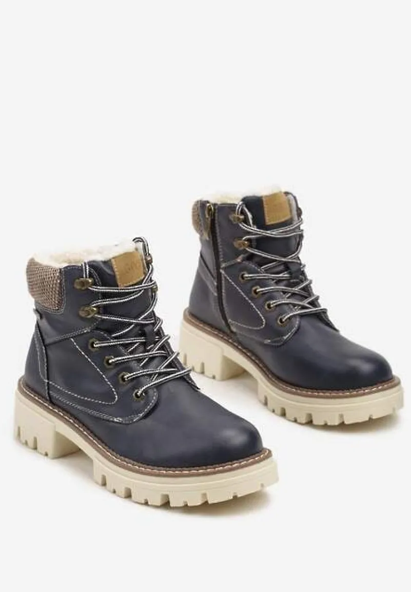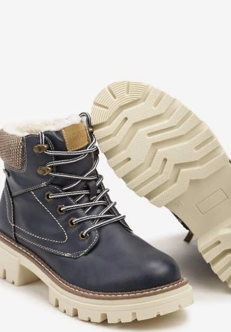 Traperki Sige z cholewką za kostkę, z przodu sznurowane. Dodatkowo po wewnętrznej strony zamek błyskawiczny. Przy wiązaniu ozdobne, metalowe zaczepy na sznurówkę. Osadzone na grubej podeszwie ze stabilizującym protektorem, dekorowana wokół drobną tasiemką z nadrukiem. Wykonane z nubuku syntetycznego, z tyłu materiałowa wstawka. Środek mocno ocieplany imitacją futerka. Idealne w towarzystwie kurtki puffer lub zimowego płaszcza!