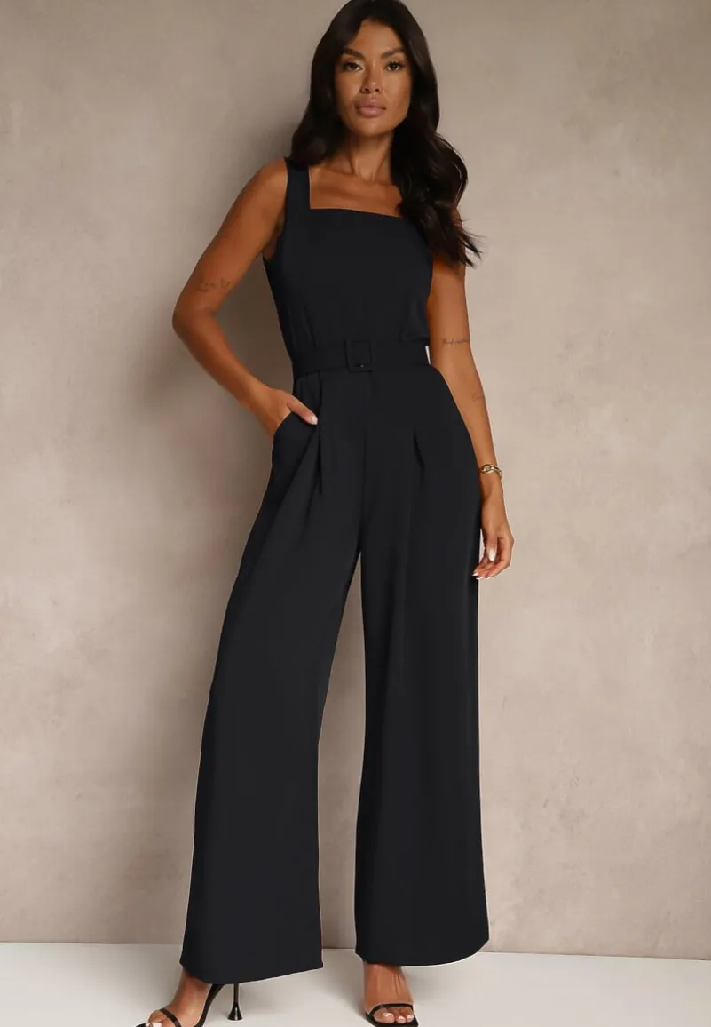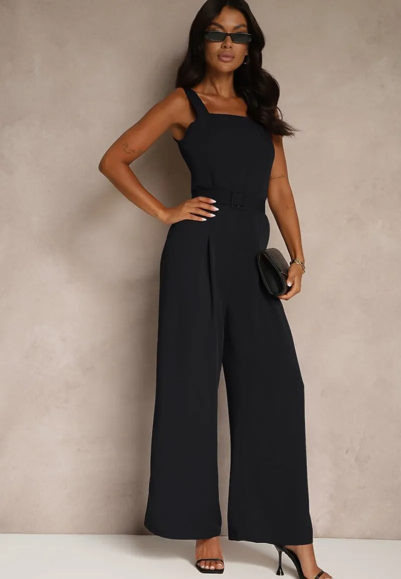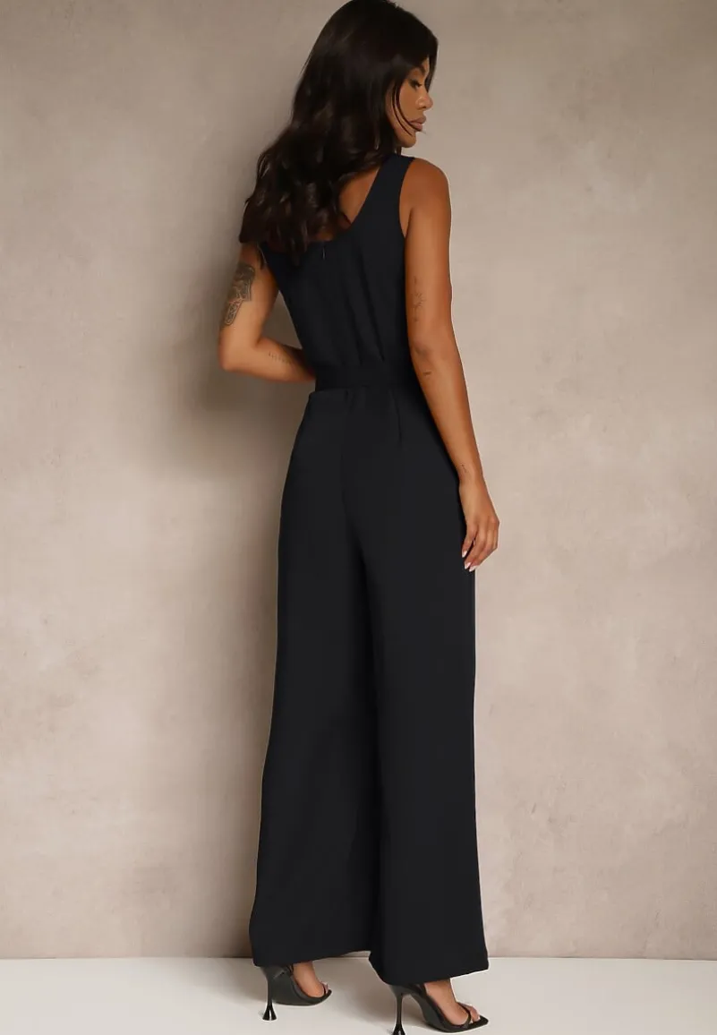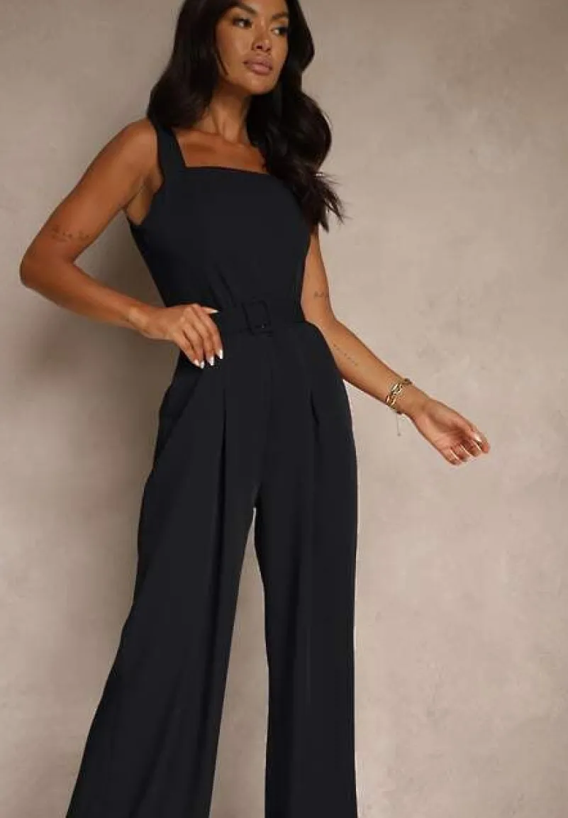 Granatowy Elegancki Kombinezon Ozdobiony Paskiem z Klamrą Dolanela
