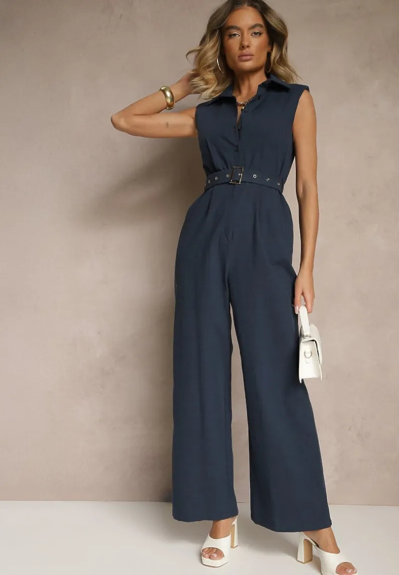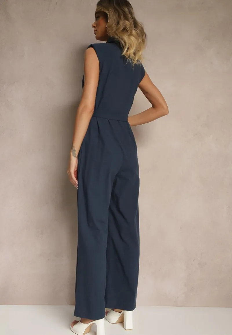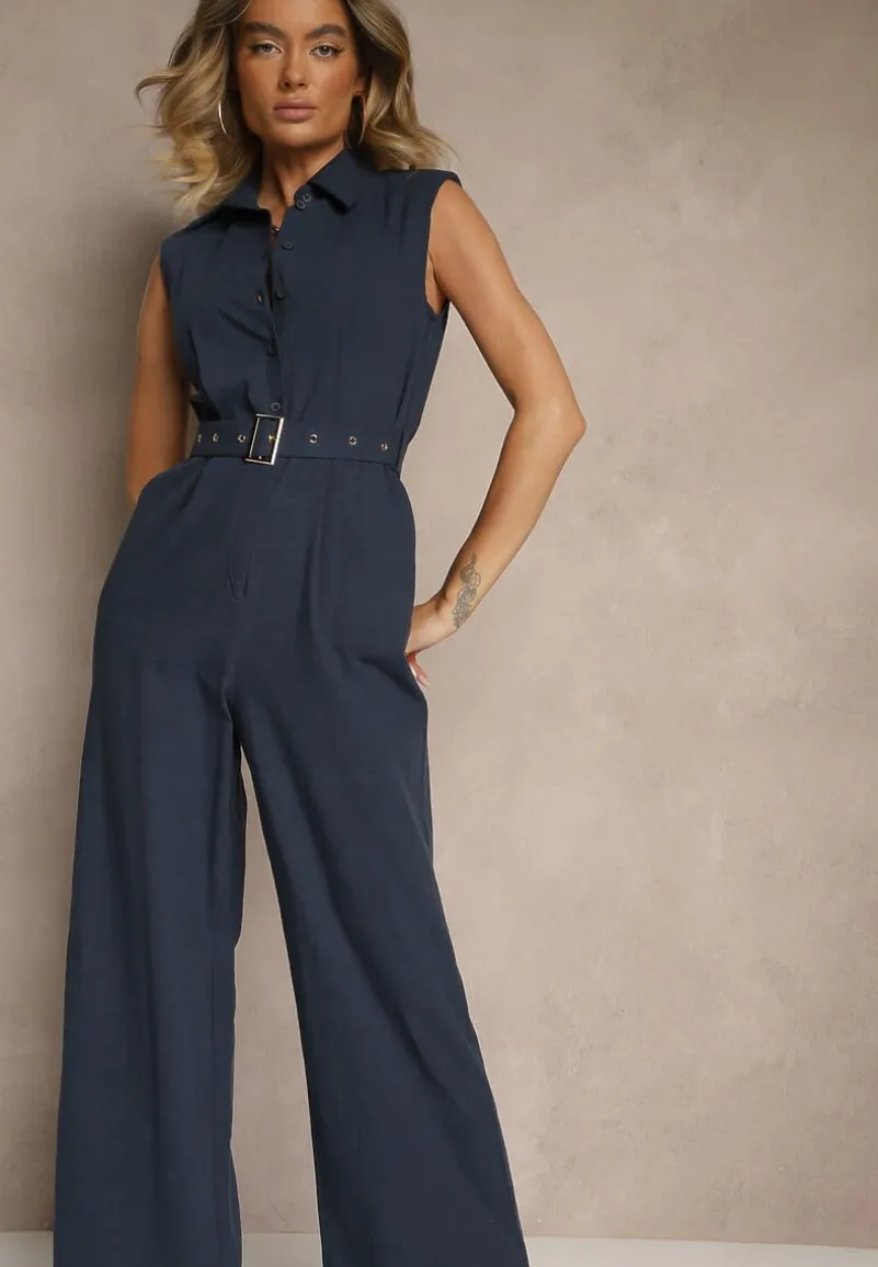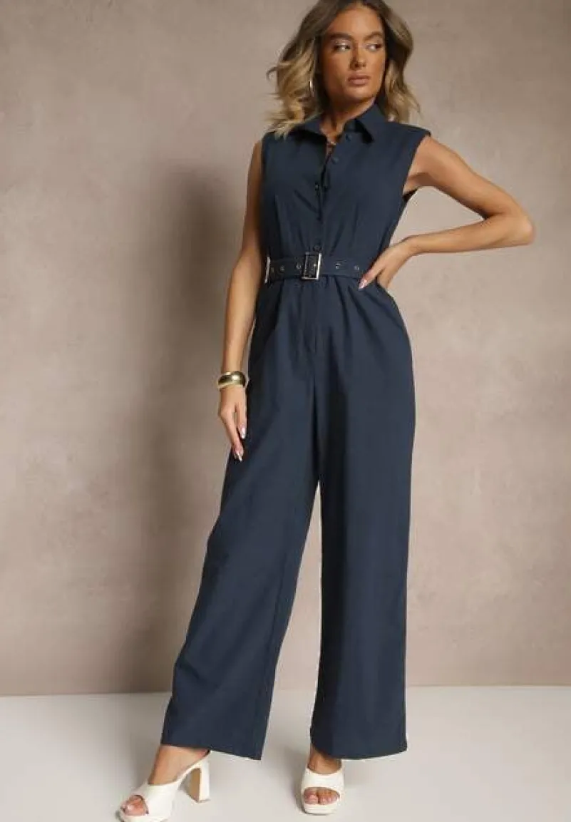 Granatowy Kombinezon z Wiskozą o Taliowanym Kroju z Kołnierzykiem i Paskiem Ravisse