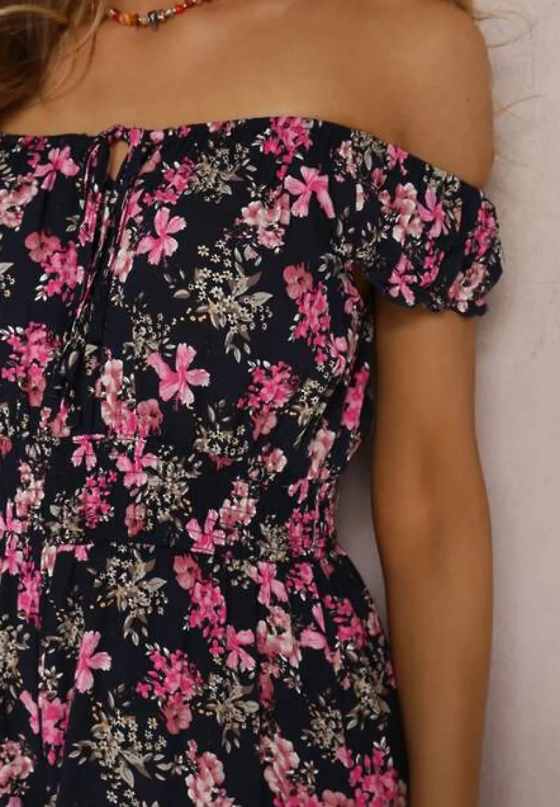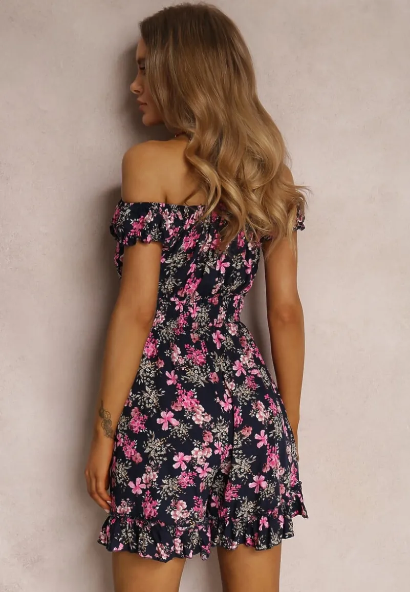 Kombinezon Rumi stylizowany na sukienkę mini. Luźna, krótka nogawka wykończona uroczą falbanką. Głęboki dekolt z elastyczną gumką i wiązaniem z przodu, dzięki czemu możesz go wystylizować. Krótki rękaw. W talii gumka, która podkreśli sylwetę. Wykonany z wiskozy z wzorem w kwiaty. Spróbuj połączyć ten krótki kombinezon z sandałami na obcasie i małą torebką z cyrkoniami.