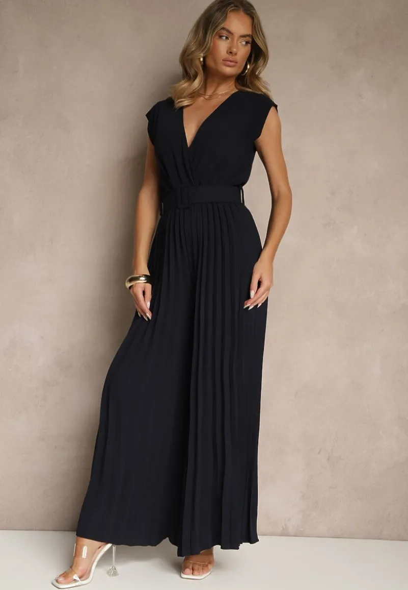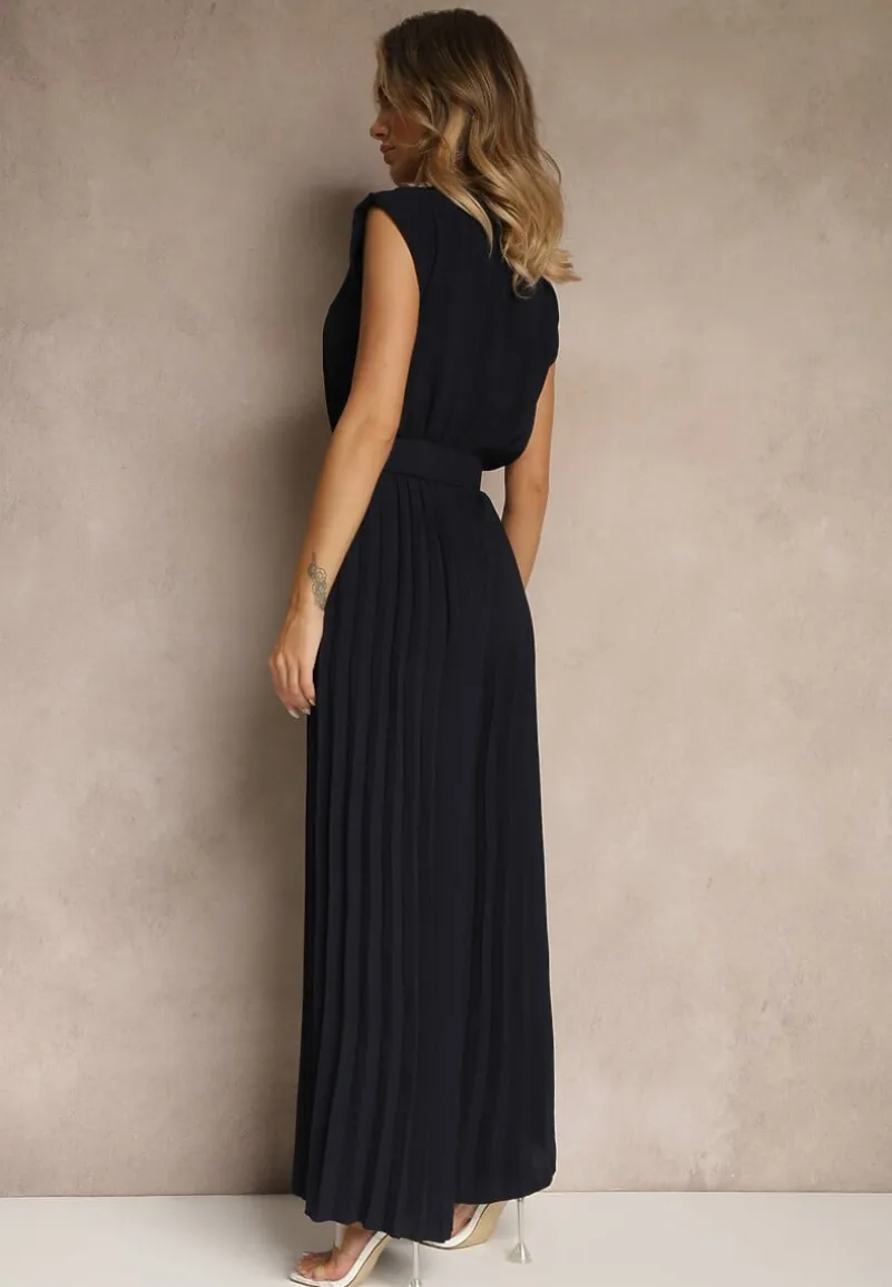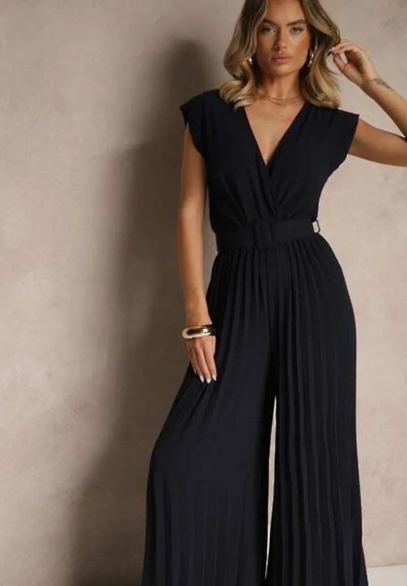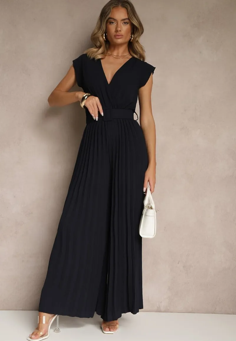 Granatowy Kopertowy Kombinezon Wide Leg Zdobiony Plisami i Paskiem z Klamrą Salirella
