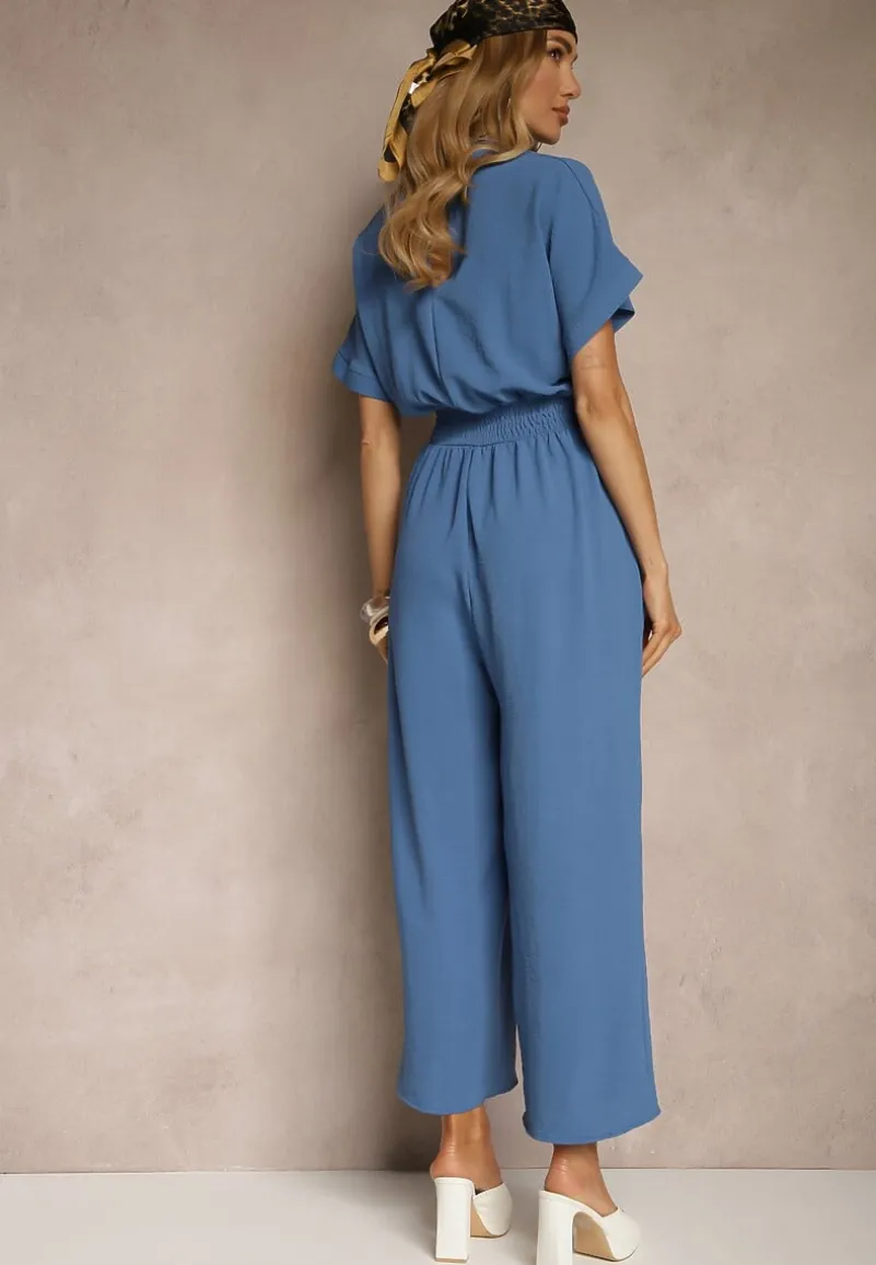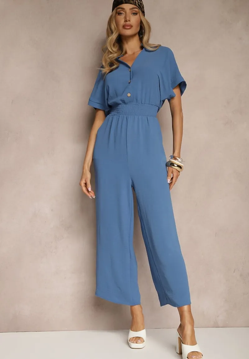 Kombinezon Anisora to niezastąpiony must-have na nadchodzący sezon, który idealnie wpisuje się w najnowsze modowe trendy. Luźna linia z elastyczną gumką w pasie subtelnie podkreśla sylwetkę, a dekolt w serek z eleganckimi guzikami dodaje nonszalancji i szyku. Krótkie rękawy i długie, szerokie nogawki czynią go idealnym wyborem zarówno na codzienne wyjścia, jak i wieczorne spotkania z przyjaciółmi. Stylizuj go z ramoneską i sneakersami na co dzień, a na wieczór postaw na eleganckie szpilki i minimalistyczną biżuterię, aby zachwycić pewnością siebie i wyczuciem stylu. Posiada wsuwane kieszenie.