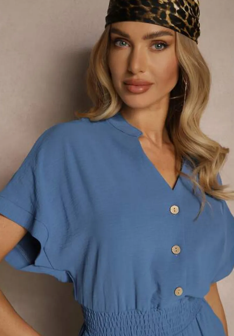 Granatowy Wiskozowy Kombinezon z Dekoltem w Serek Zapinany na Guziki Anisora