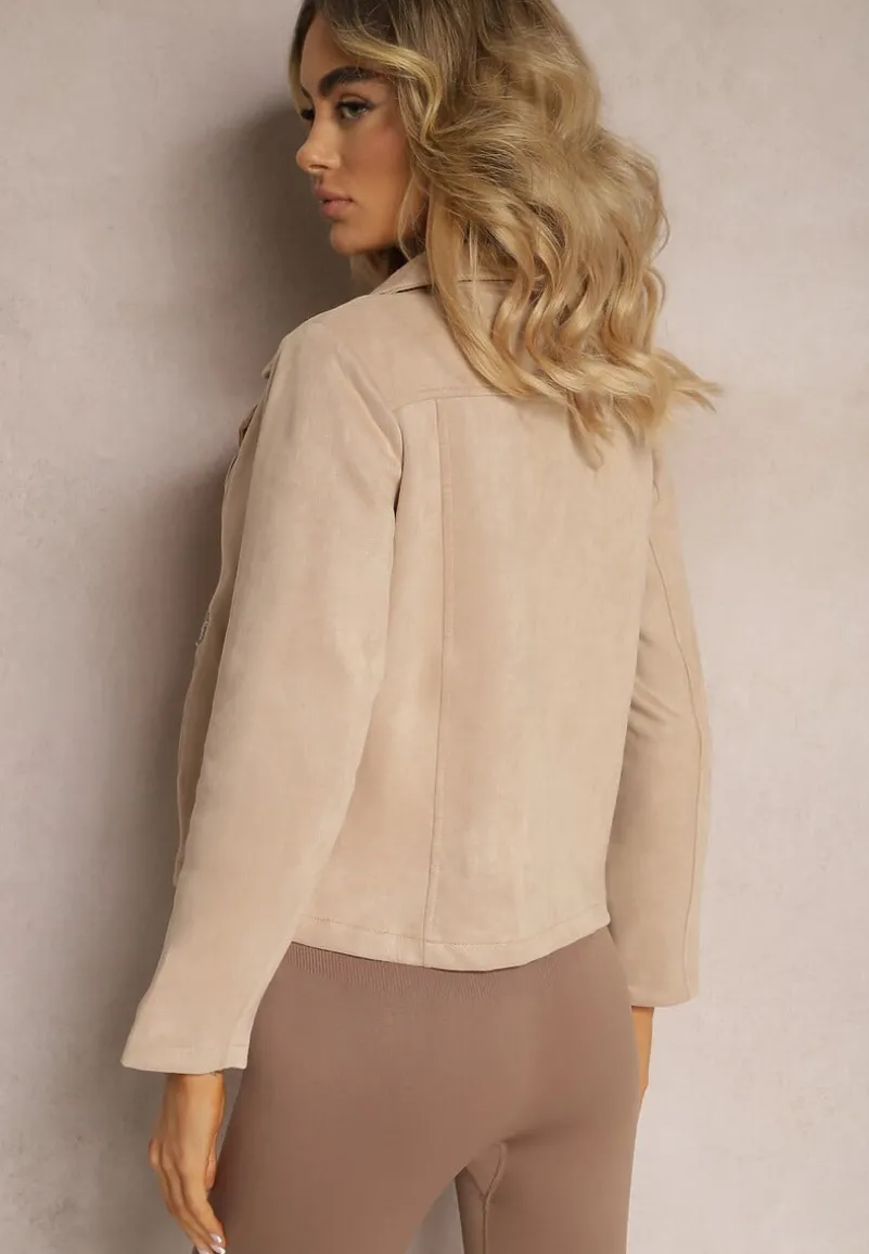 Kurtka Kmiya o asymetrycznym fasonie ramoneski z ekozamszu. Posiada zasuwane kieszonki. Ramoneska z linii plus size, dostępna w większych rozmiarach.