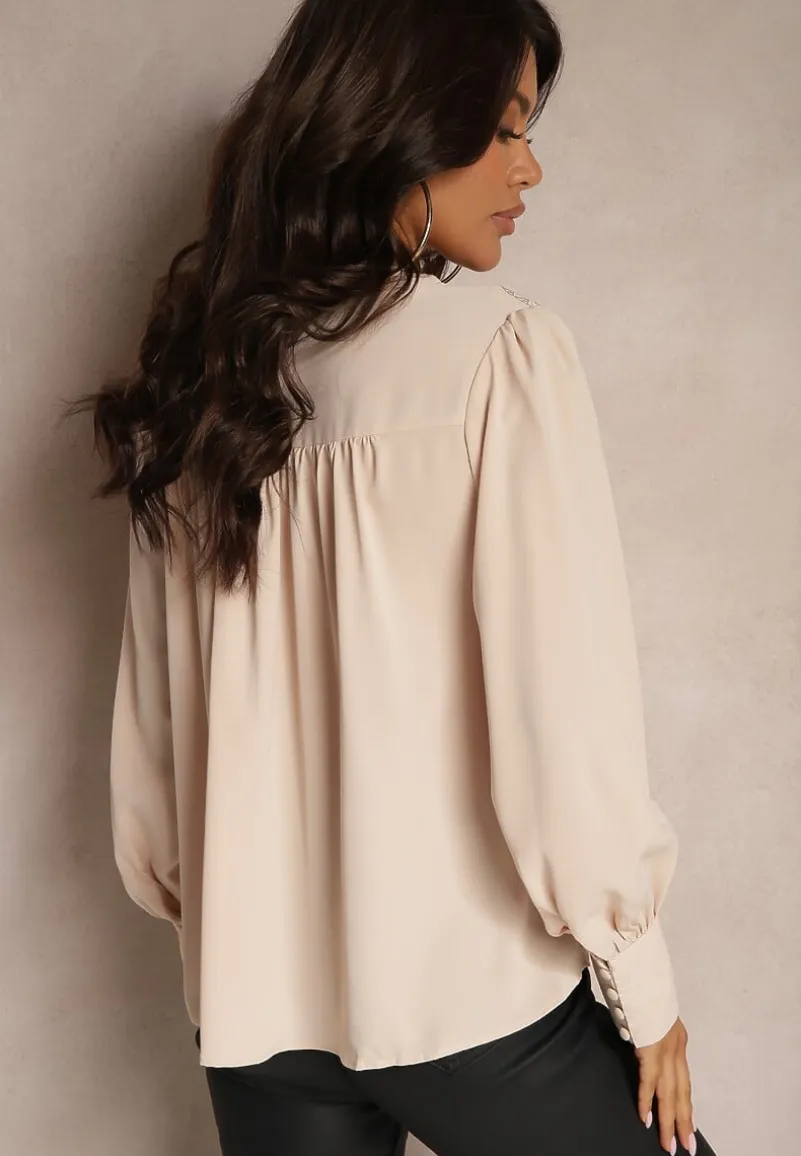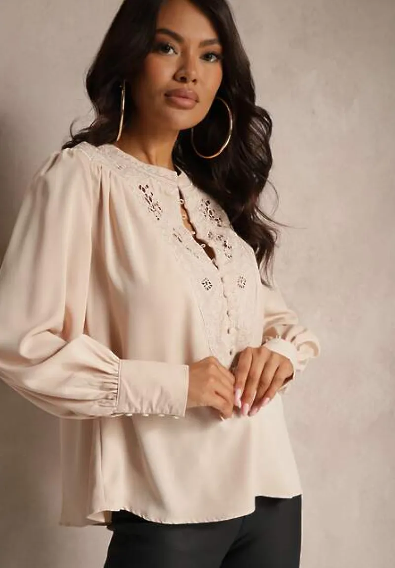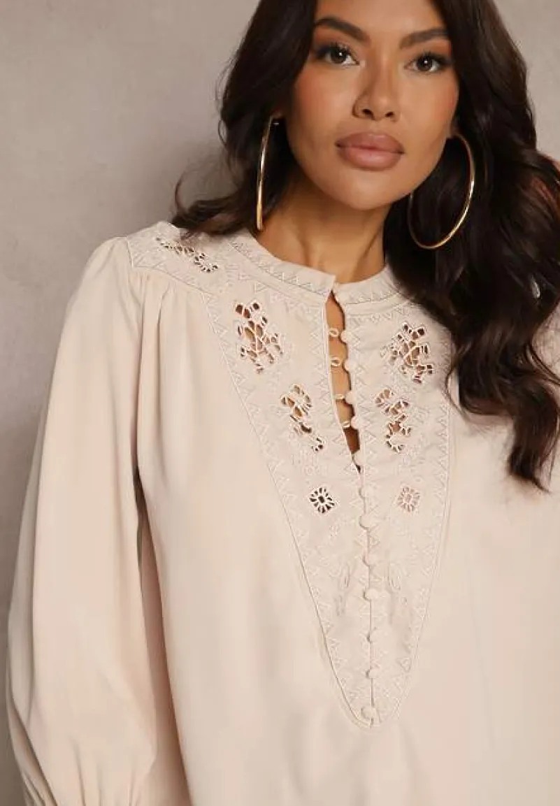 Bluzka Zanya wykonana z tkaniny dekorowanej haftowanymi wstawkami. Zapinana z przodu na rząd guzików przy dekolcie. Płytki, okrągły dekolt. Luźne rękawy zakończone mankietami na guziki.